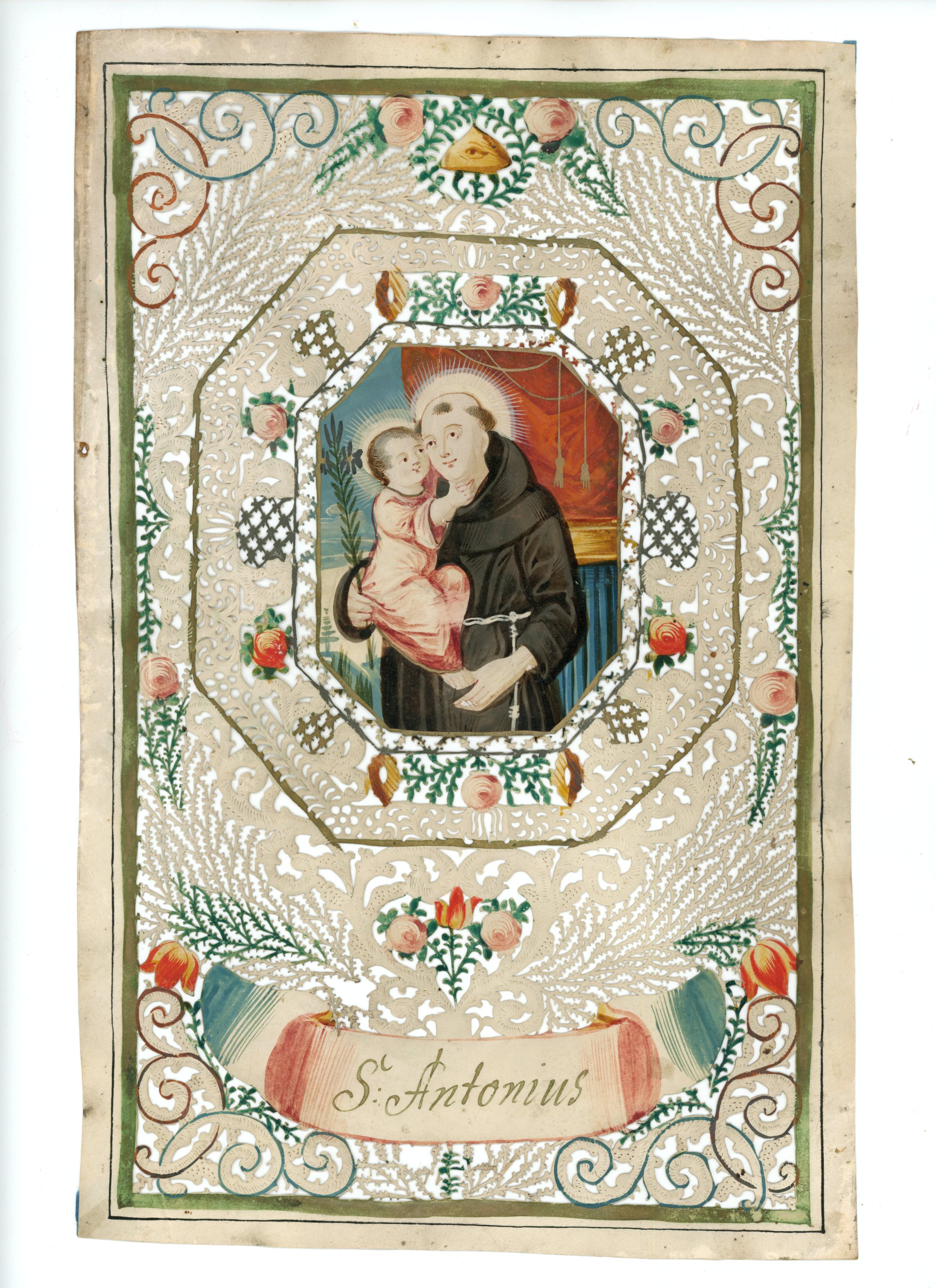- dans un riche décor de découpes de réseau de capillaires, volutes, entrelacs, fleurs peintes, coquilles, se détache un médaillon central octogonal peint cerné d'un filet d'or et d'une guirlande florale. Est représenté Saint Antoine auréolé, vêtu de sa bure franciscaine, tenant contre lui l'Enfant Jésus auréolé et habillé d'une tunique rouge. Cartouche tricolore portant l'inscription en lettres d'or : S. Antonius. 28 x 18 cm. Petits manques.