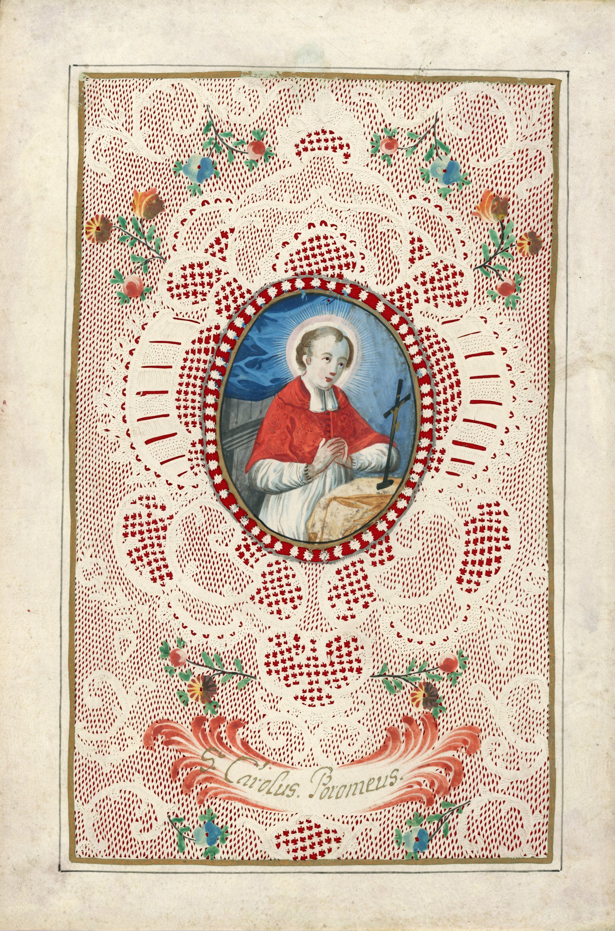 - au centre d'un riche décor de découpes de Valenciennes, au picoté, entrelacs, fleurs peintes, un médaillon représentant Saint Charles Borromée auréolé priant devant la croix, vêtu de ses habits d'évêque. Cartouche frangé de rouge portant pour inscription en lettres dorées : S. Carolus Poromeus. 29,5 x 20 cm. TTB.