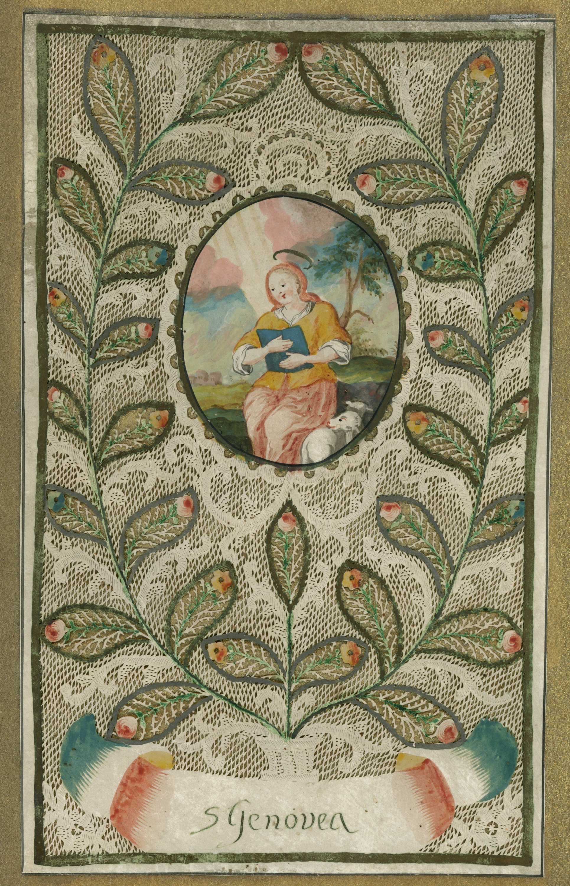 - au centre d'un riche décor de découpes de Valenciennes et d'entrelacs, fleurs et feuillages peints, un médaillon cerné d'or représentant Sainte Geneviève de Paris auréolée, en habit de bergère jaune et rouge, assise près d'un mouton lisant la Bible. Cartouche tricolore portant pour inscription en lettres dorées : S. Genovea. 24 x 15 cm. TTB.