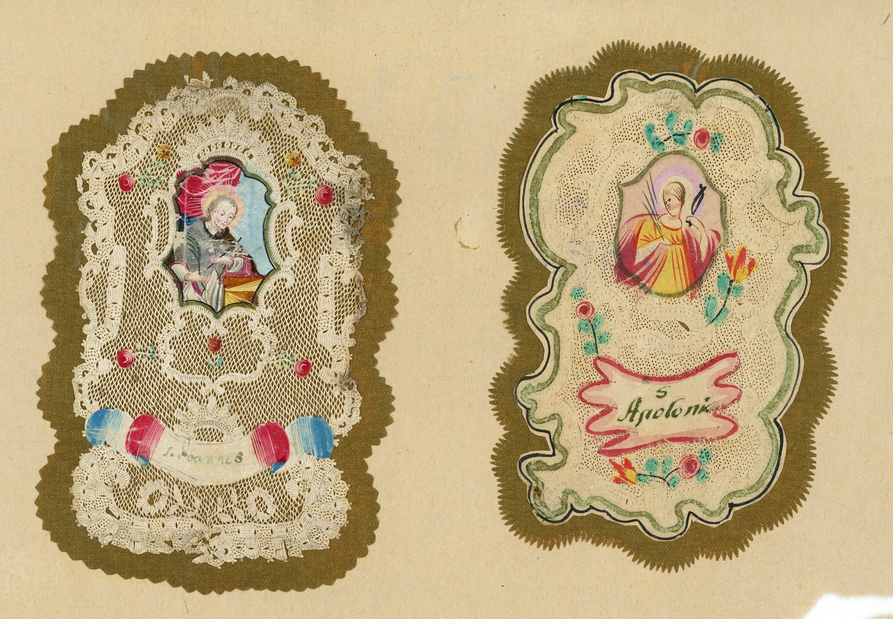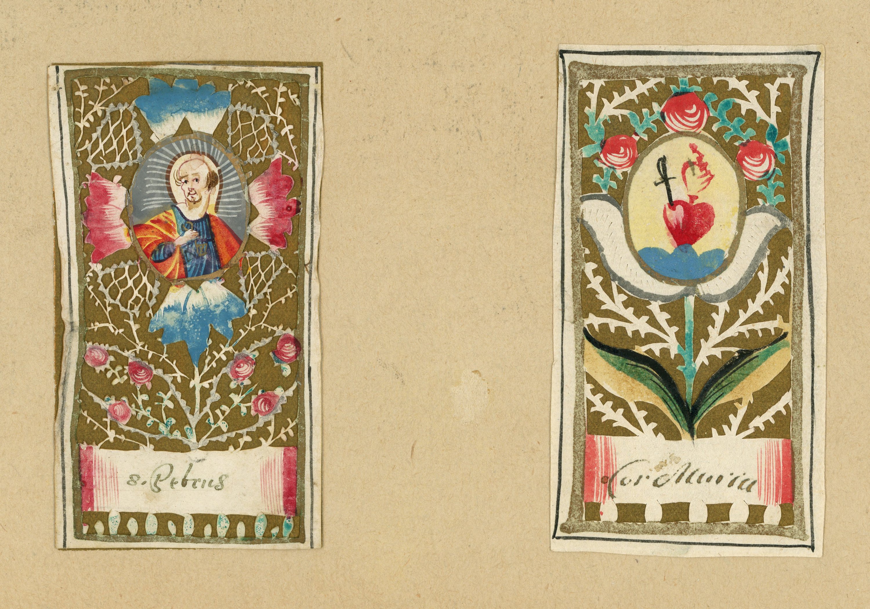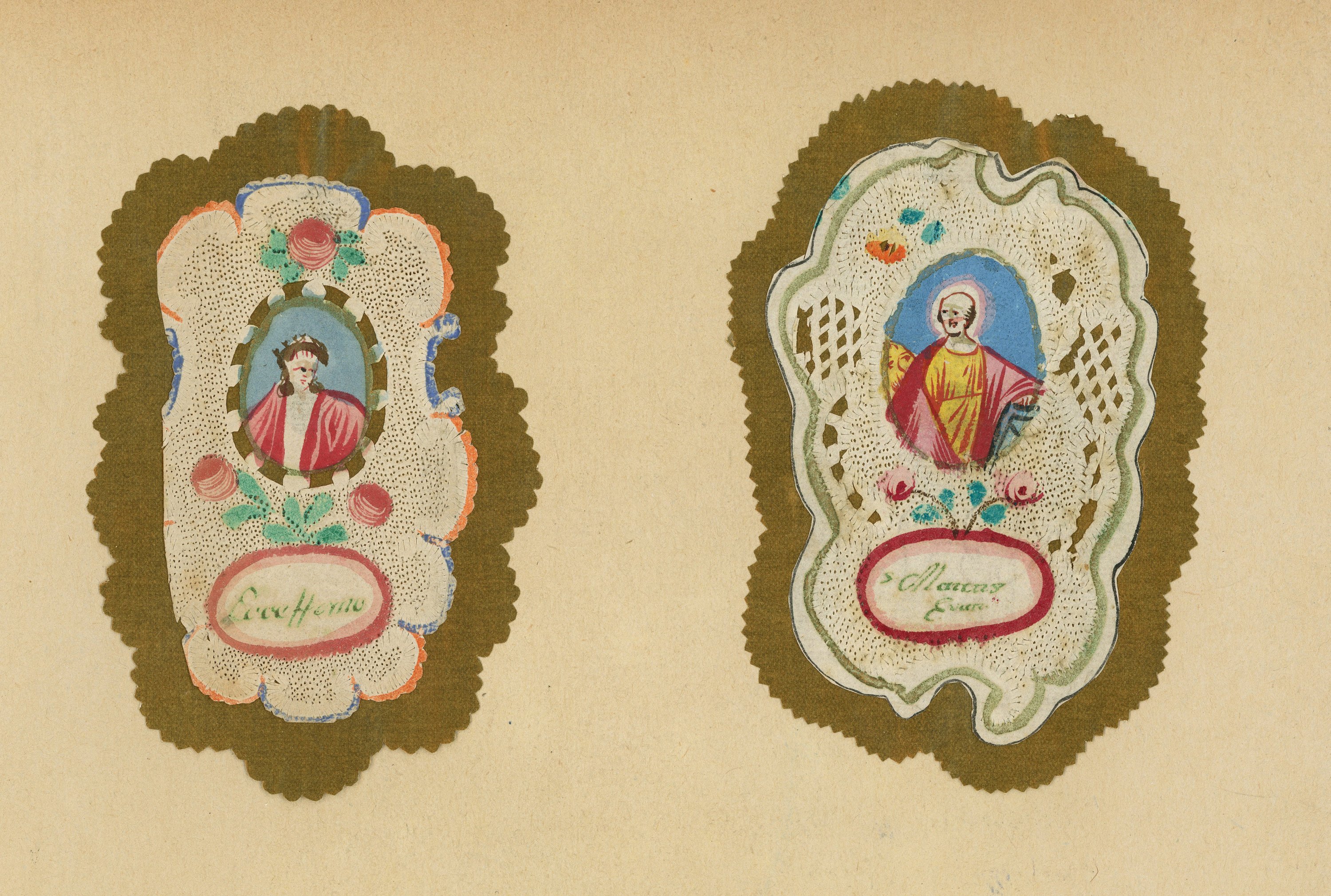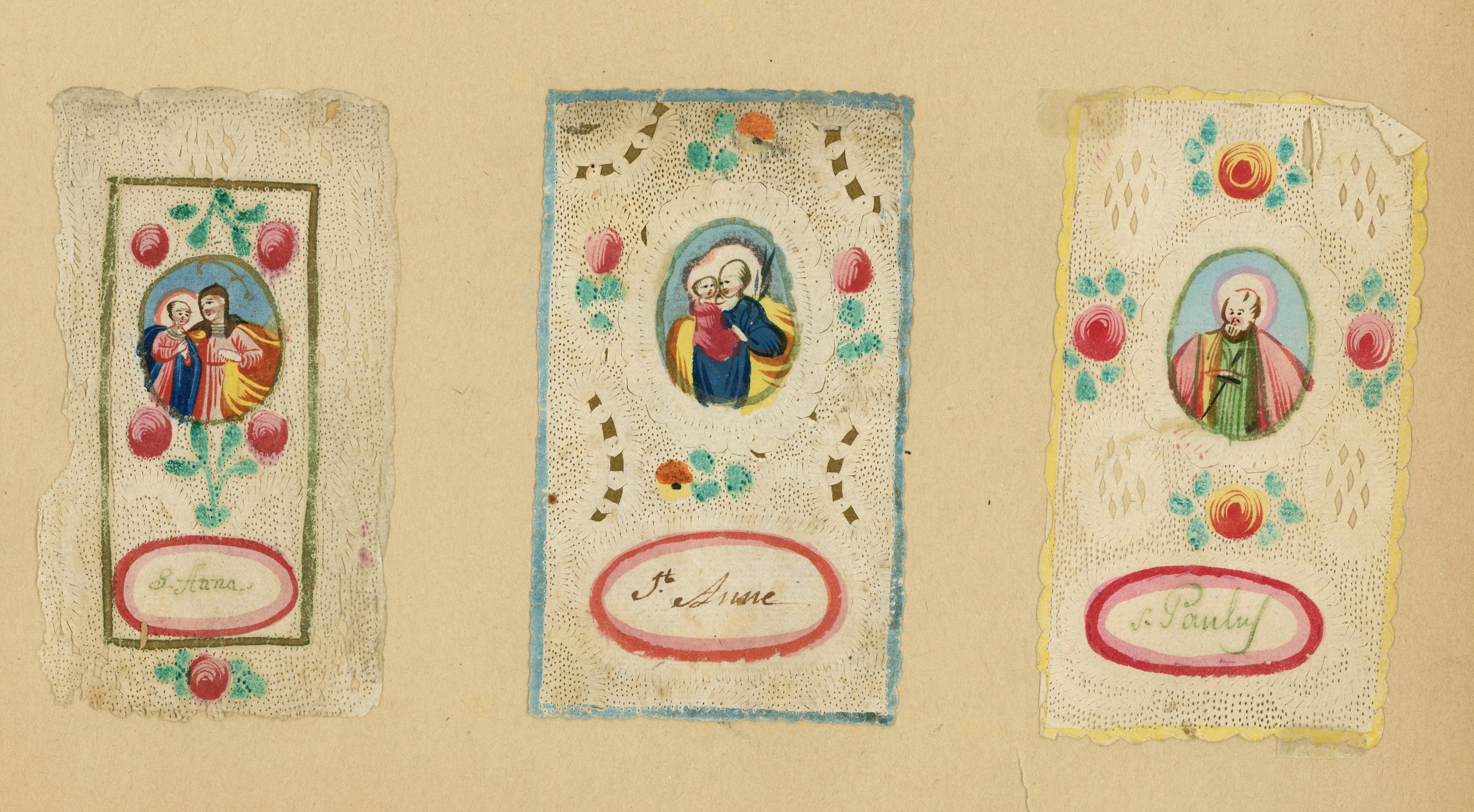 Lot de 24 canivets sur vélin et papier, formats divers, à décor plein ou à découpe de motifs géométriques et floraux, peints et légendés, ornés d'un médaillon central peint représentant des saints et des saintes, contrecollés sur papier. Etats moyen à TTB.