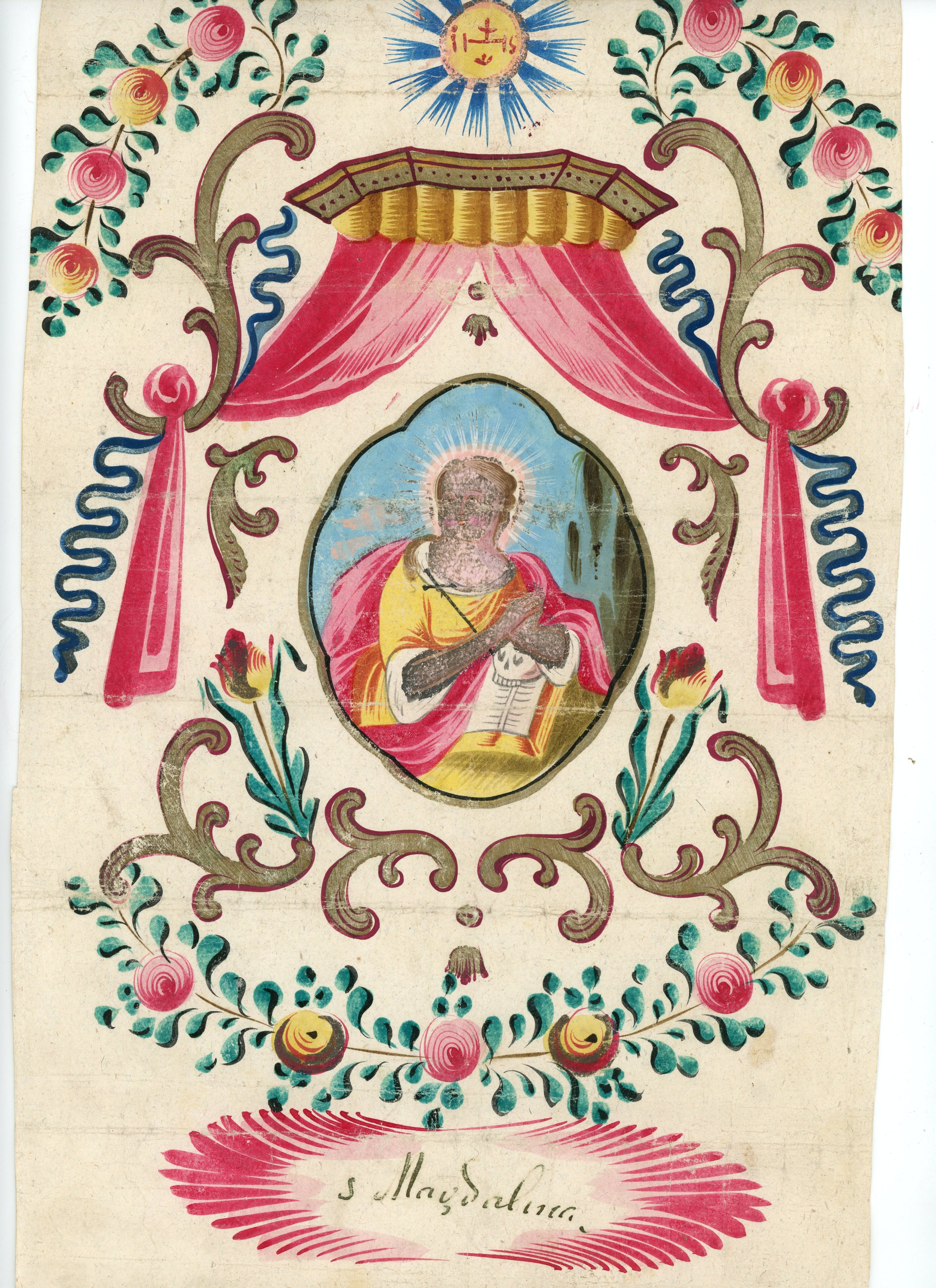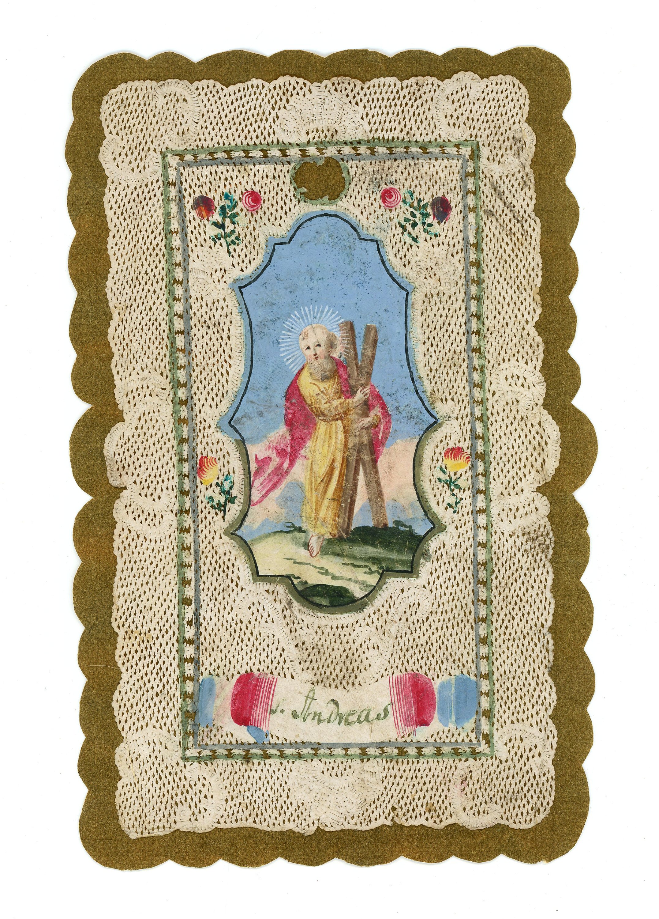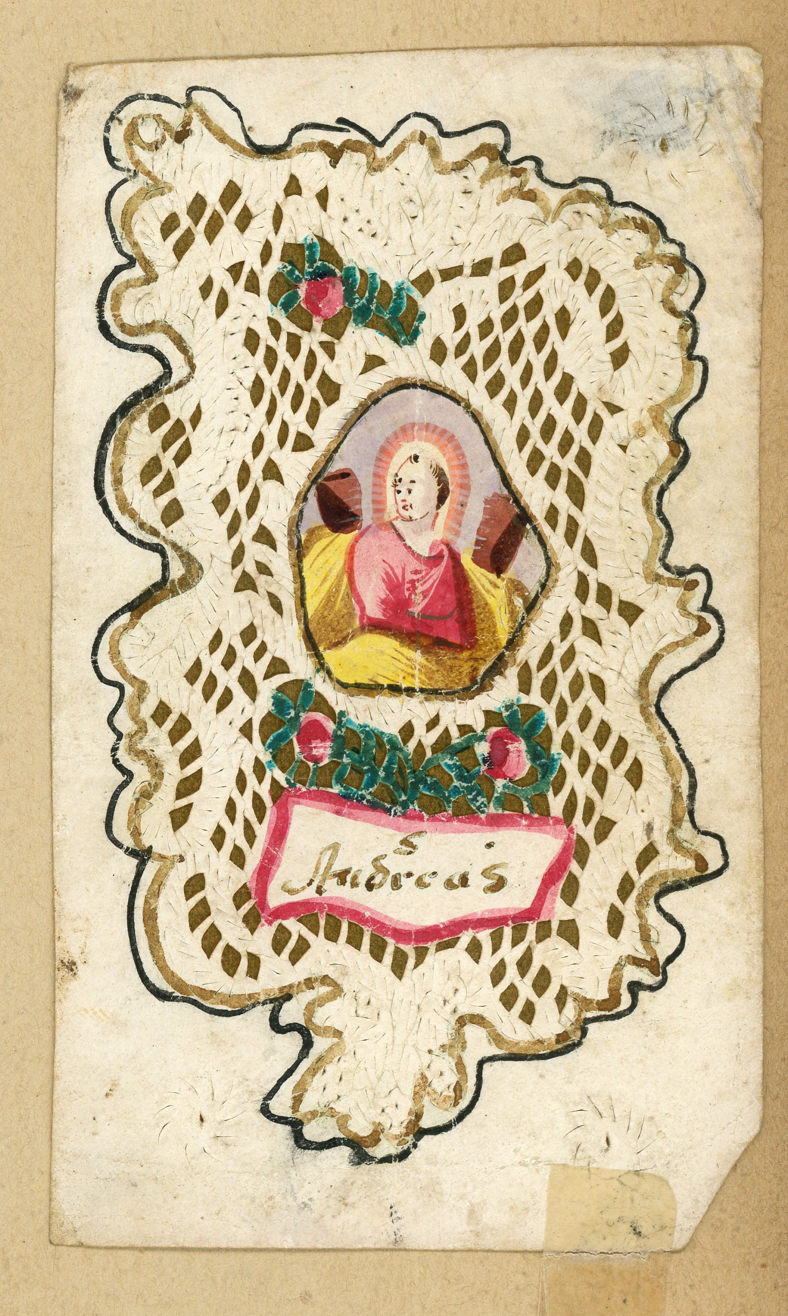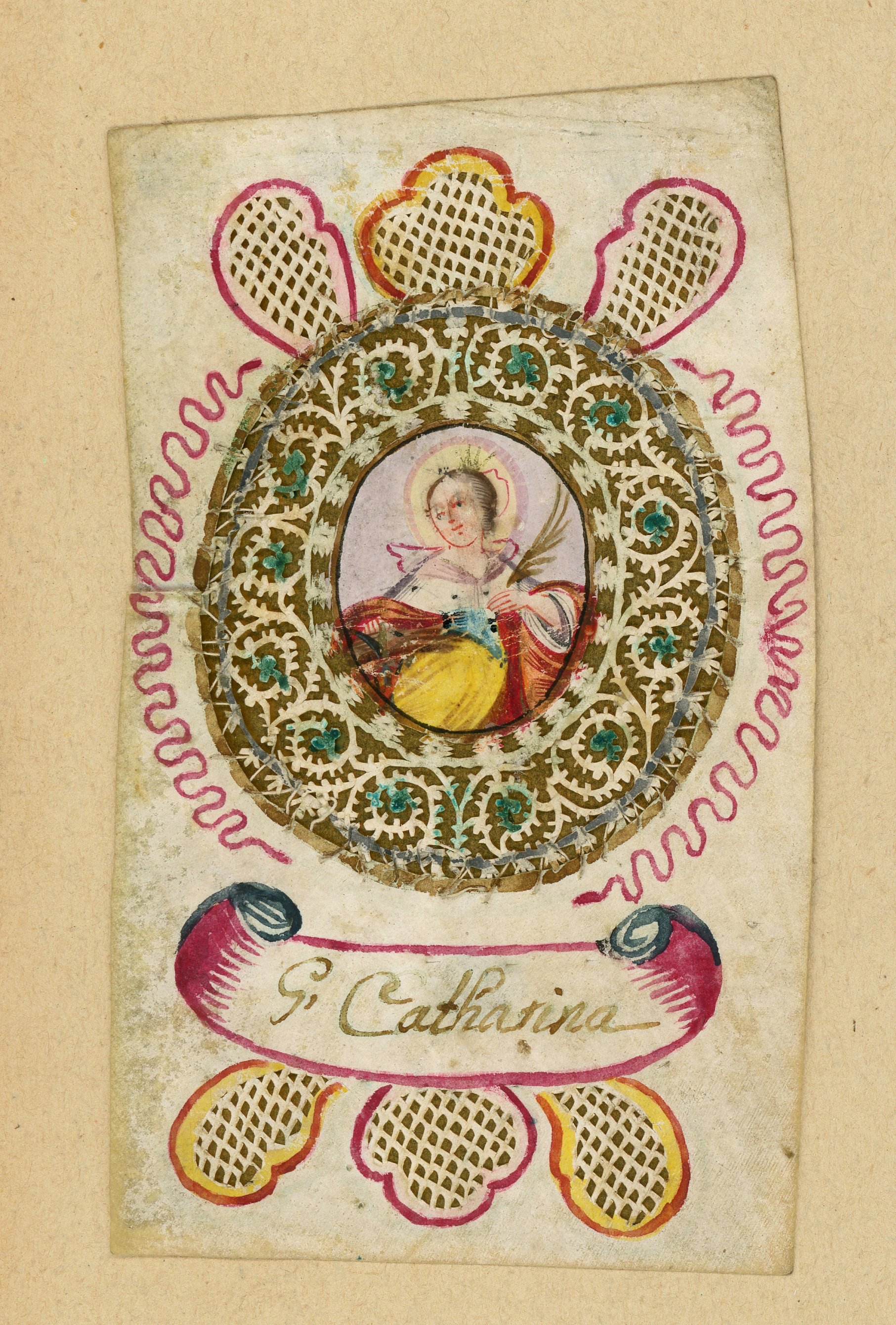 Lot de 24 canivets sur vélin et papier, formats divers, à décor plein ou à découpe de motifs géométriques et floraux, peints et légendés, ornés d'un médaillon central peint représentant des saints et des saintes, contrecollés sur papier. Etats moyen à TTB.