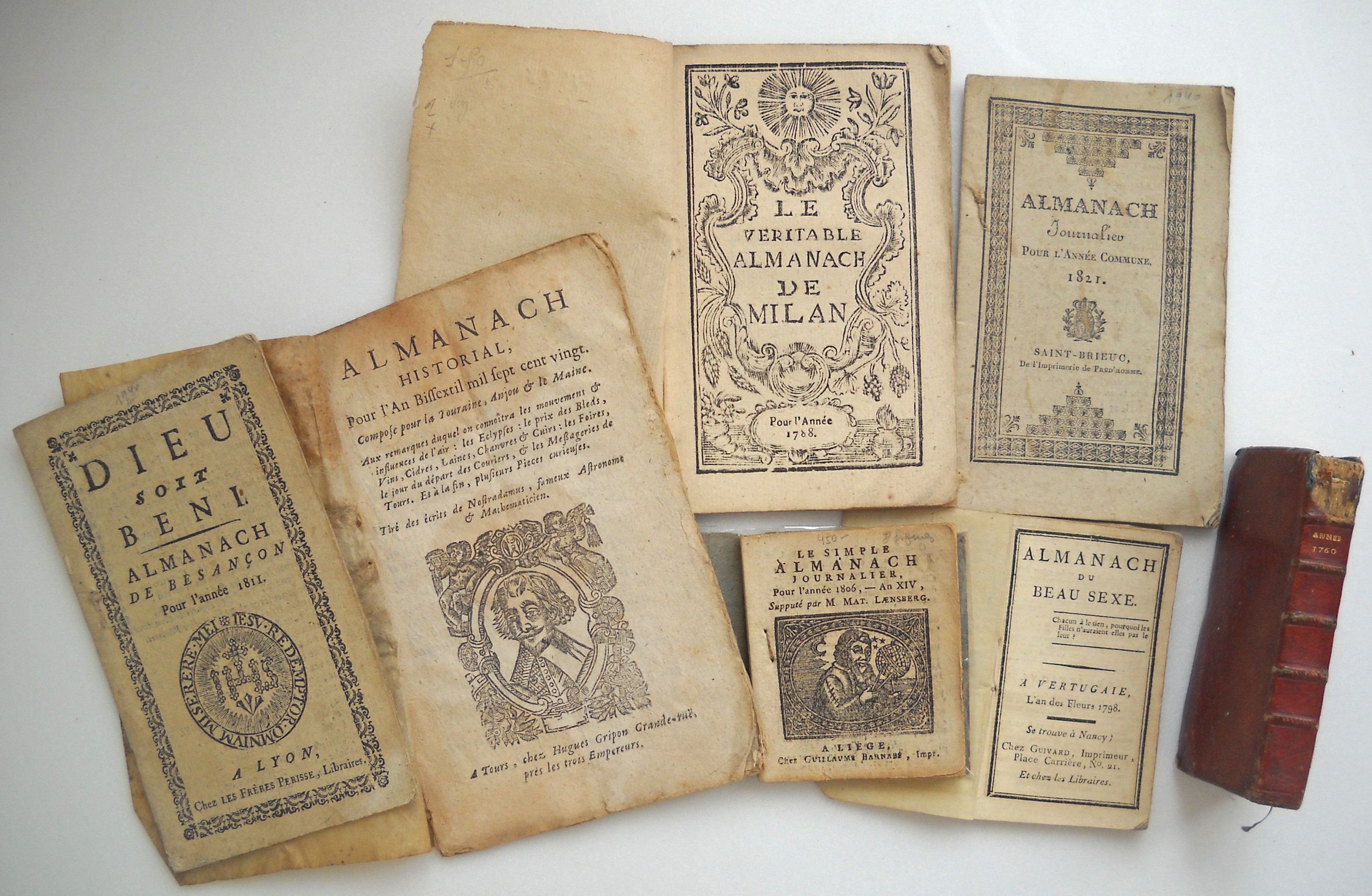 l'an des Fleurs 1798 ", à Nancy, chez Guivard, 80 pp. - " LE SIMPLE ALMANACH JOURNALIER pour l'année 1806 ", à Liège, chez Guillaume Barnabé, in-32, 89 pp. - " DIEU SOIT BENI / ALMANACH DE BESANÇON pour l'année 1811 ", à Lyon, chez les Frères Périsse, 22 pp. - " ALMANACH Journalier pour l'année commune 1821 ", Saint-Brieuc, de l'imprimerie de Prud'Homme, 23 pp. - " DIEU SOIT BÉNI - LE BON ET NOUVEL ALMANACH-DOUBLE, VÉRITABLE MILAN DES VILLES ET DES CAMPAGNES, pour l'an de grâce 1843 ", Lyon, chez Lambert-Gentot, 34 pp. - " Verbesserter Kalender genannt der Hintende Bote am Rhein ", 1854, Strasbourg, in-8, 71 pp.