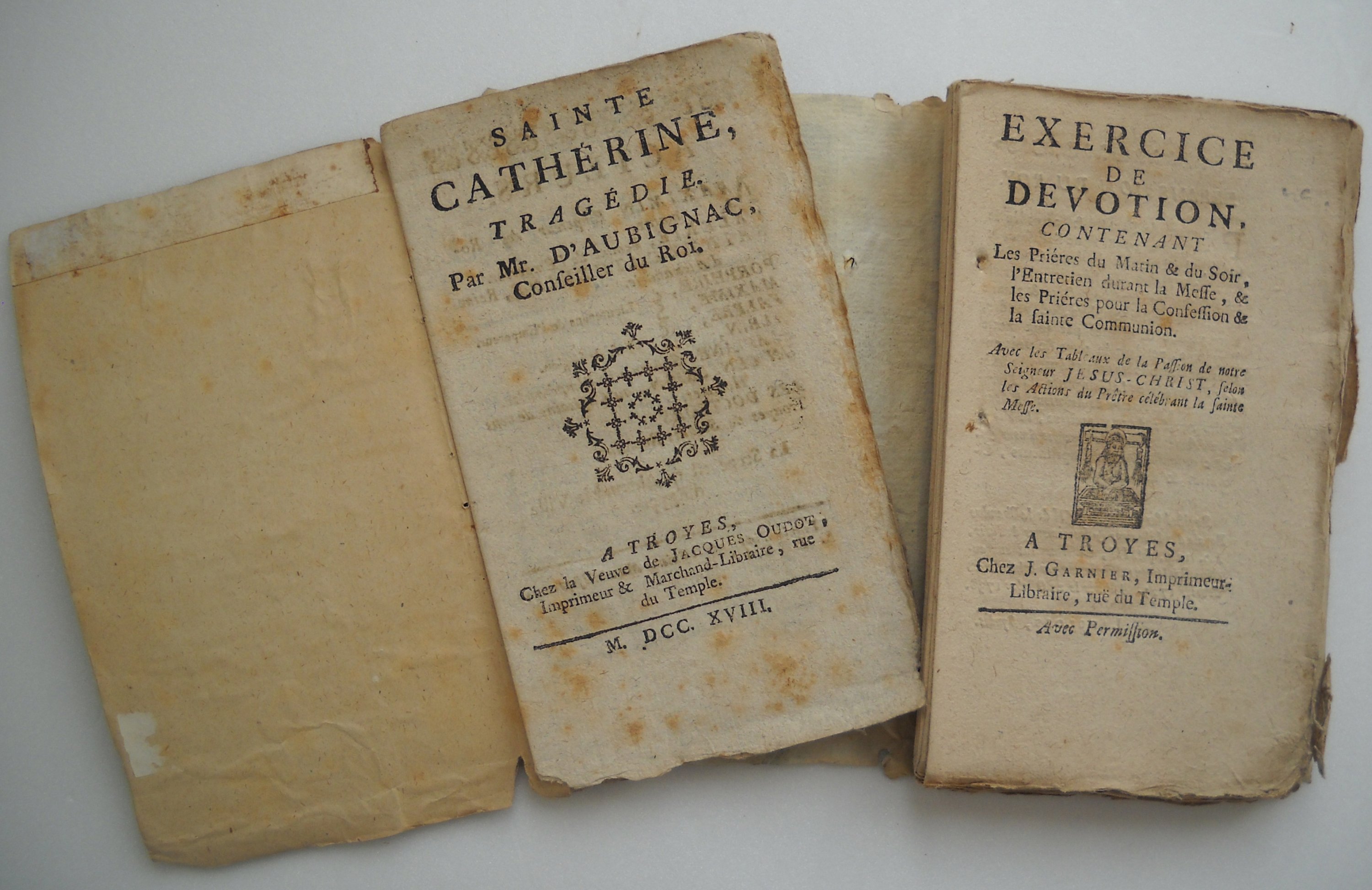 7 vol. ou plaquettes, édités à Troyes, in-18 à in-12, brochés ou rel. anciennes, XVIIe et XVIIIe siècles : " Histoire admirable de Nostre-Dame de Liesse ", par J. Bosius, [1602], chez Blaise Boutart, 60 pp. - " Sainte Catherine, tragédie. " par d'Aubignac, Veuve de Jacques Oudot, 1718, 72 pp. - " La Vie de S. Alexis, Vrai Miroir de Patience et de Chasteté ", J.A. Garnier, s.d., 47 pp. - " Exercice de dévotion contenant les Prières du Matin & du Soir, l'Entretien durant la Messe & les Prières pour la Confession & la sainte Communion