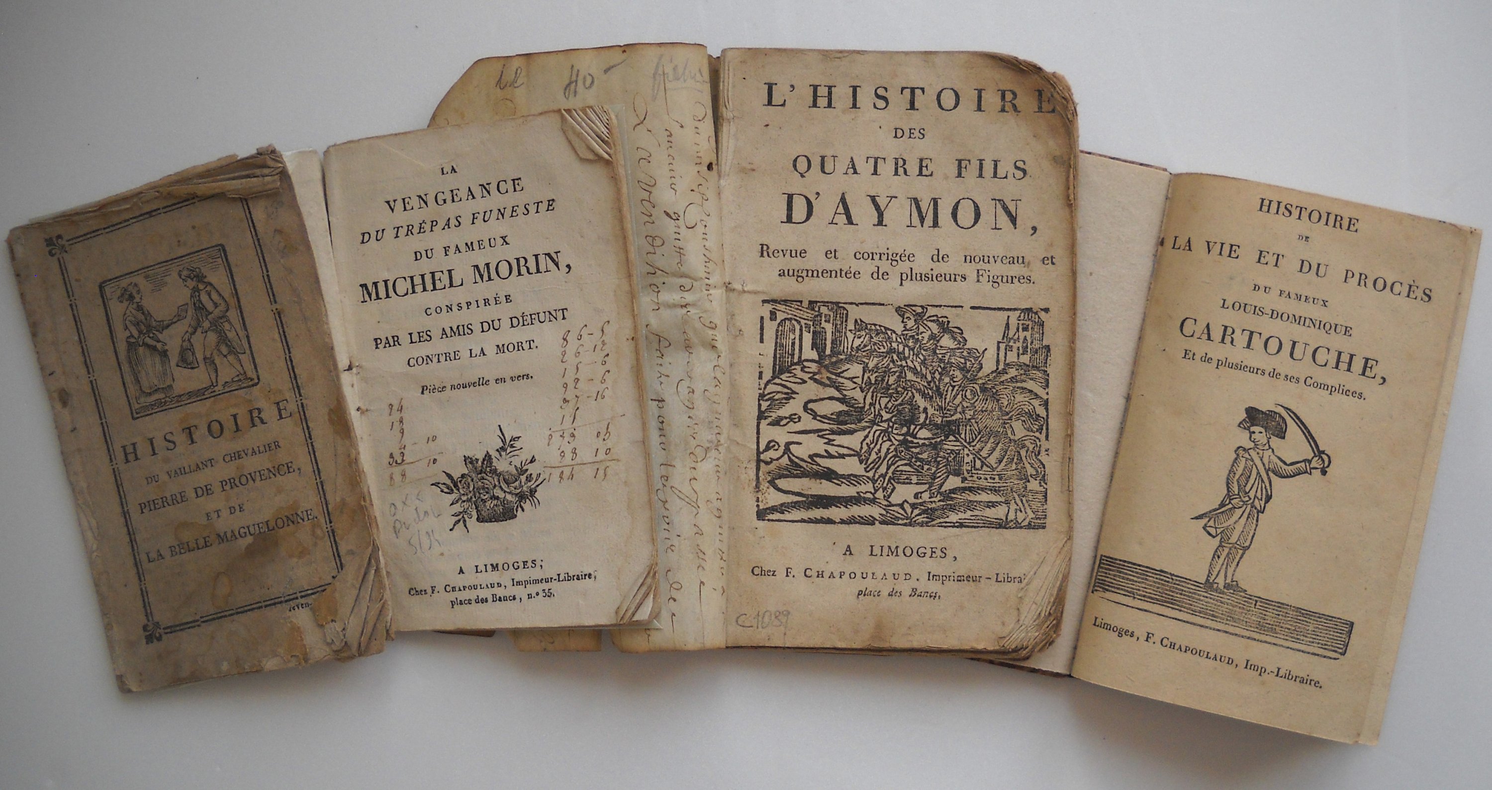 " " A Lion, A Li. Par Jean Bardinet " [paroisse de Saint Michel de Lion à Limoges], 32pp., RARE - " La vengeance du trépas funeste du fameux Michel Morin, conspirée par les amis du défunt contre la mort ", s.d., chez F. Chapoulaud, in-16, 32 pp. - " L'histoire des quatre fils d'Aymon