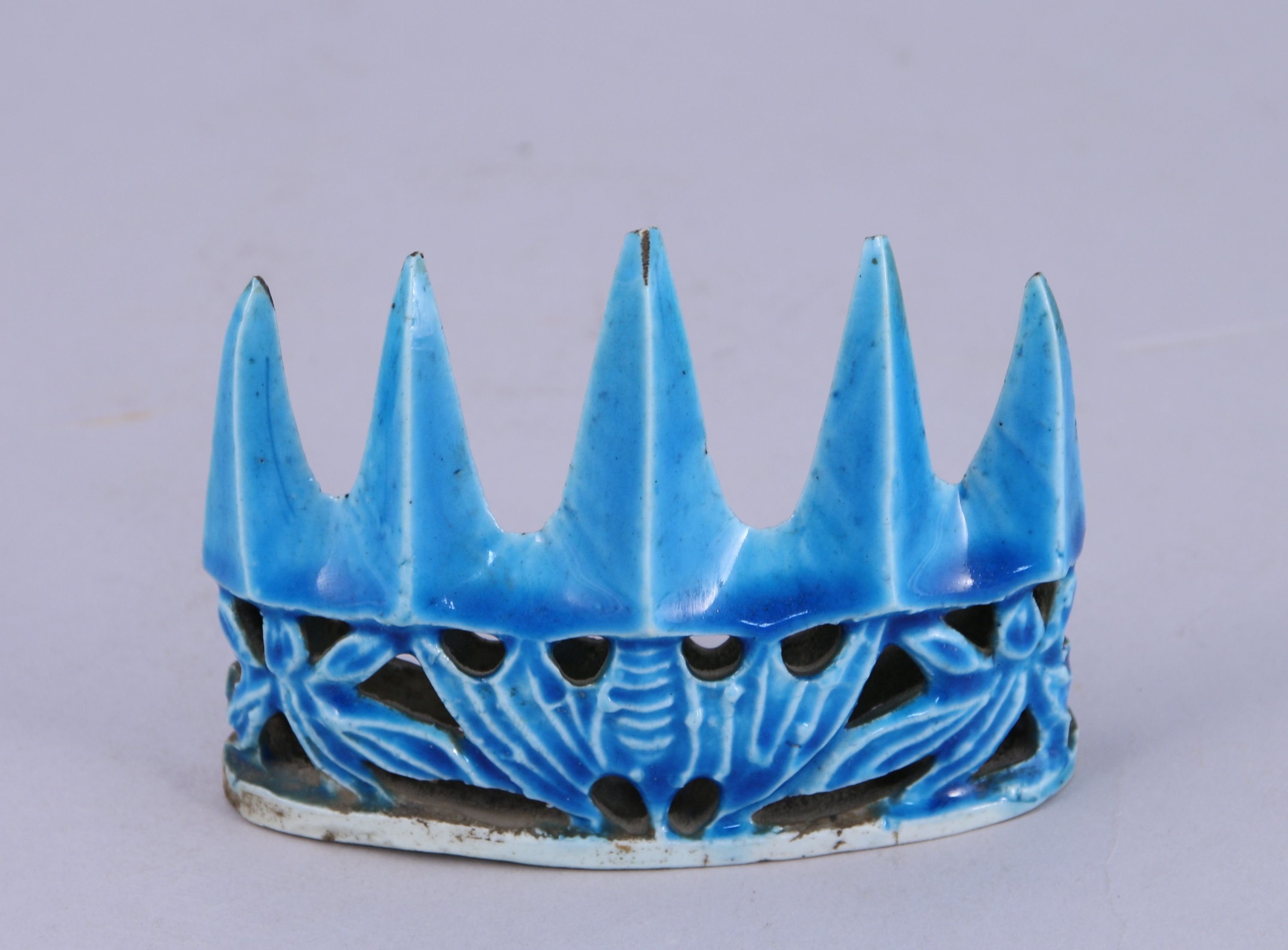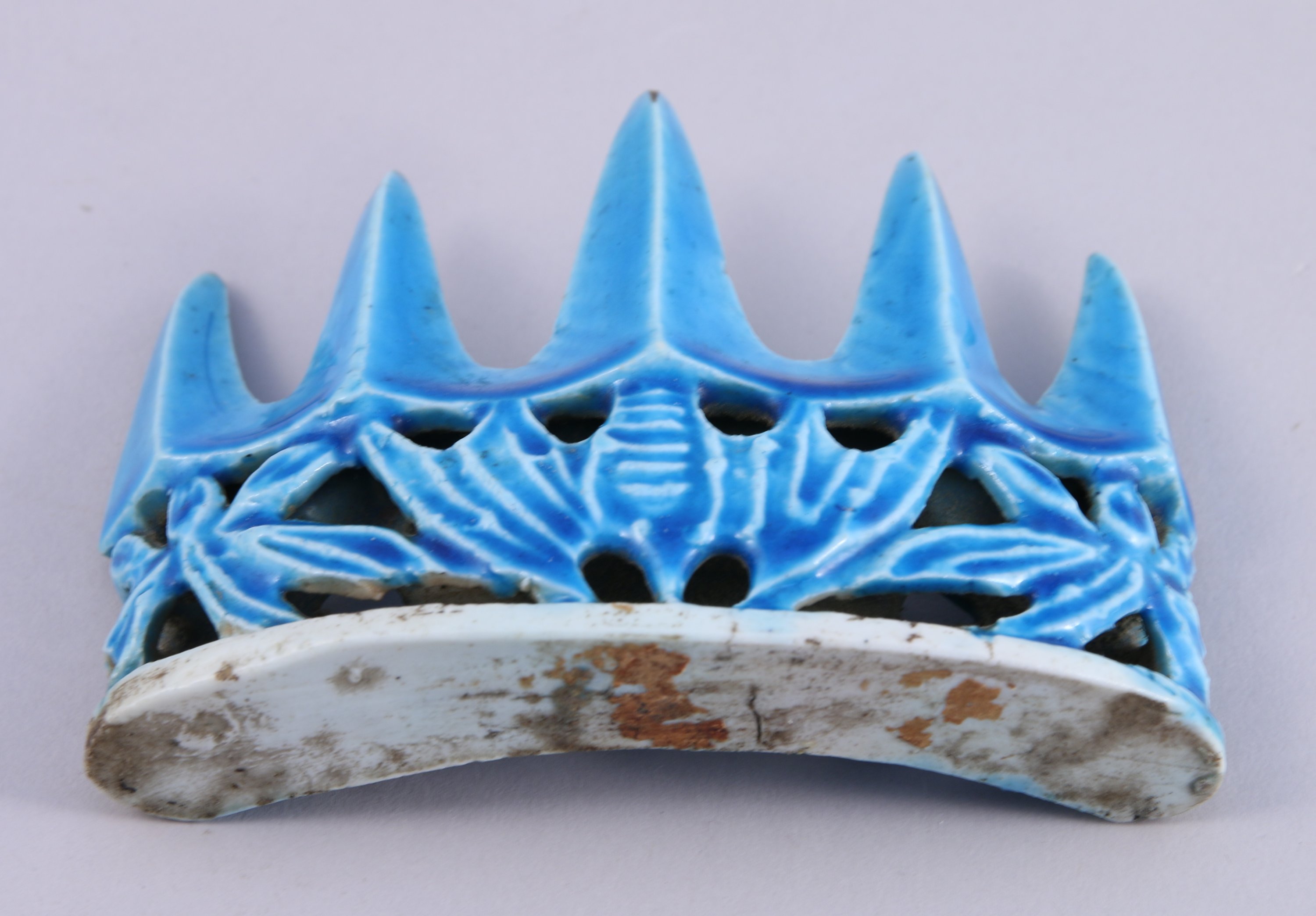 REPOSE-PINCEAUX en forme de colline à cinq pics en porcelaine émaillée bleu turquoise sur le biscuit.