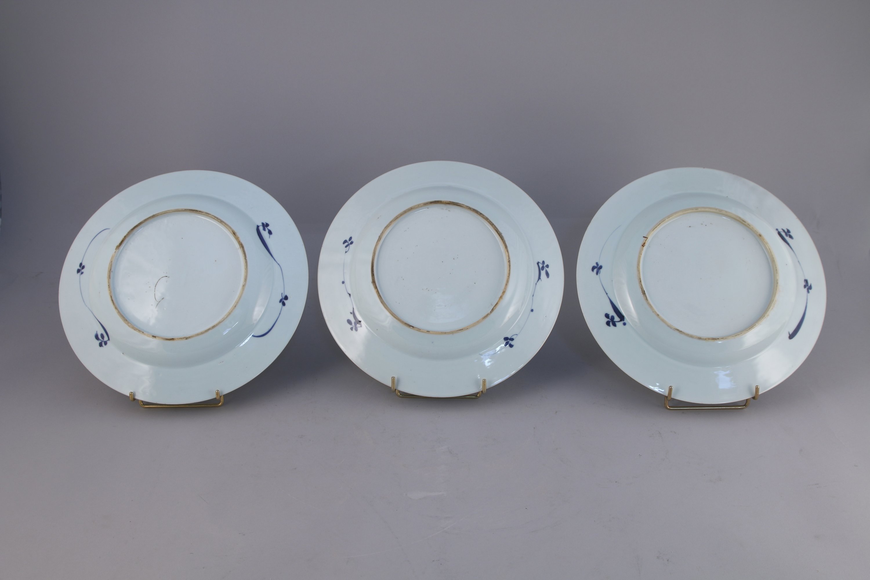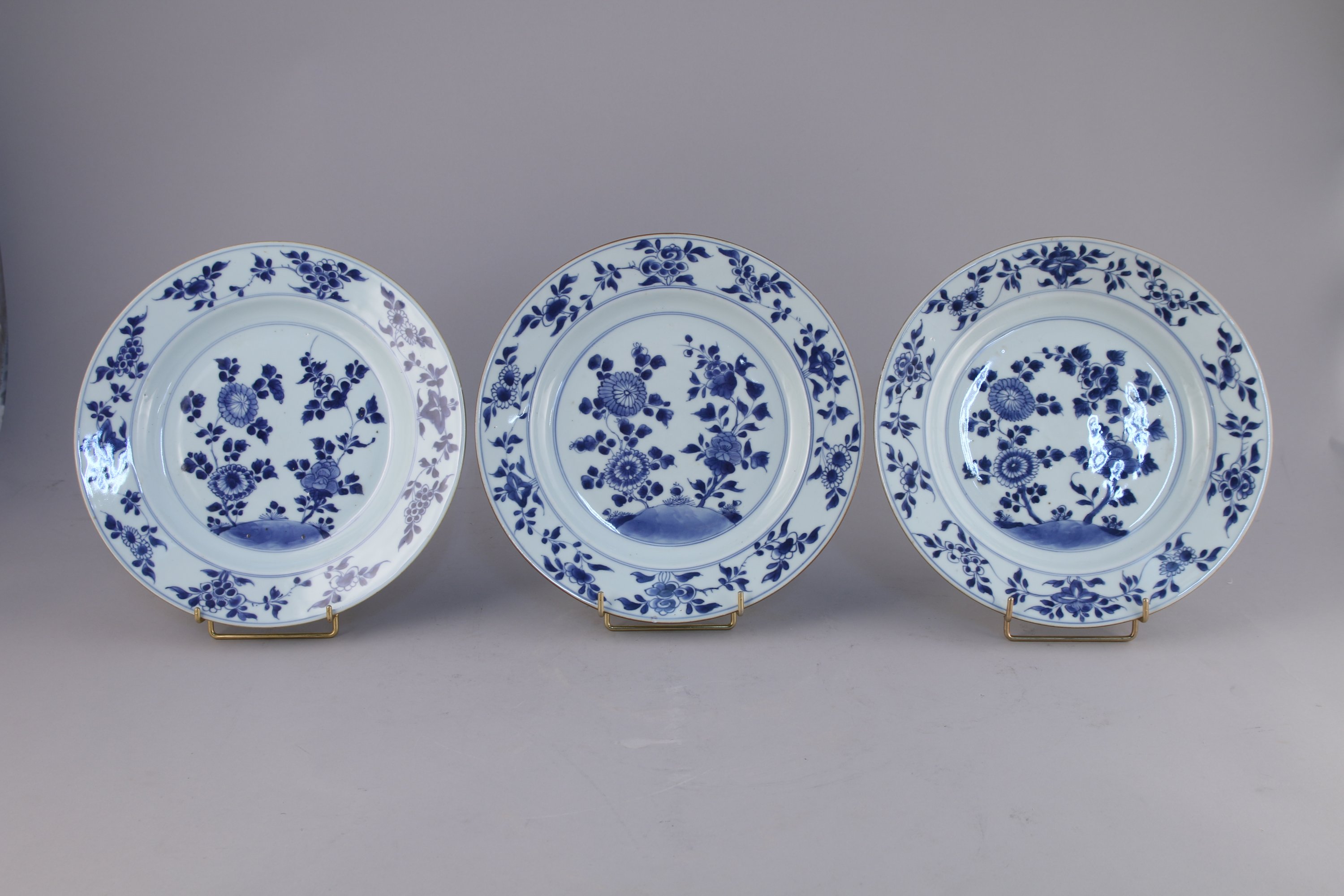 TROIS ASSIETTES en porcelaine à décor en bleu sous couverte de pivoines et chrysanthèmes dans leur feuillage, l'aile ornée de fleurs stylisées.