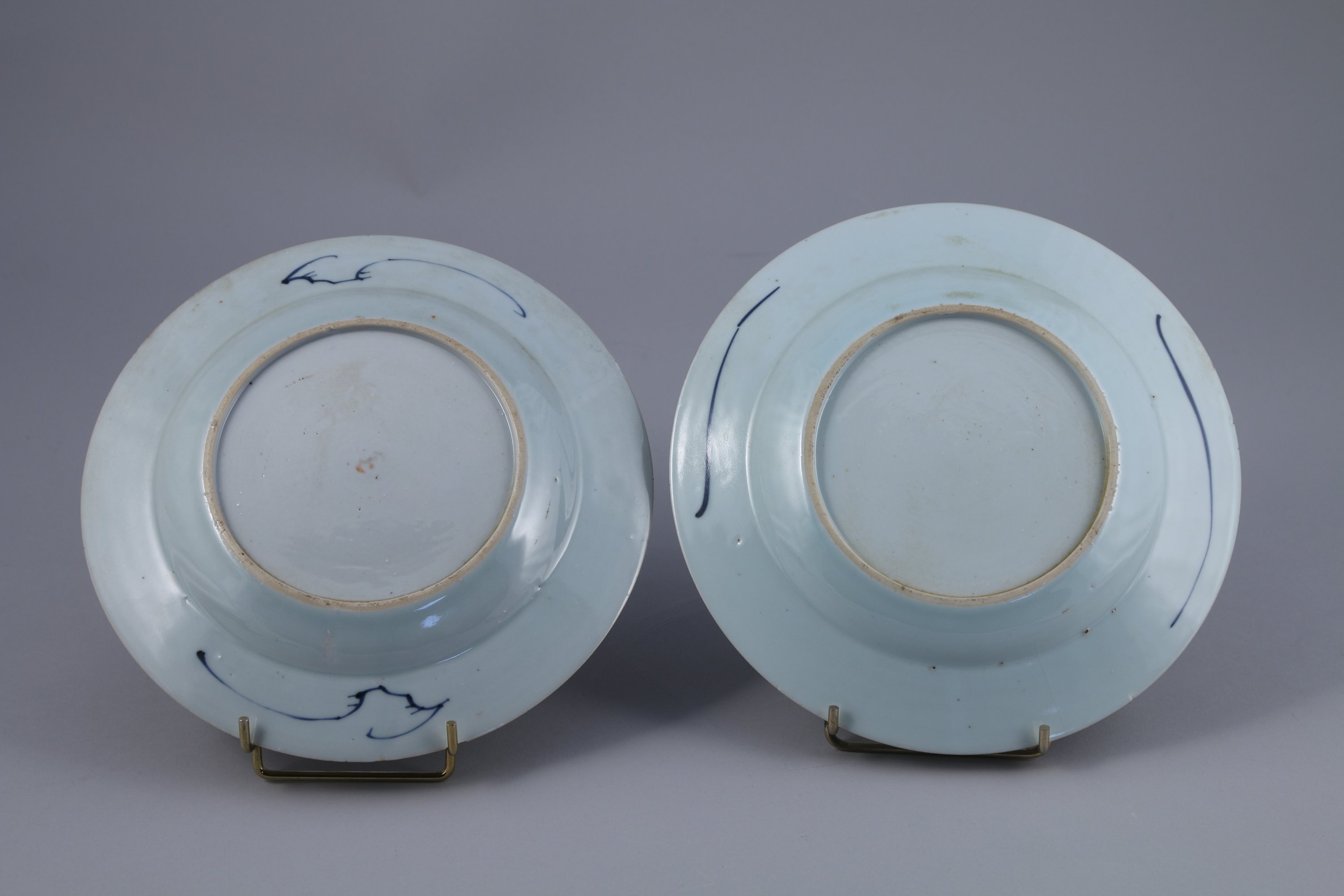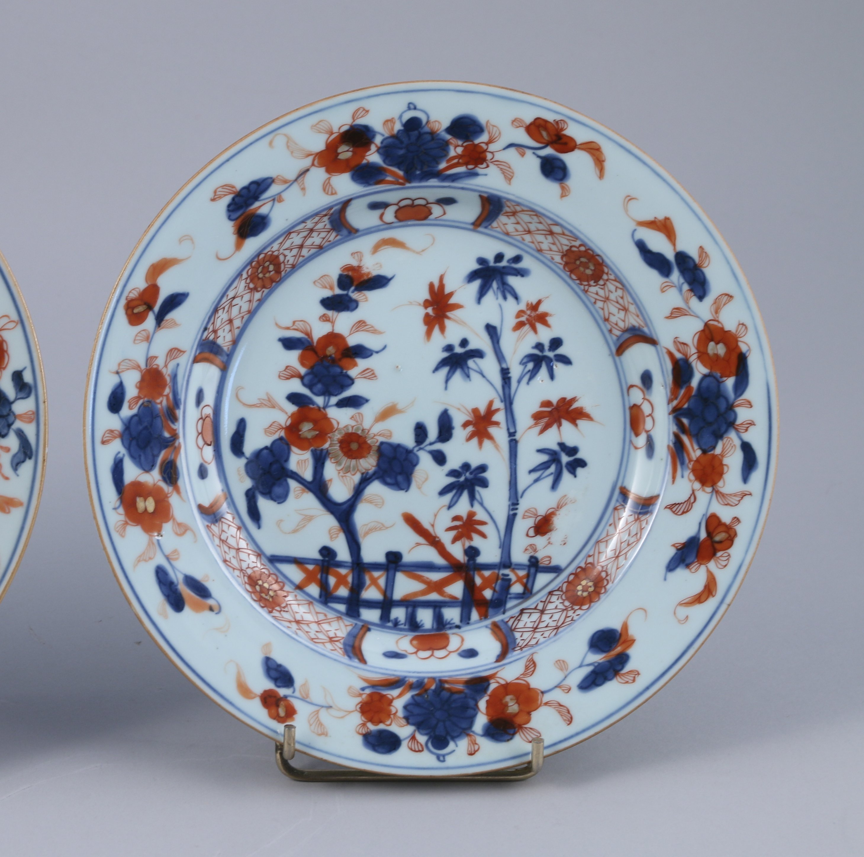Paire d'ASSIETTES en porcelaine à décor bleu, rouge et or dit Imari à la barrière fleurie.