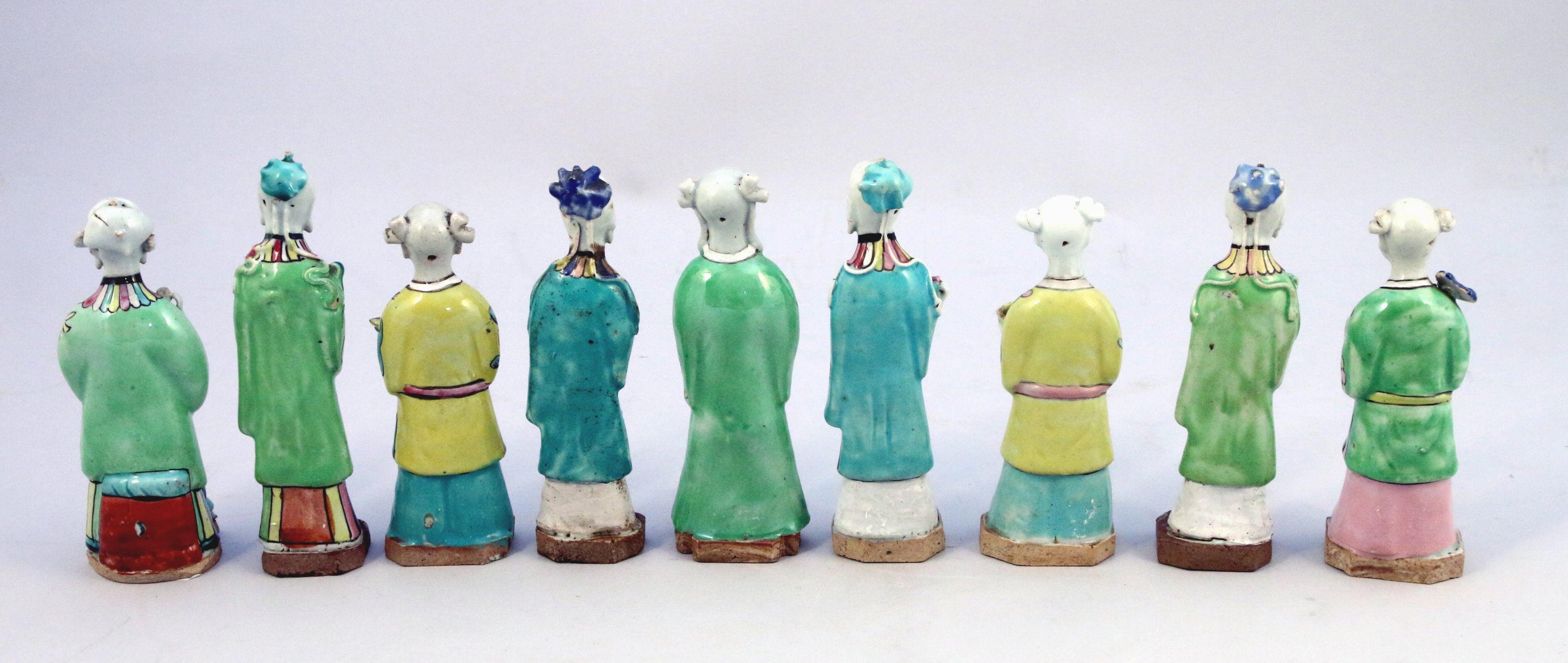 NEUF STATUETTES en porcelaine émaillée polychrome, dont trois paires, personnages et enfants debout tenant des ruyi, des chasse-mouches et de petits récipients, leurs habits à motifs e fleurs.