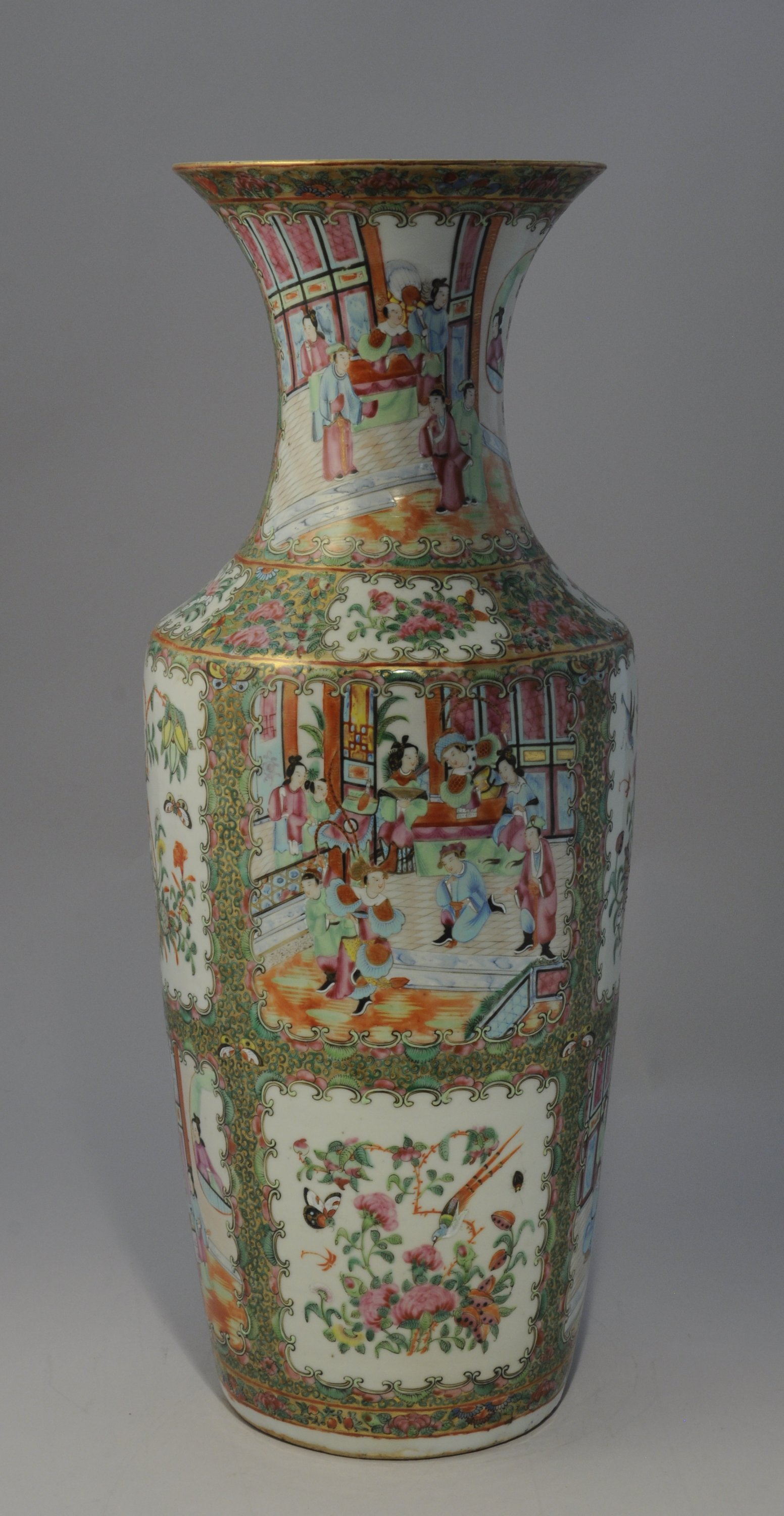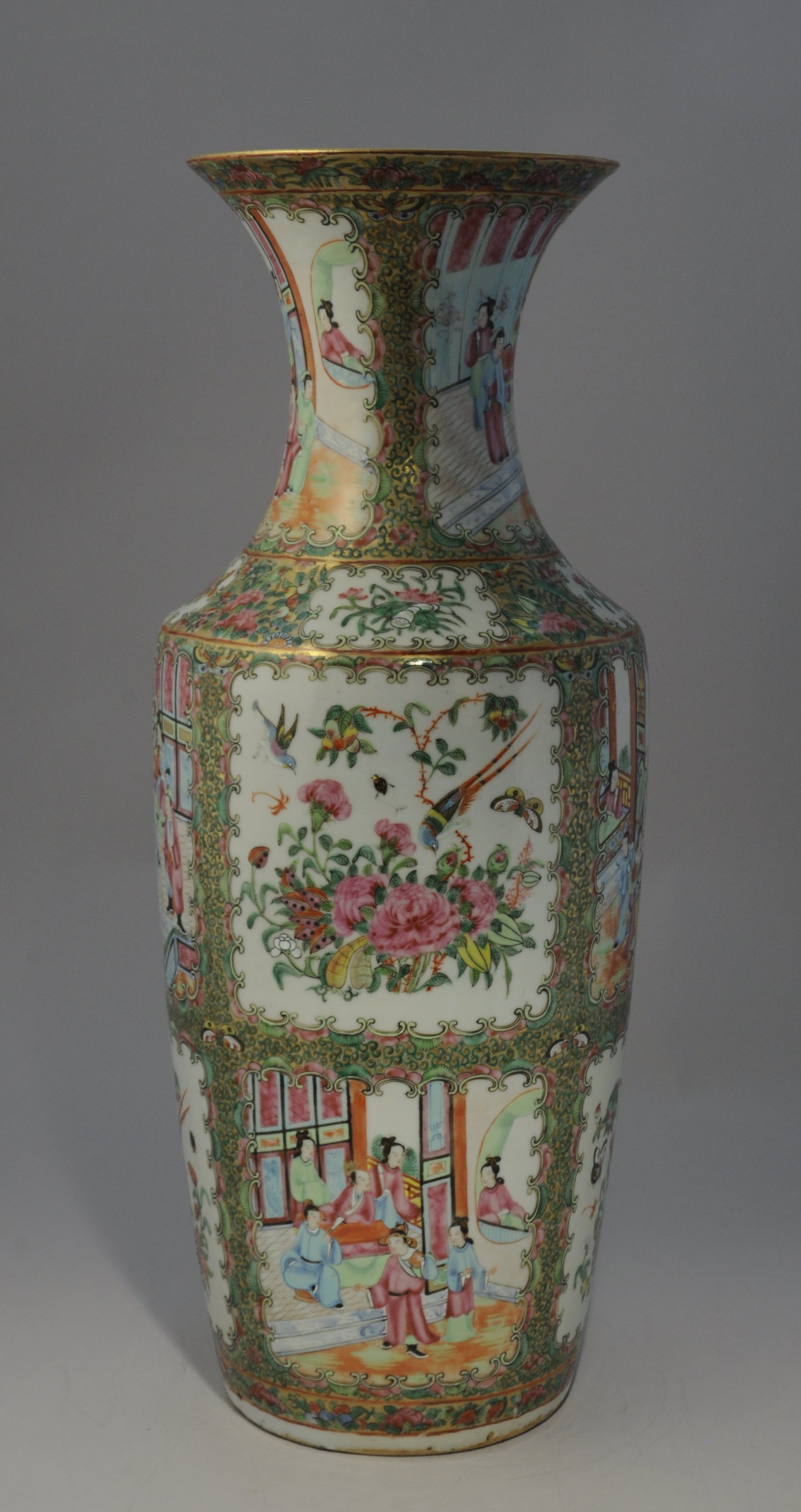 Grand VASE en porcelaine à décor polychrome et or décorée de scènes de palais et d'oiseaux branchés.