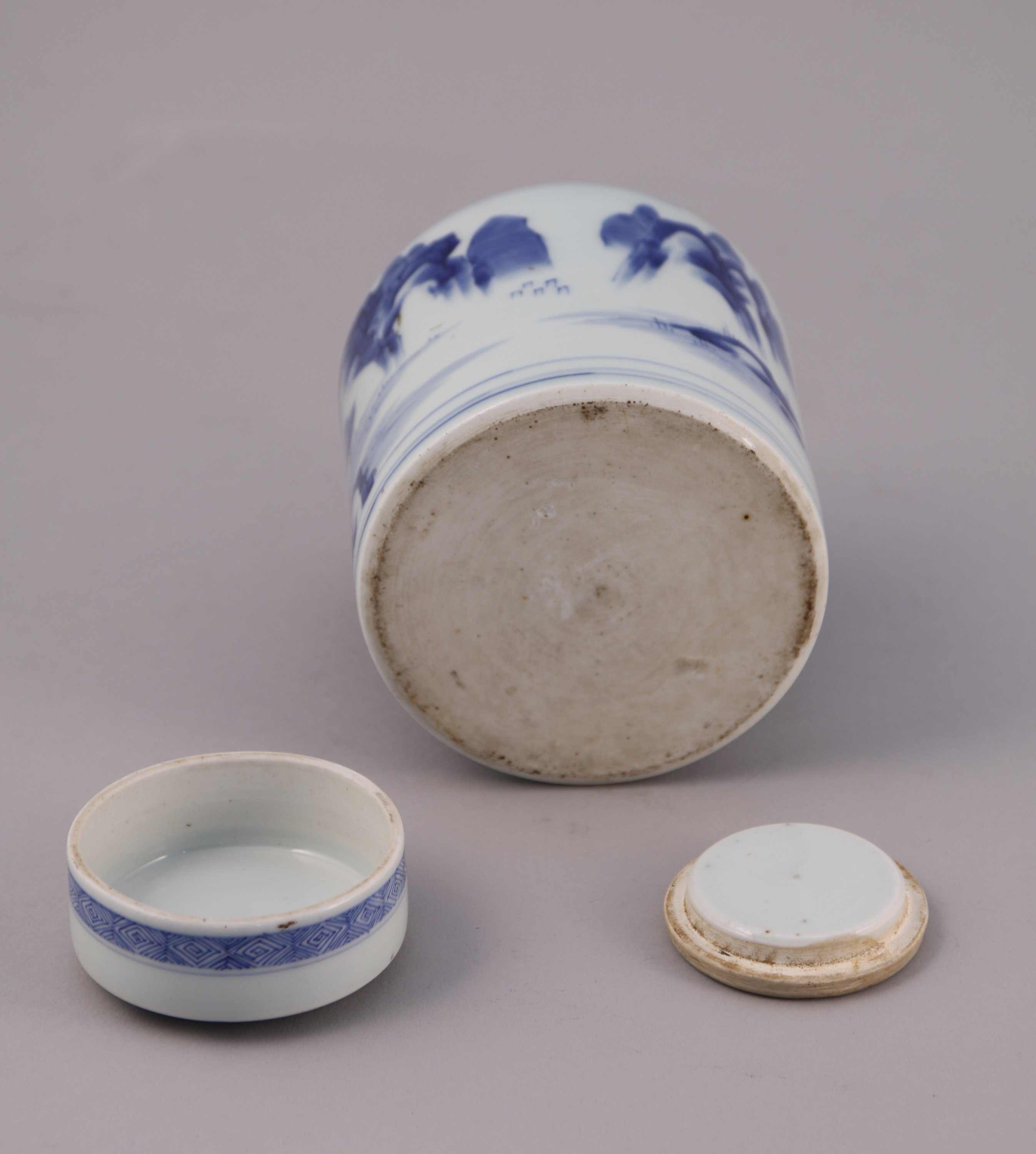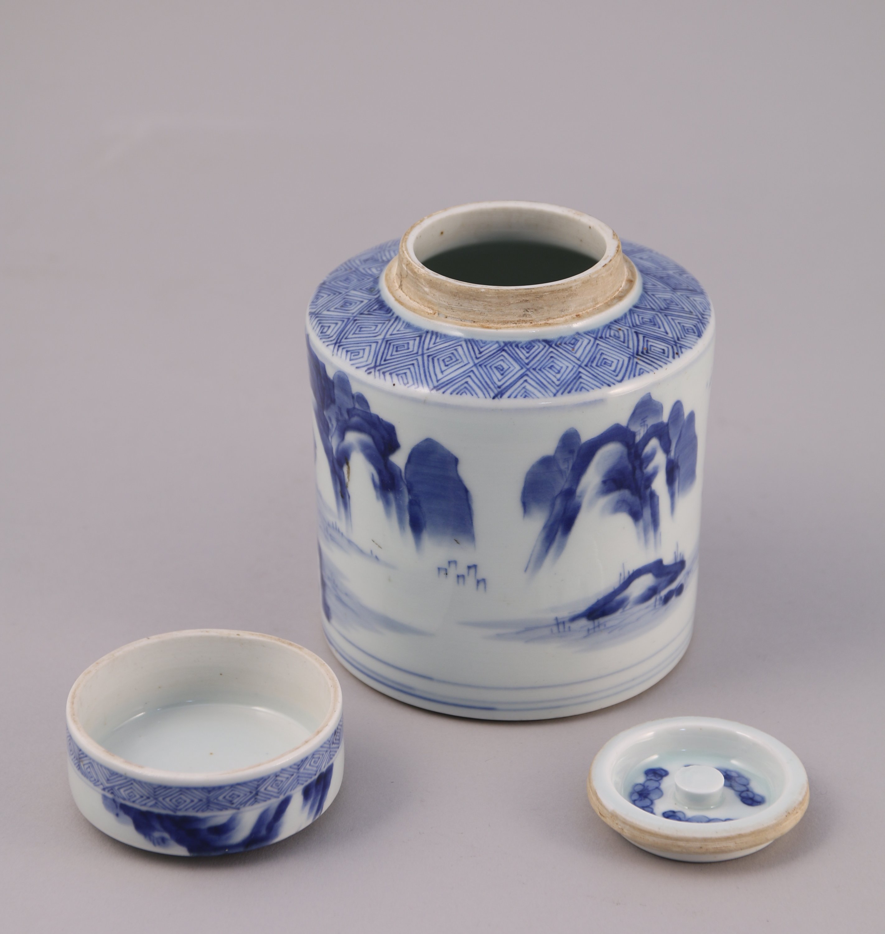 BOÎTE À THÉ en porcelaine à décor en bleu sous couverte de chaumières et de lacs à flanc de montagnes, l'épaule ornée de motifs géométriques.