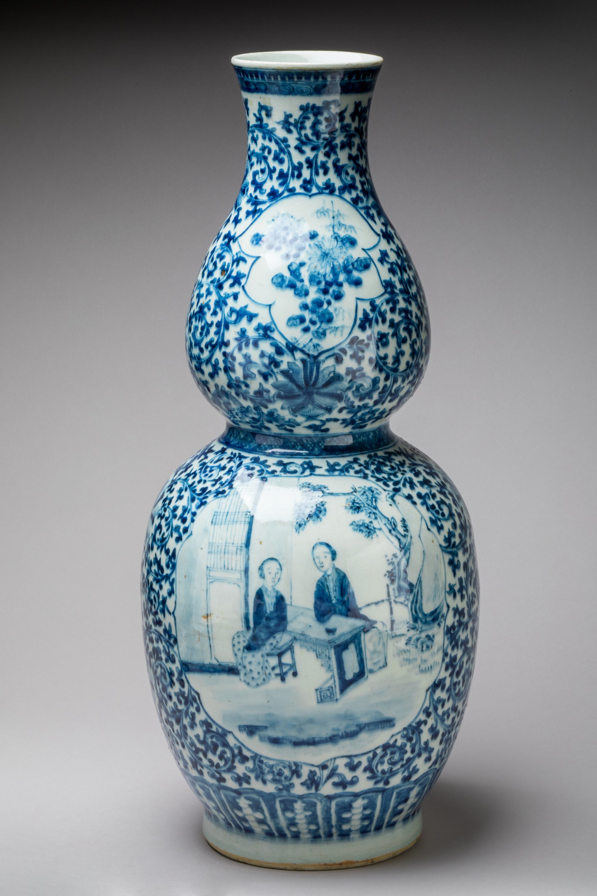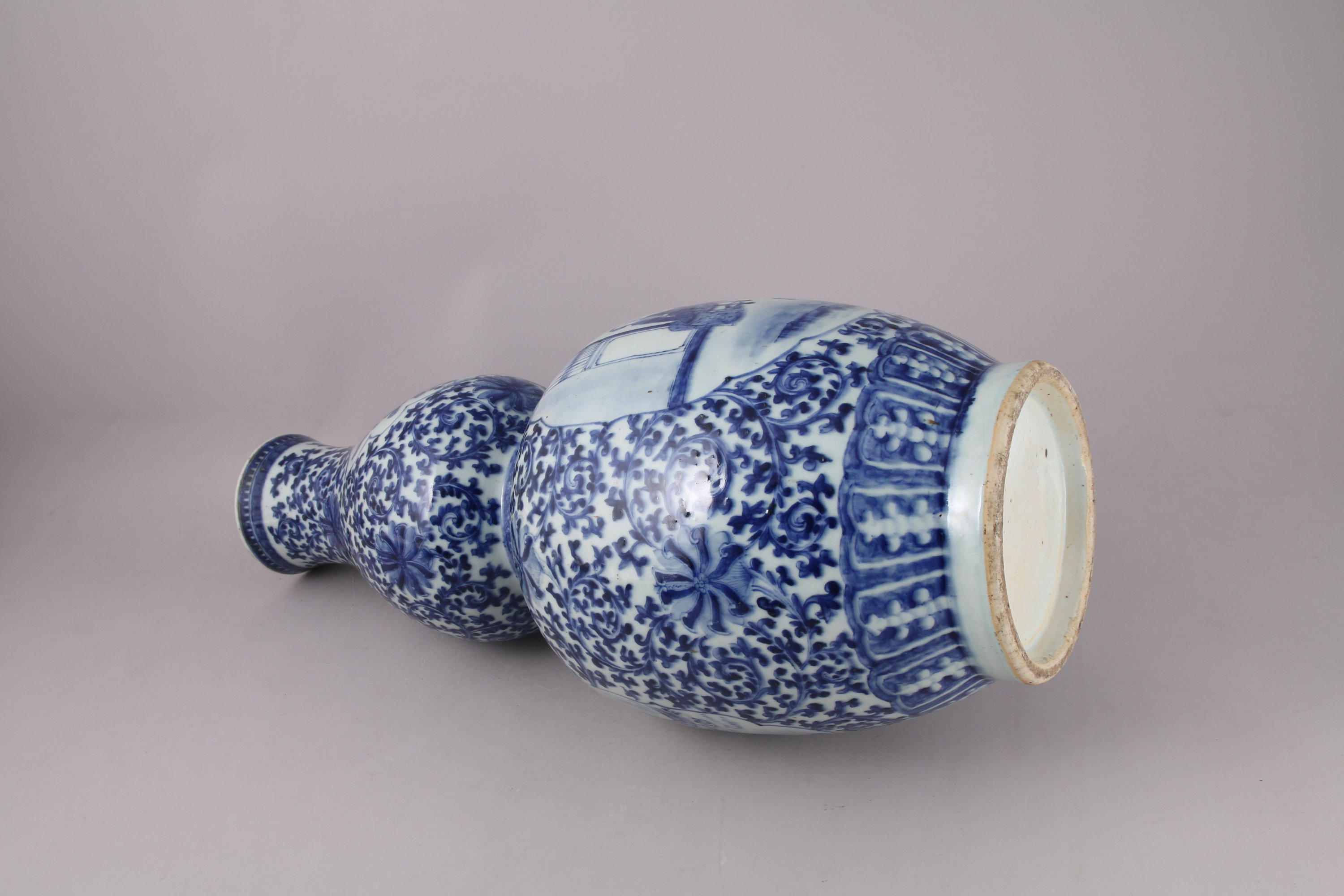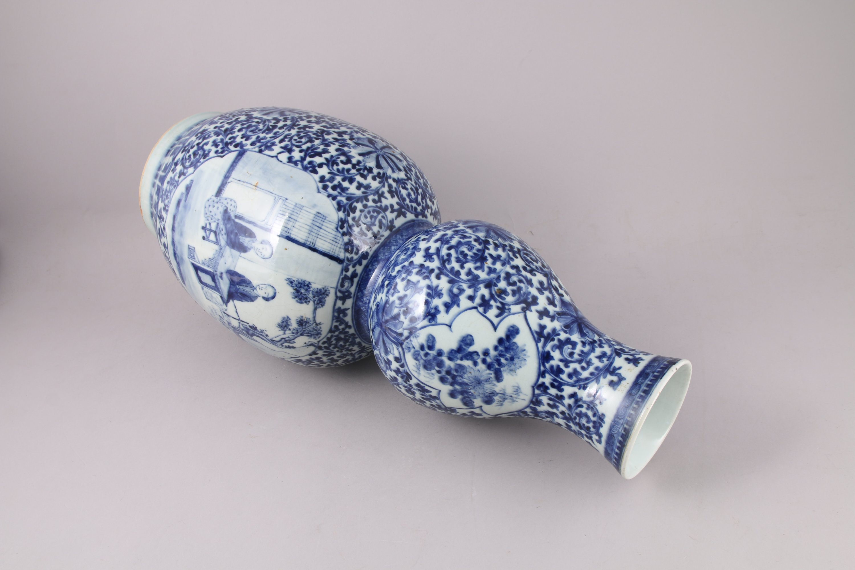 VASE à double BULBE en porcelaine à décor bleu et blanc de scènes de palais dans des réserves sur fond de rinceaux.