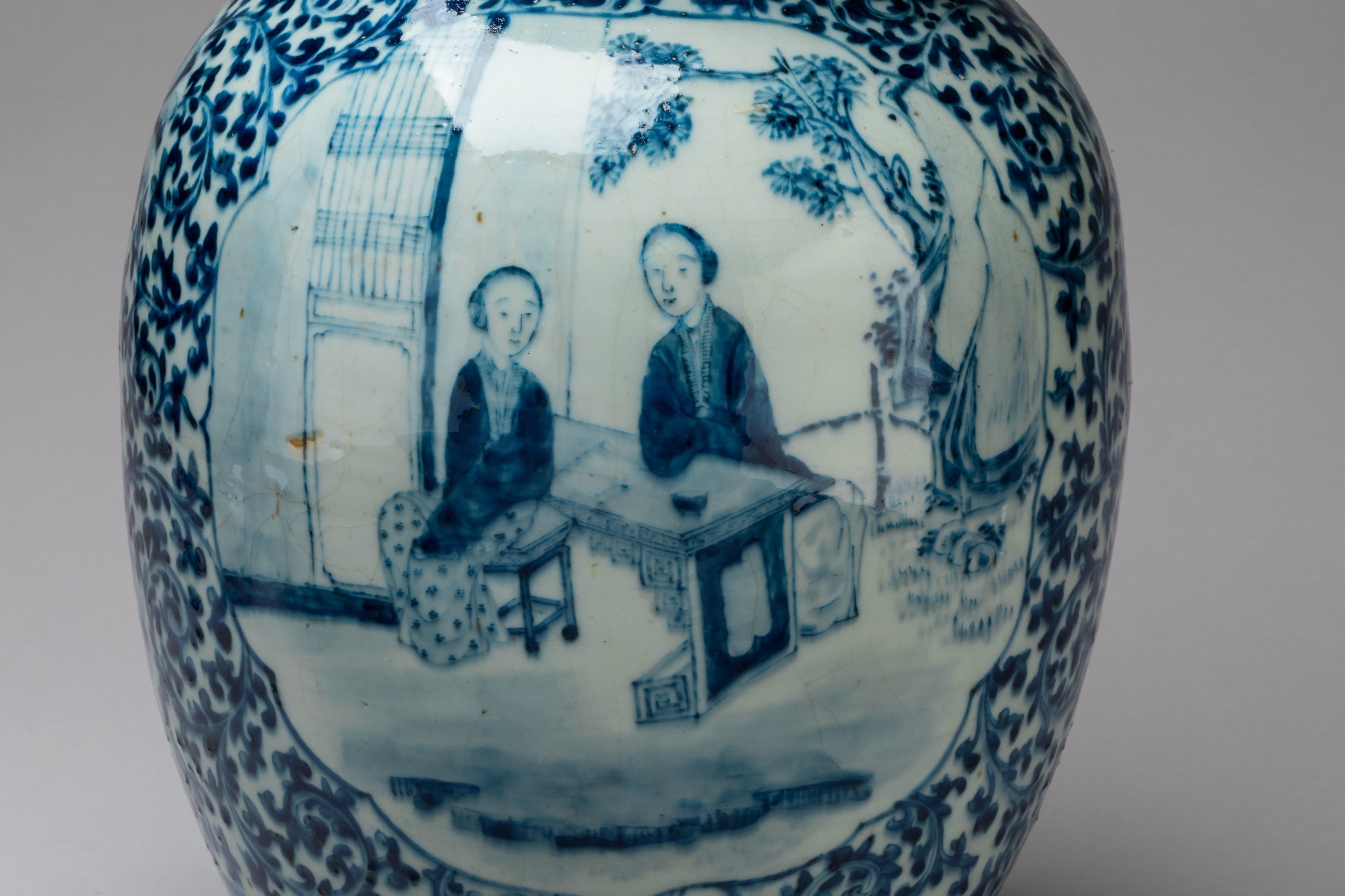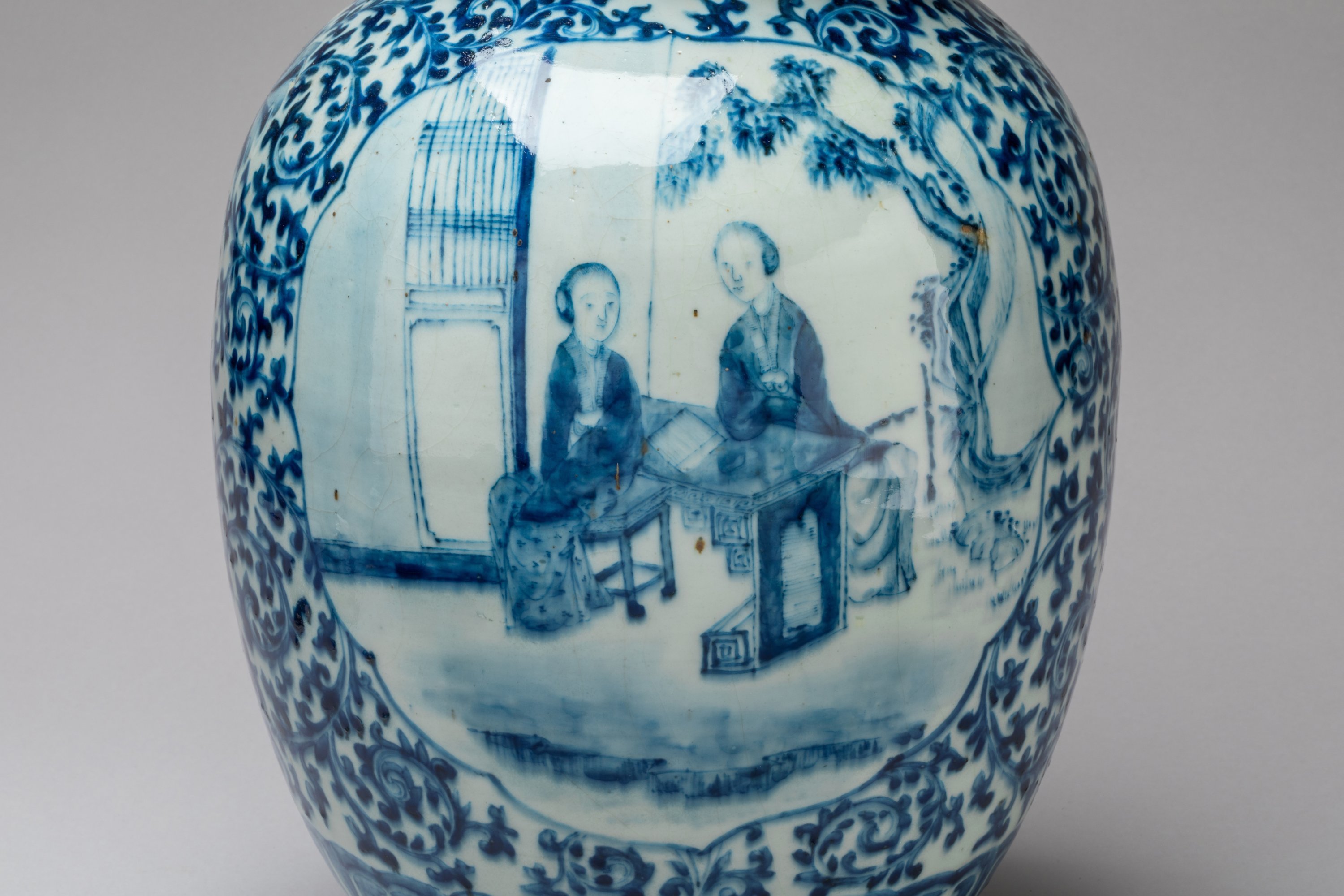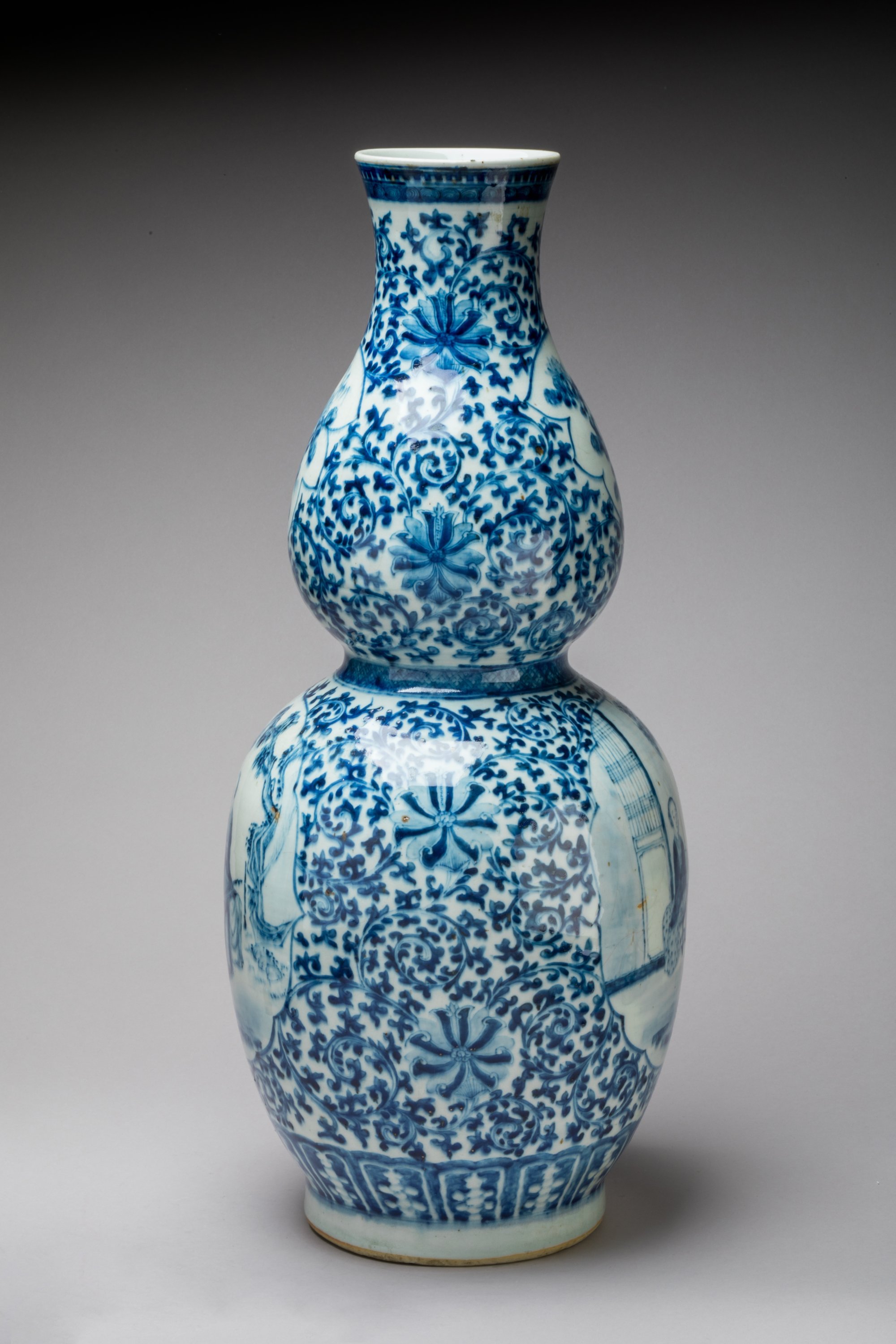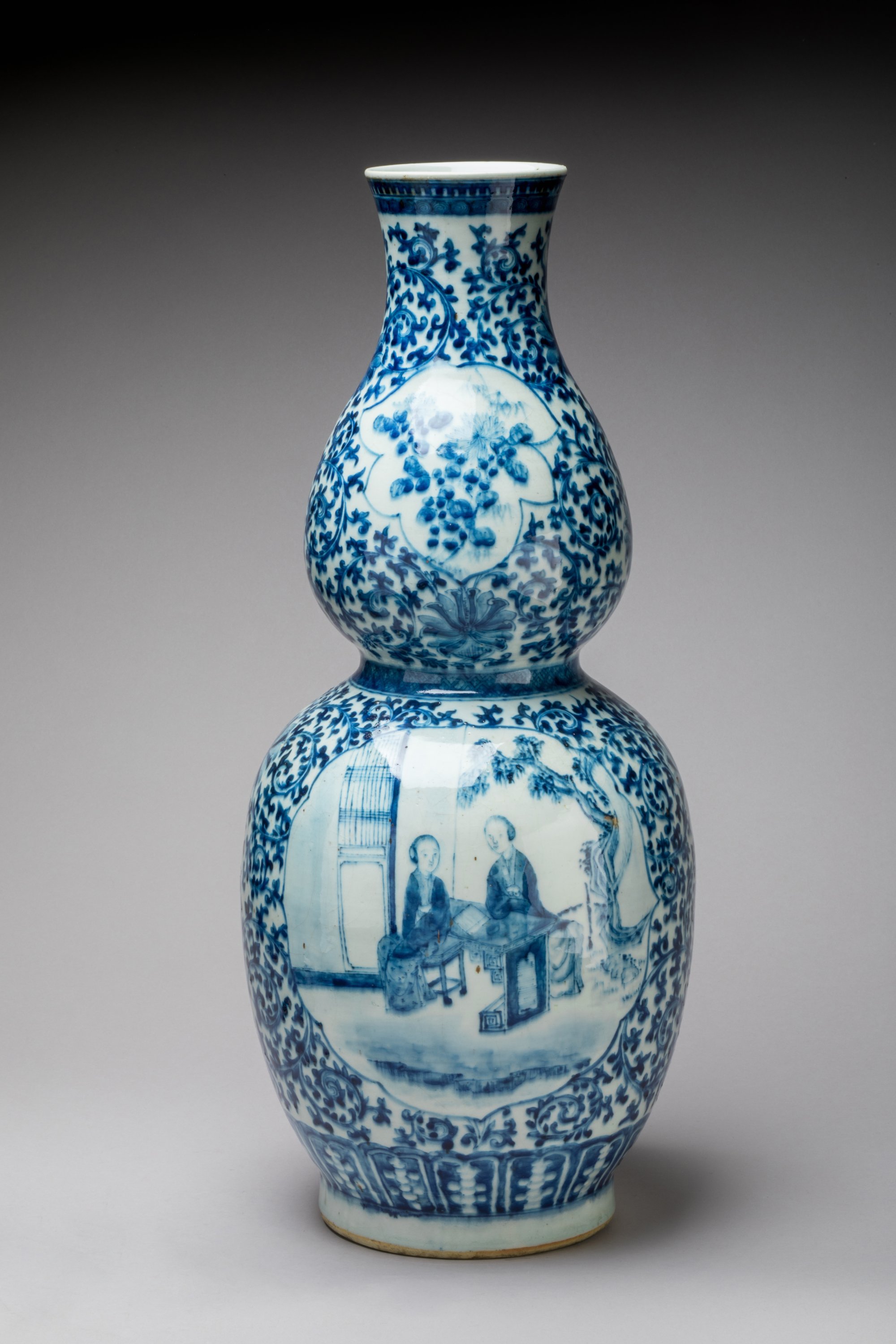 VASE à double BULBE en porcelaine à décor bleu et blanc de scènes de palais dans des réserves sur fond de rinceaux.
