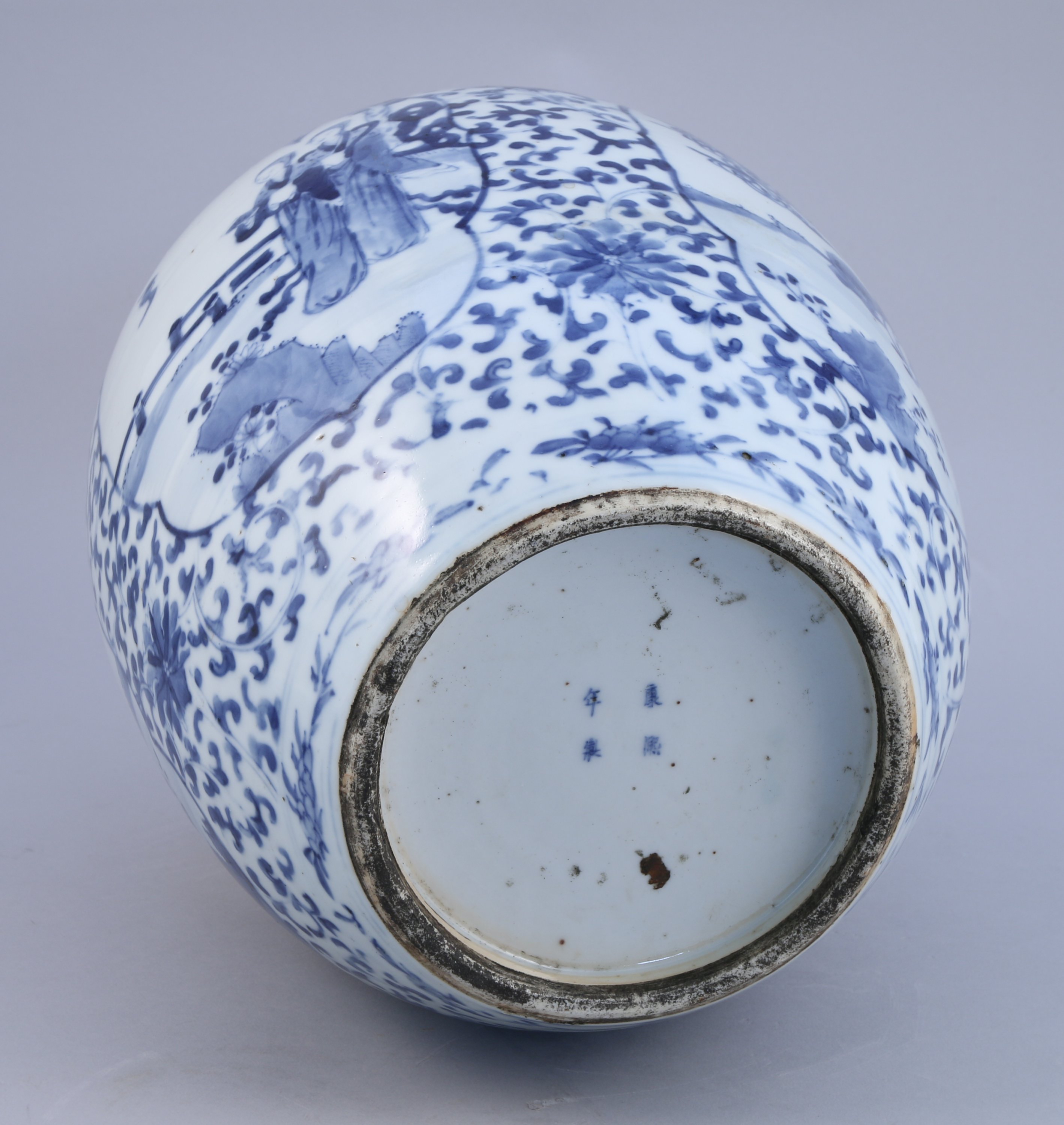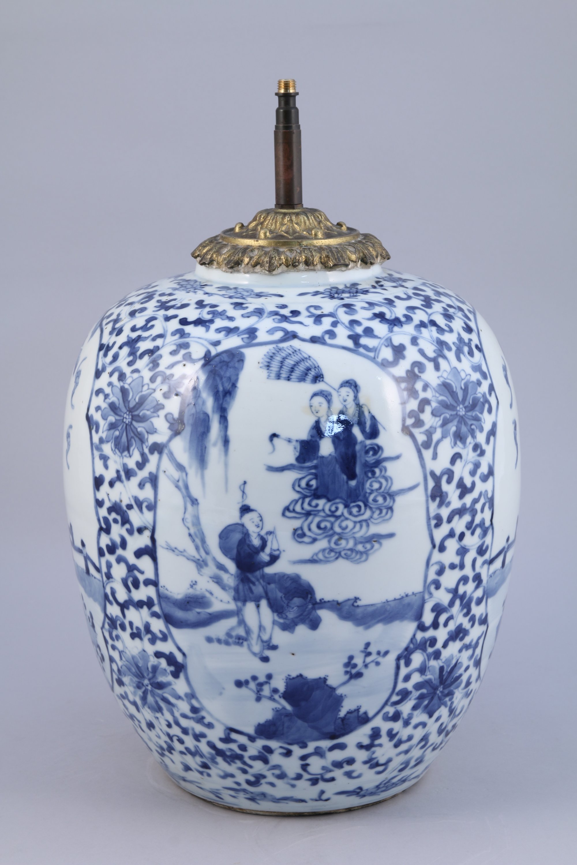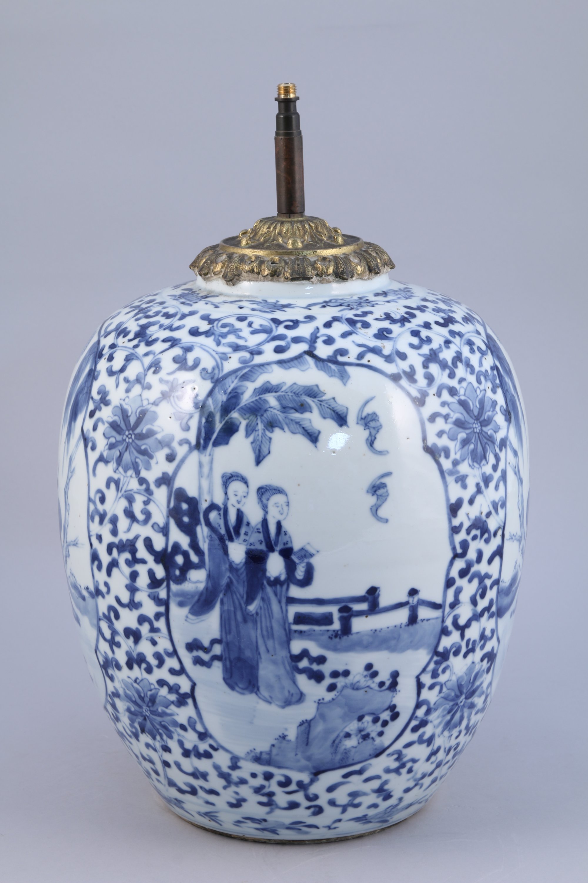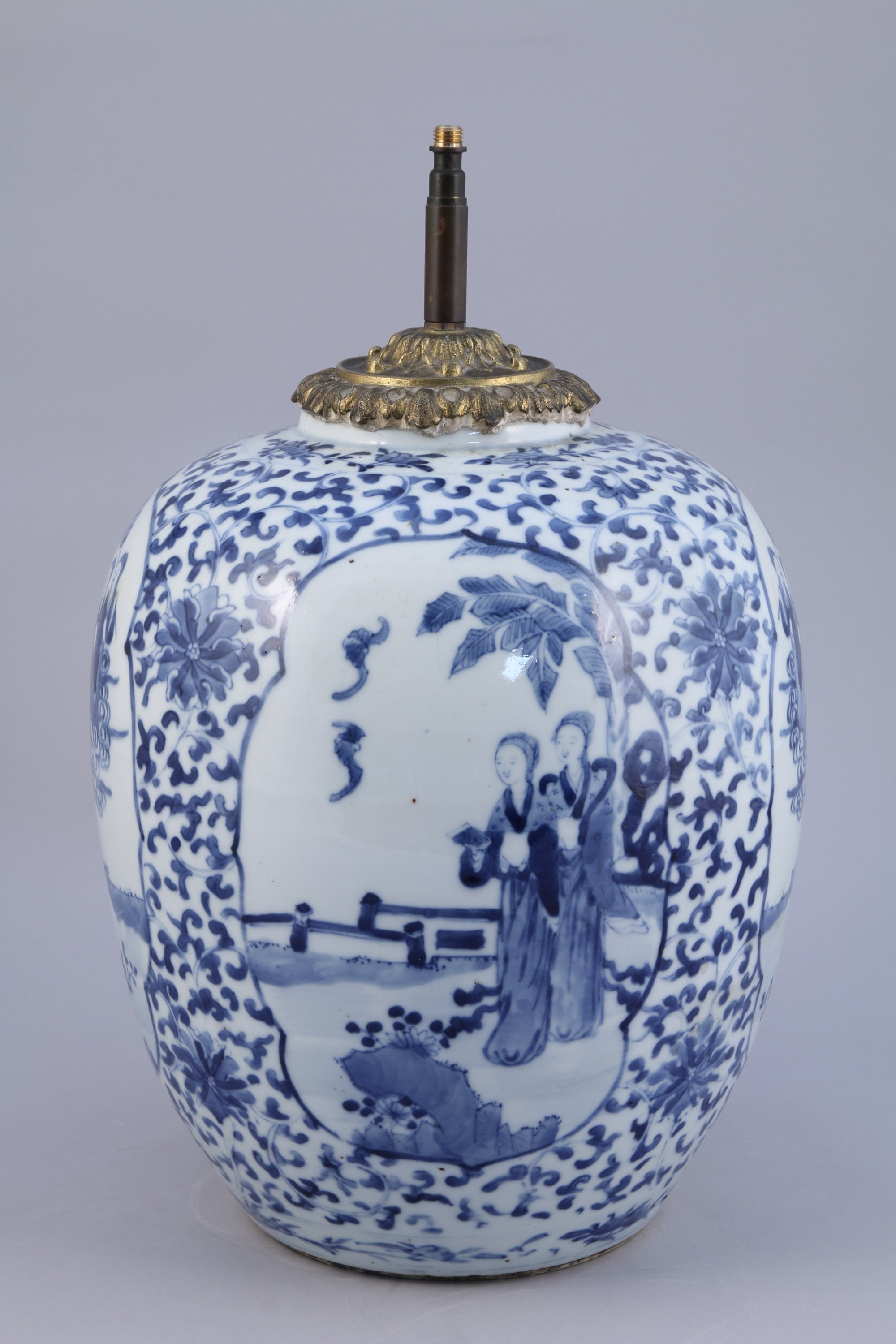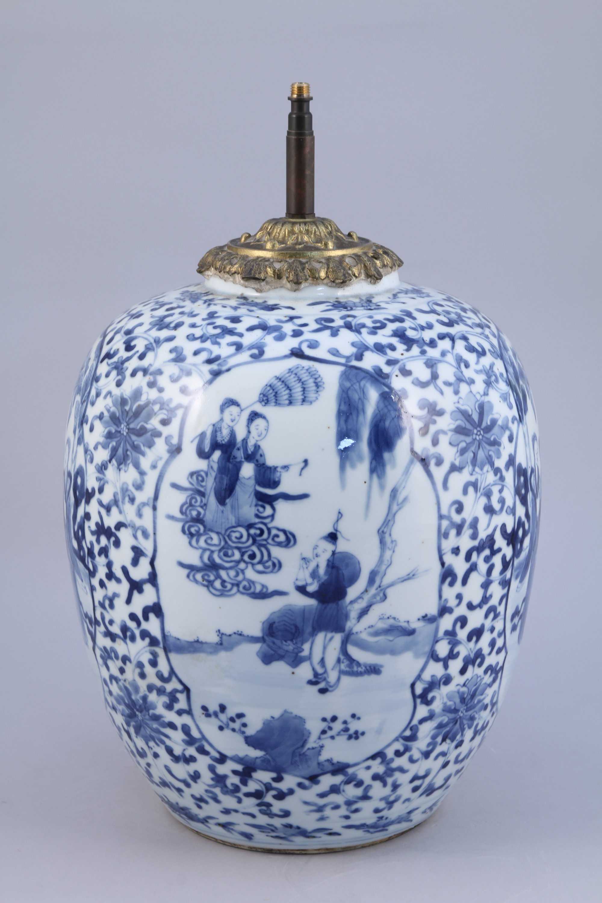 POT en porcelaine à décor en bleu sous couverte de jeunes femmes et bouvier dans des jardins, sur fond de lotus stylisés et de rinceaux. Au revers, marque apocryphe de Kangxi. Monté en lampe.