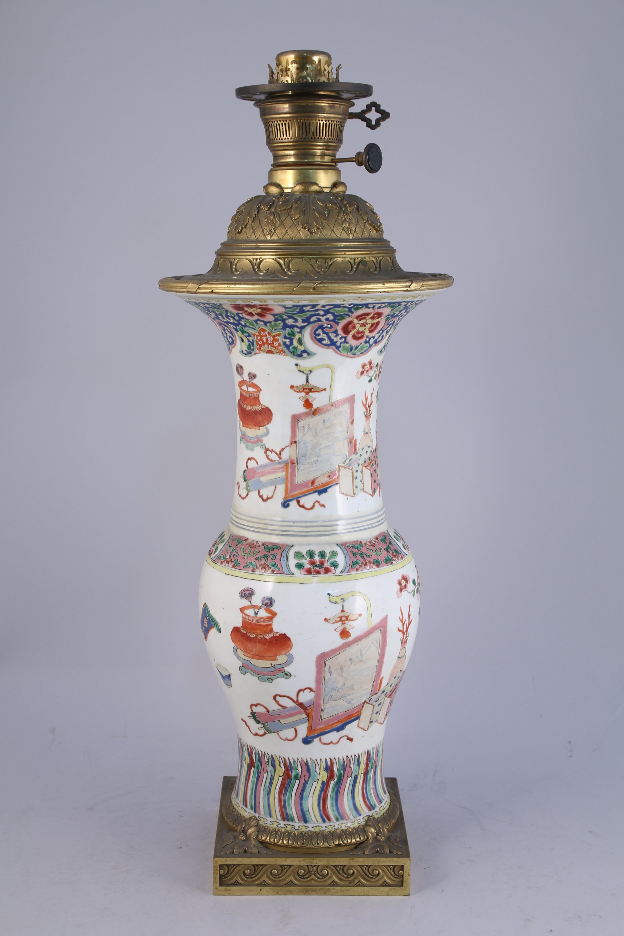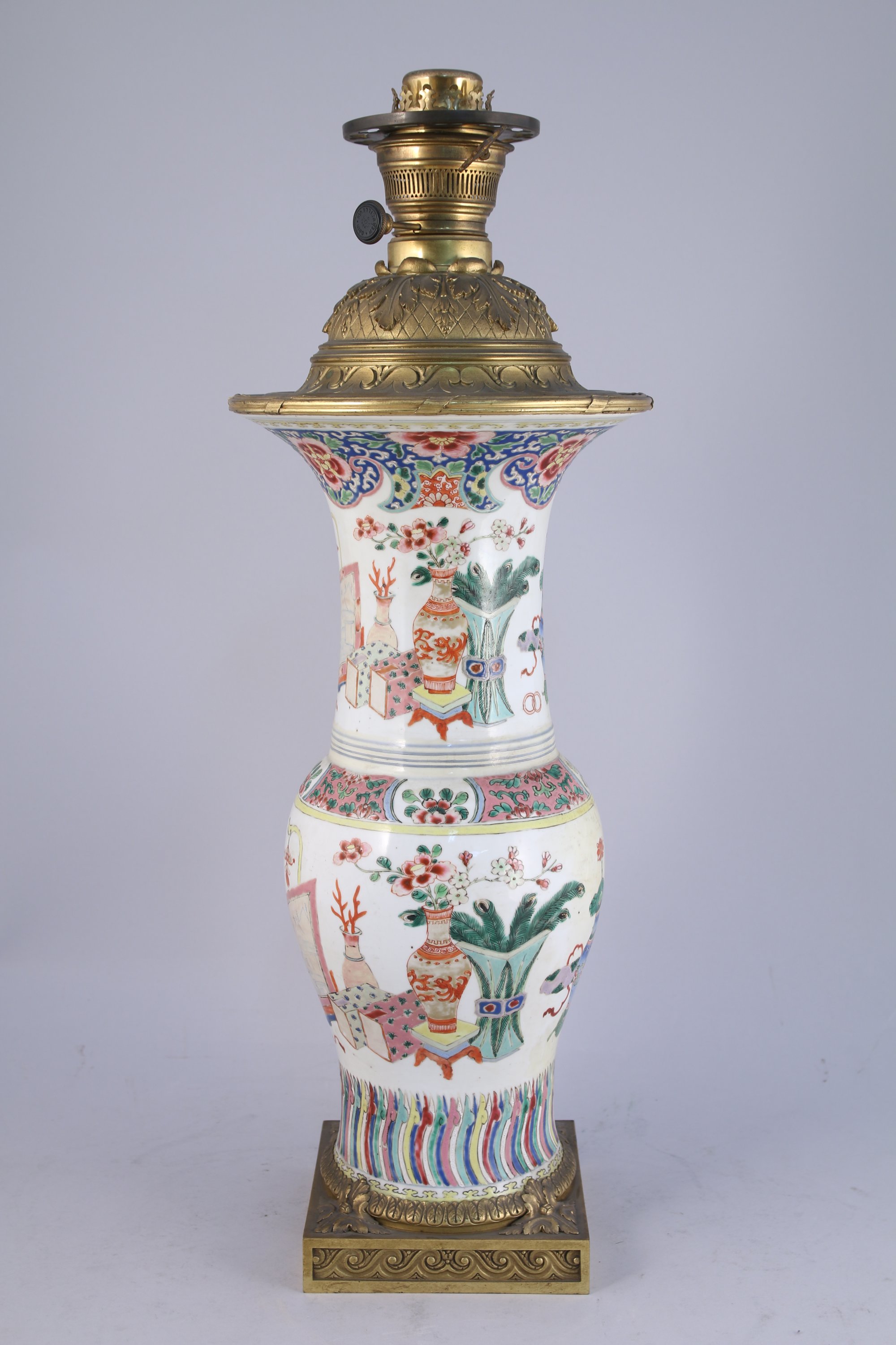 VASE de forme yanyan en porcelaine à décor en émaux polychromes de la famille rose d'objets de lettrés, l'épaule et le col ornés de frises de fleurs stylisées dans leur feuillage.