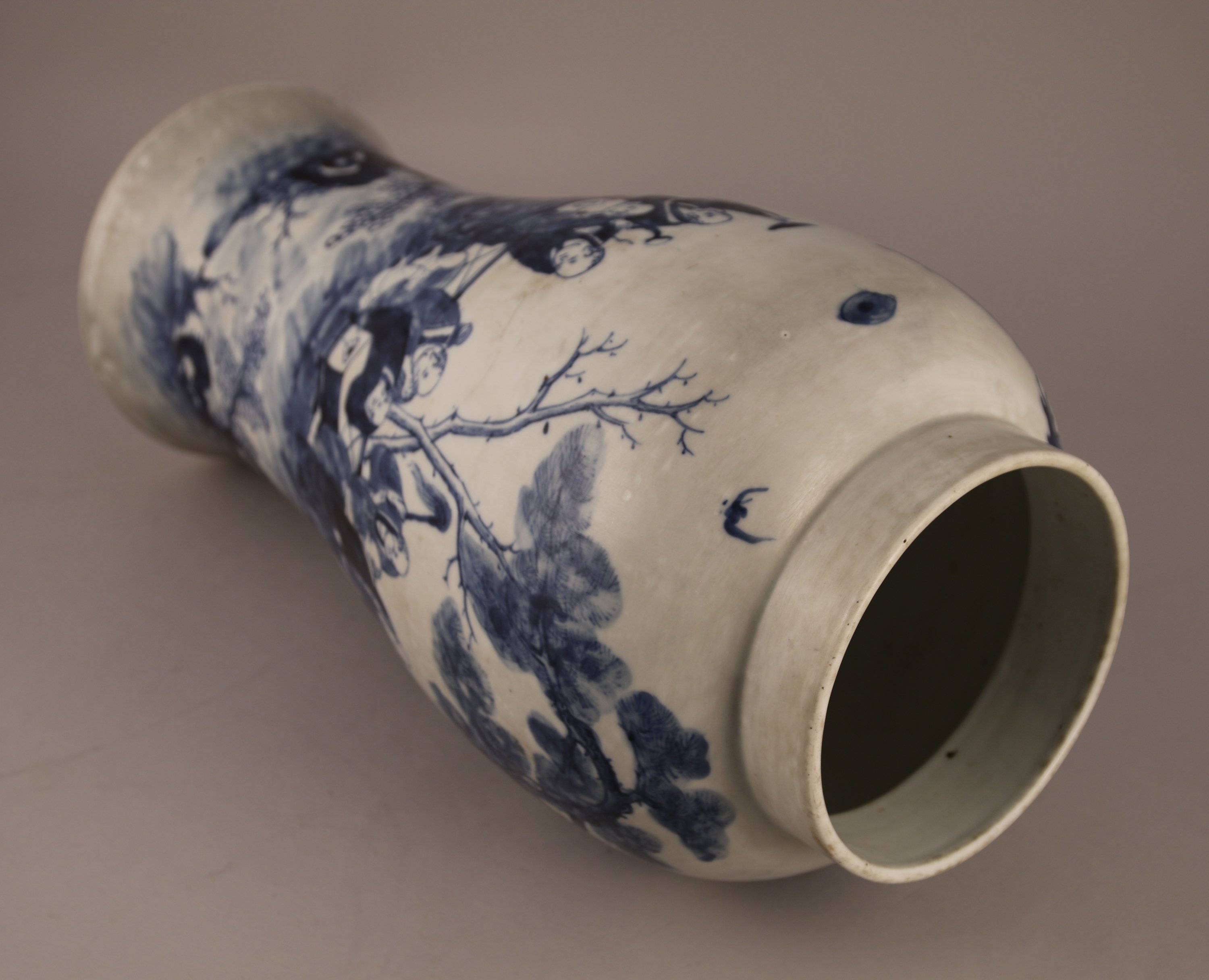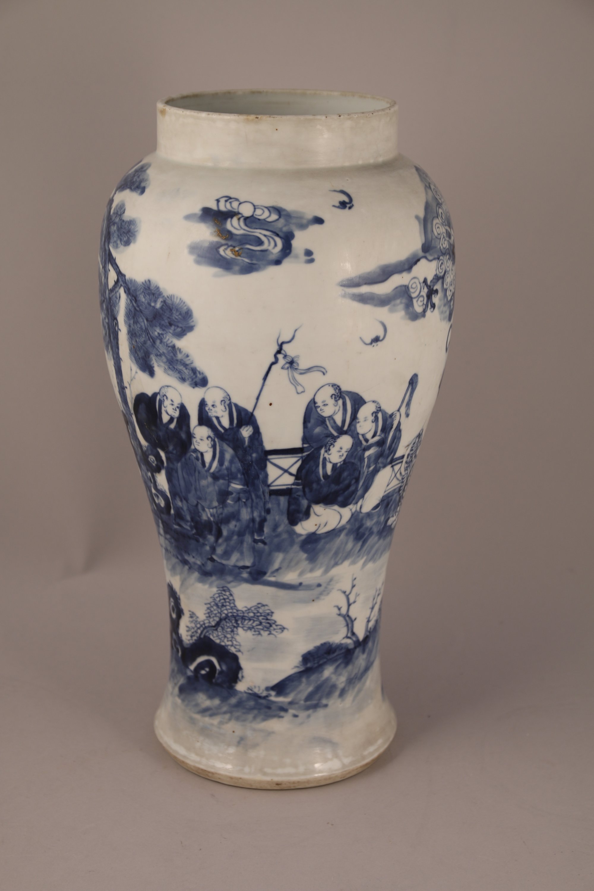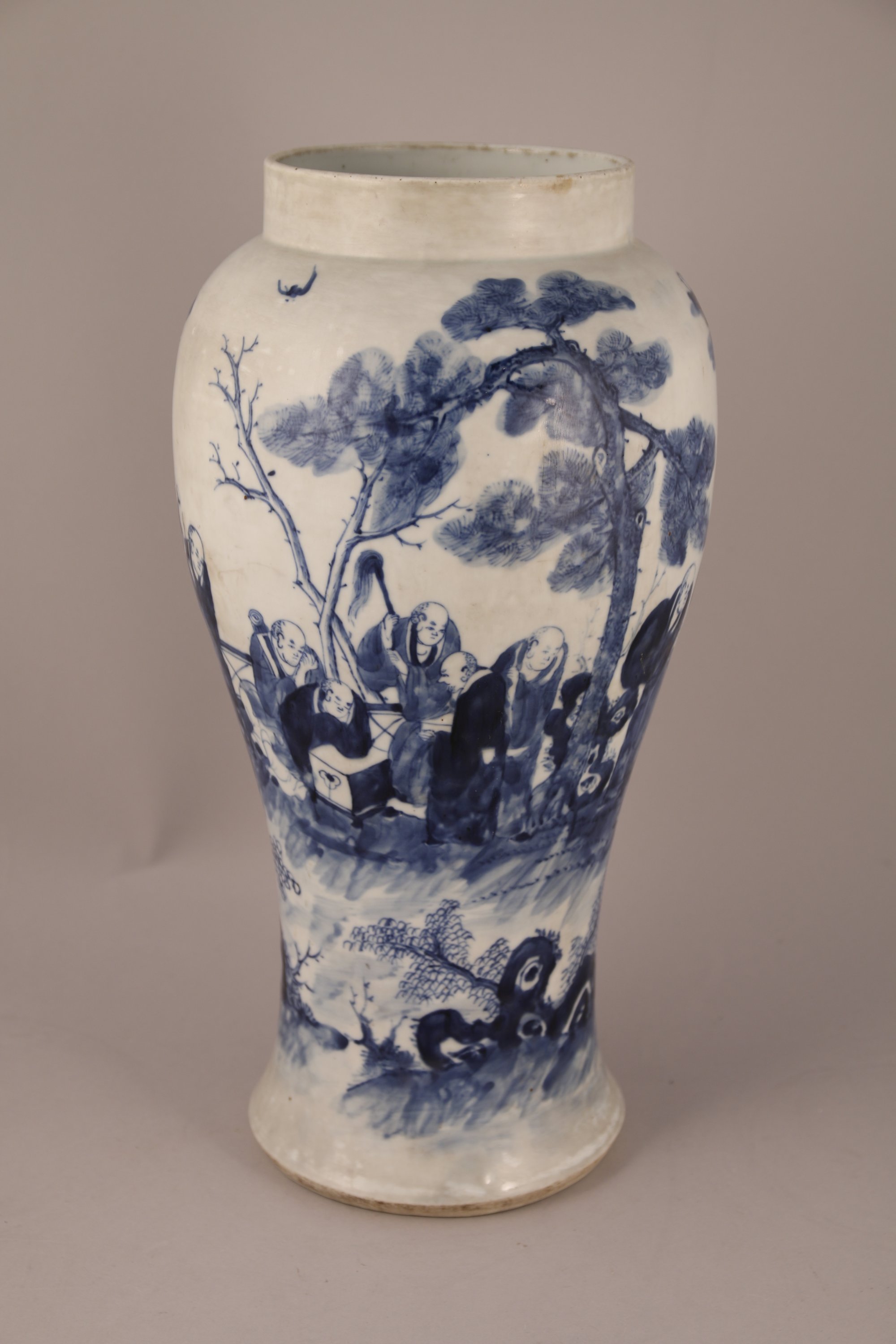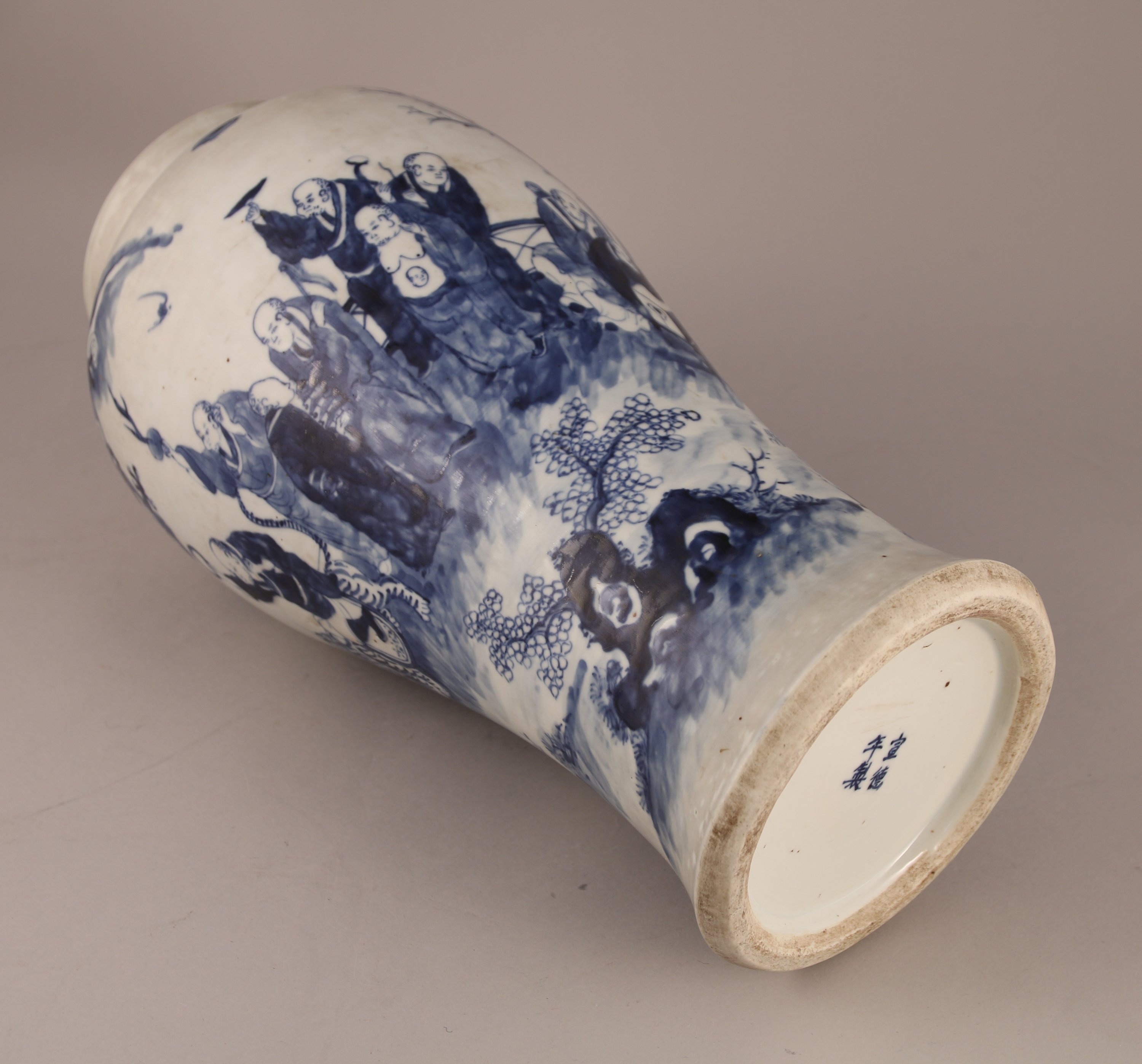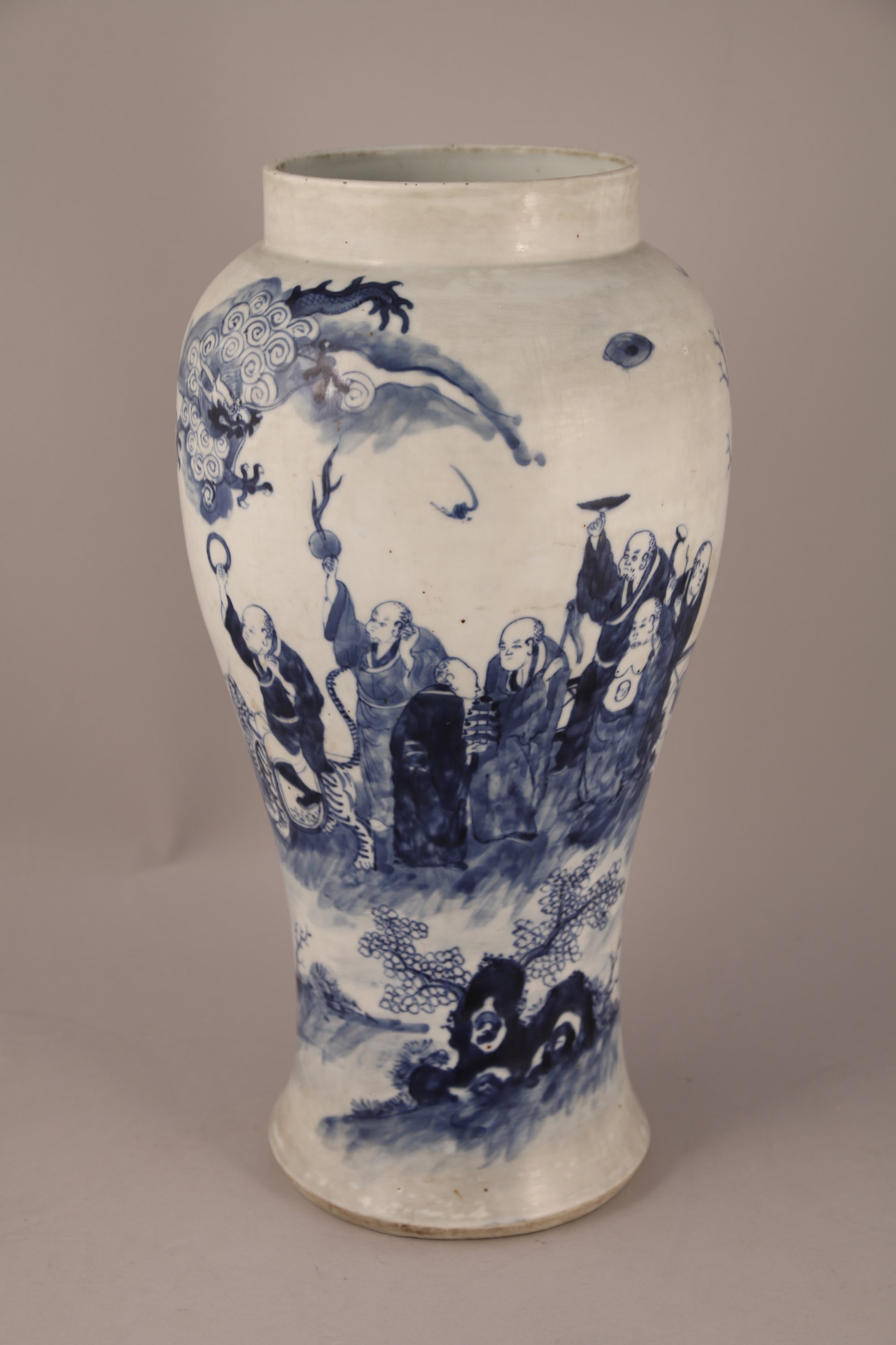 VASE de forme balustre à haute panse en porcelaine bleu blanc à décor de Luohan sous les pins avec chimères et dragons. Au revers, la marque apocryphe de Kangxi.
