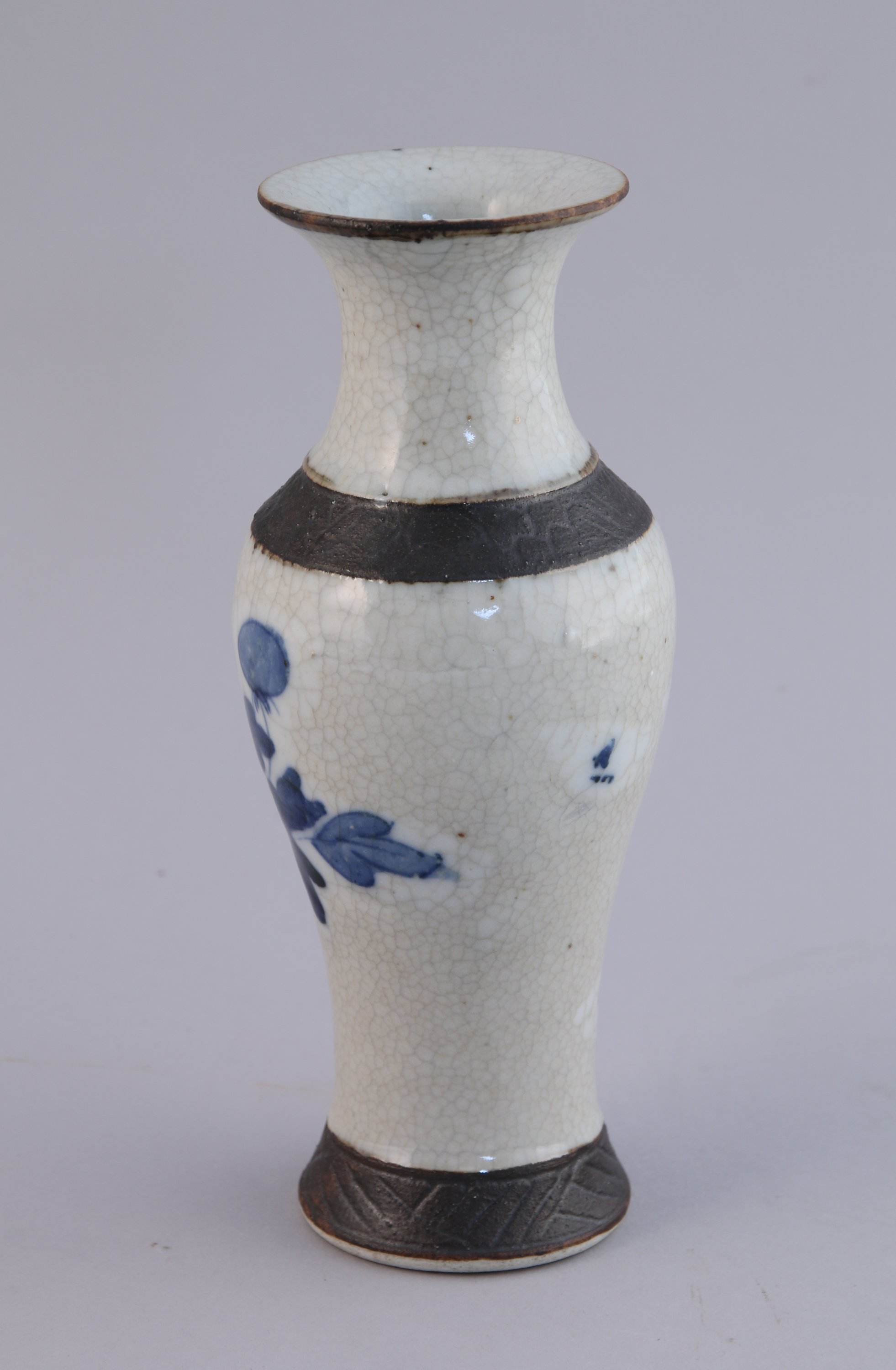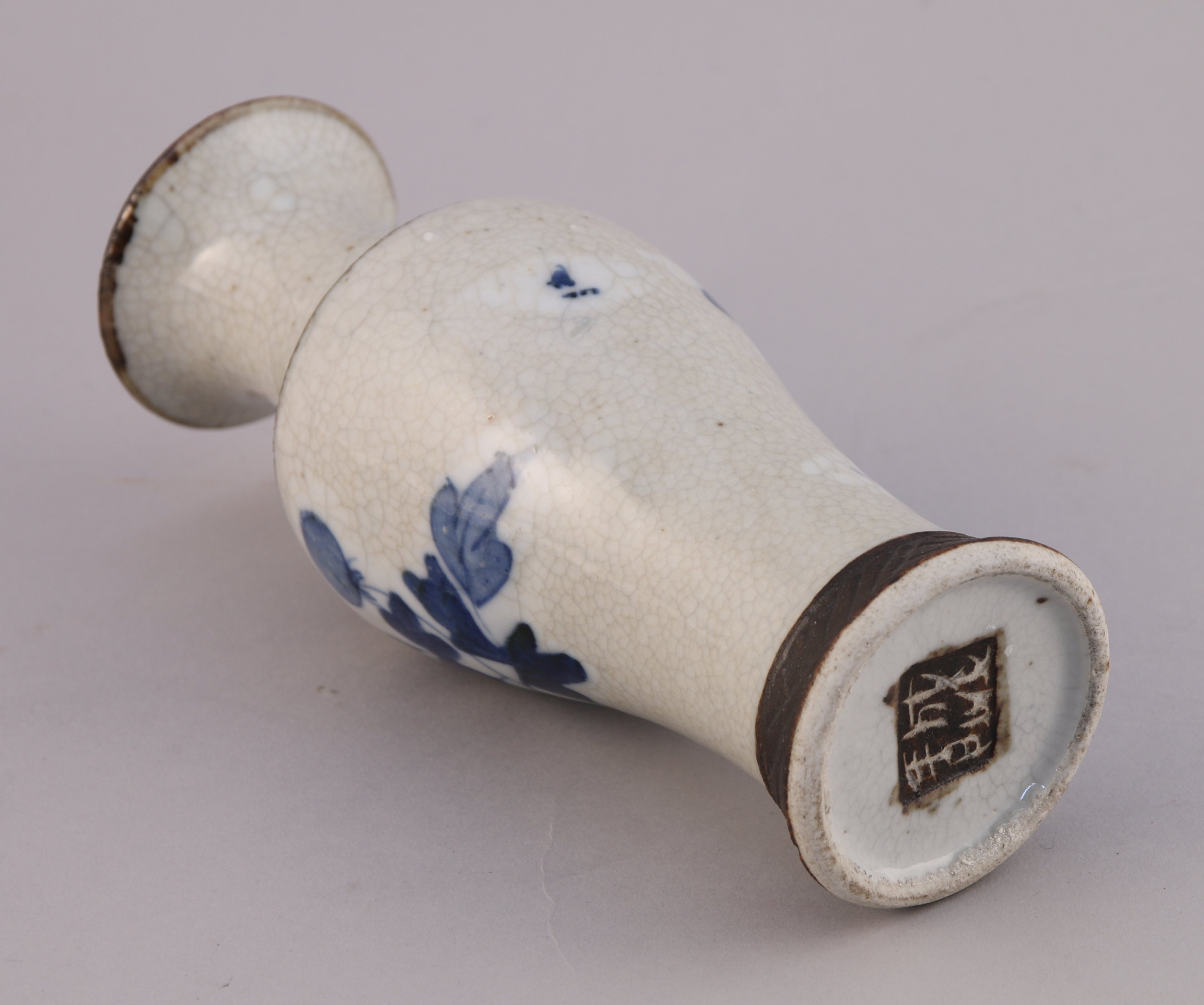 VASE chinois, en porcelaine à fond craquelé et décor bleu et blanc, peint à la main d'un motif d'oiseau, de bouquet et de feuillages. Estampe sous la base.