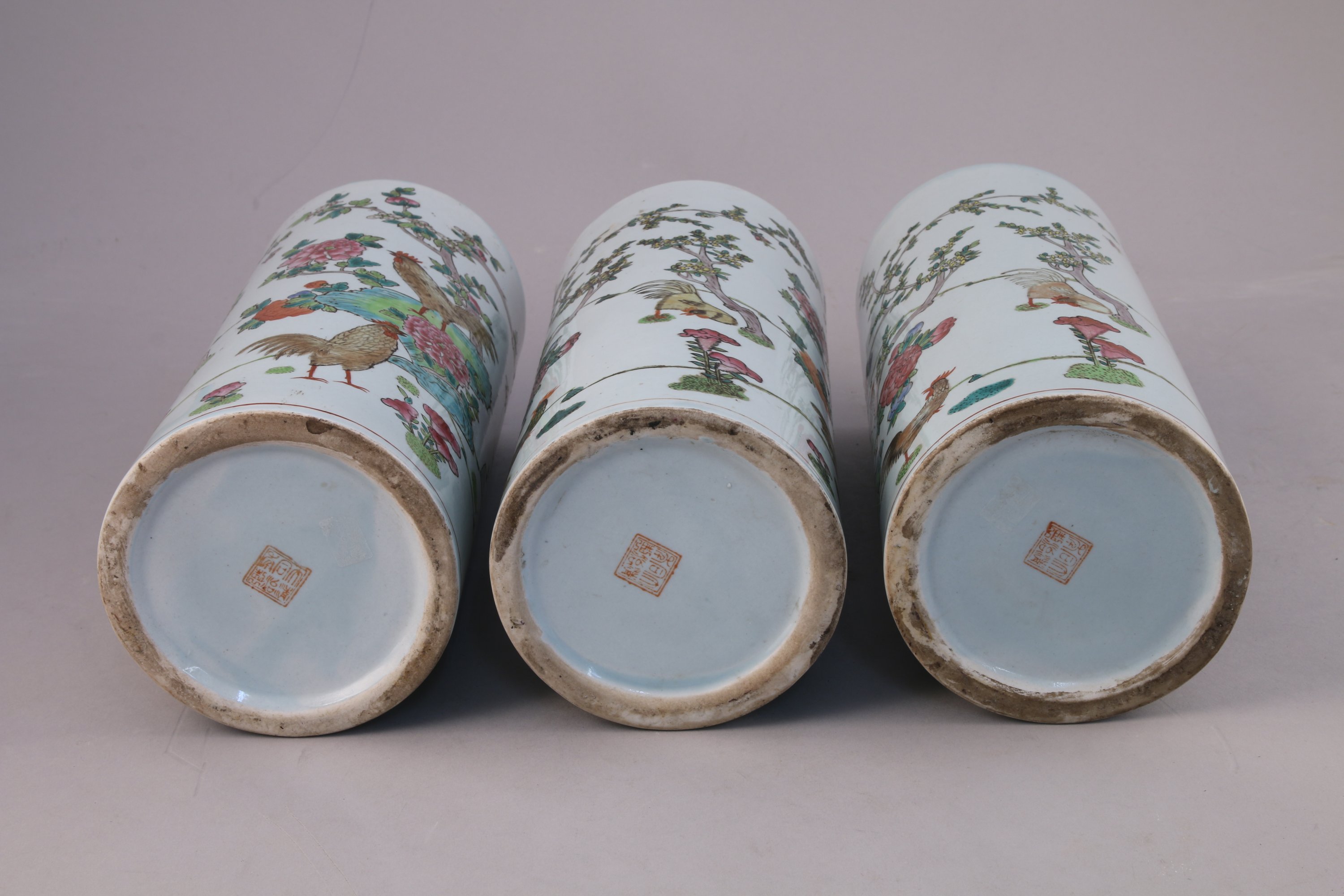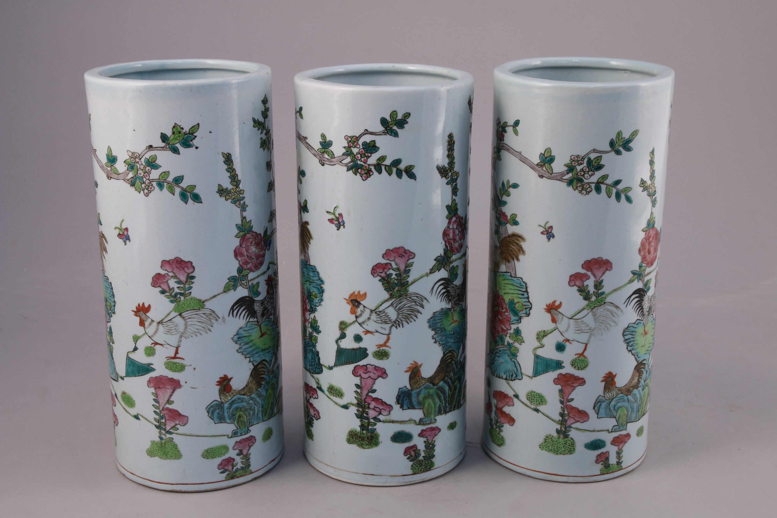 Suite de trois VASES rouleau en porcelaine polychrome à motif de coqs dans des branchages.