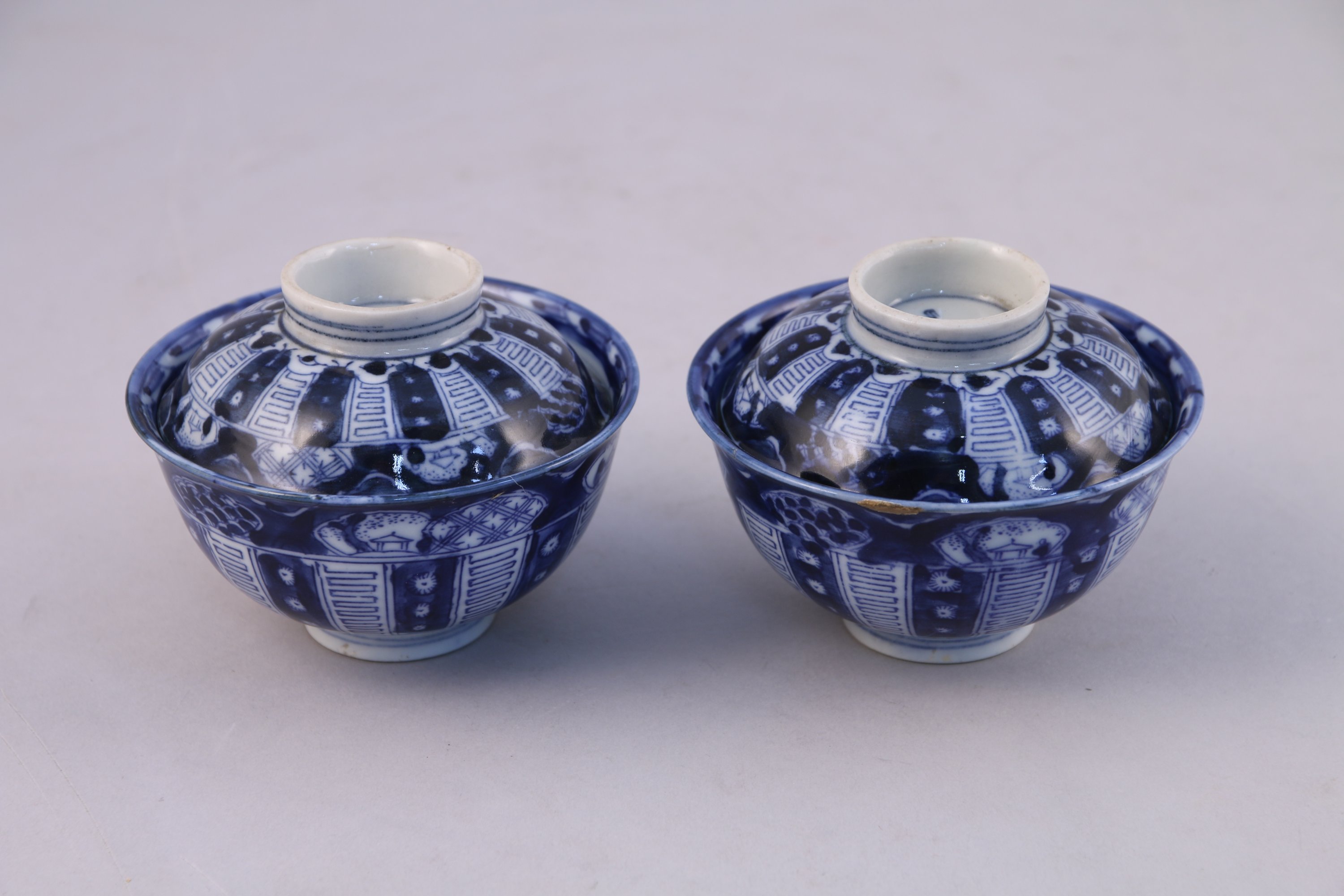 JOINT : CHINE. Paire de SORBETS couverts de forme circulaire en porcelaine blanche et bleue. Marques. Haut. 9, Diam, 11 cm.