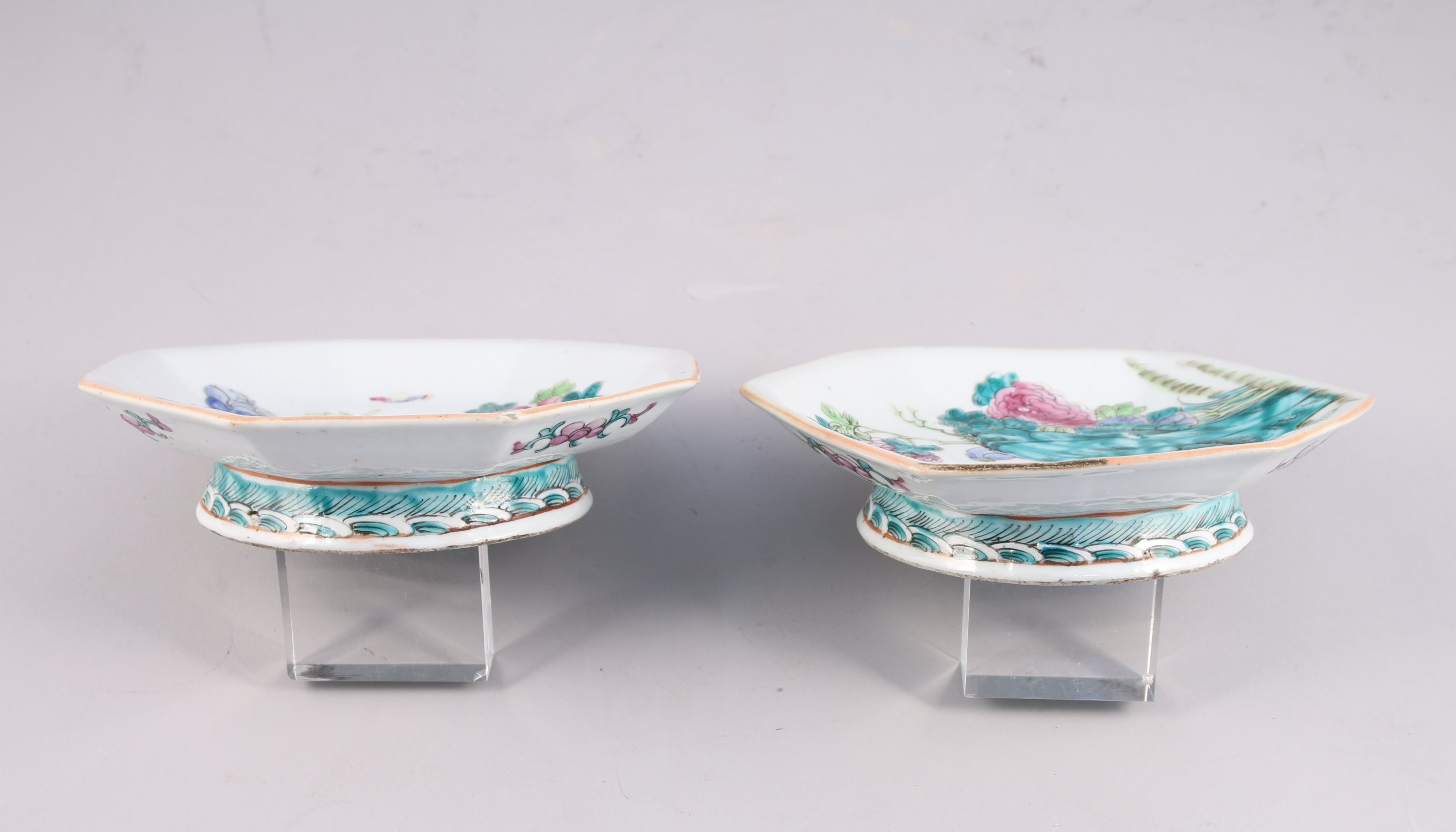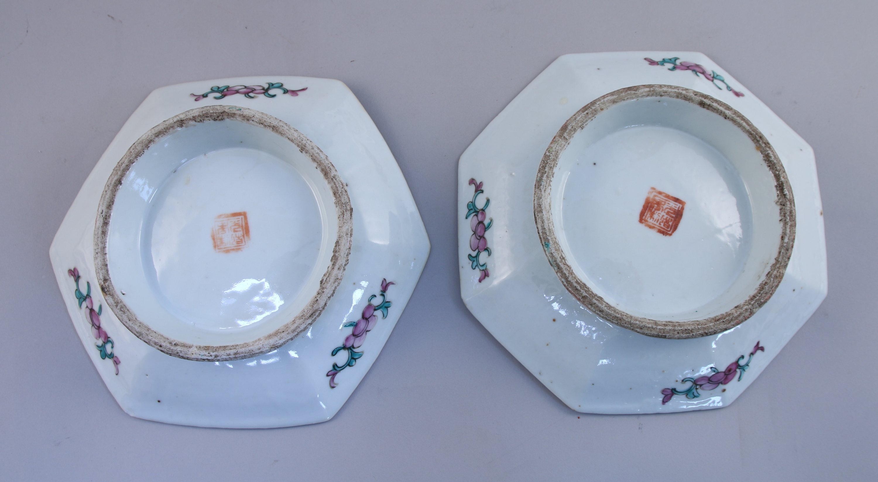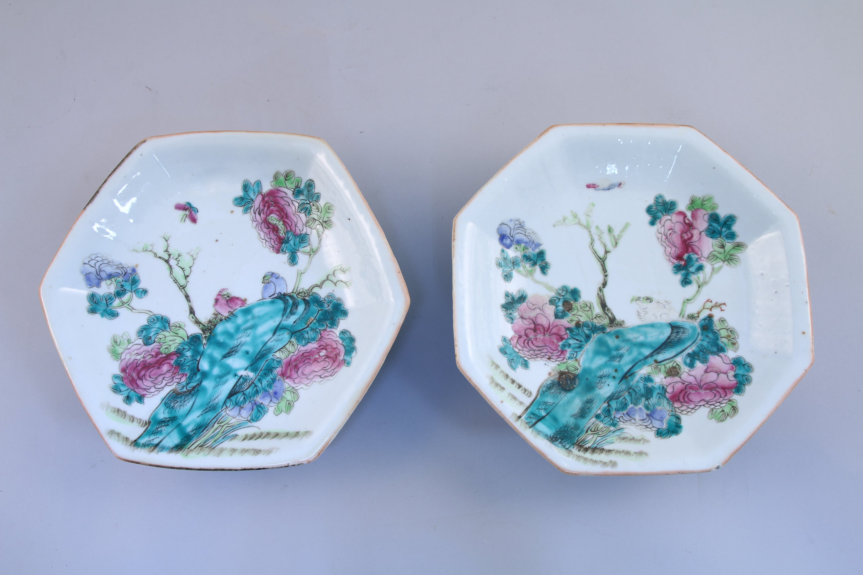 Paire d'ASSIETTES de forme hexagonale en porcelaine à décor polychrome d'oiseaux et lapin sur un rocher fleuri. Marque au dos.