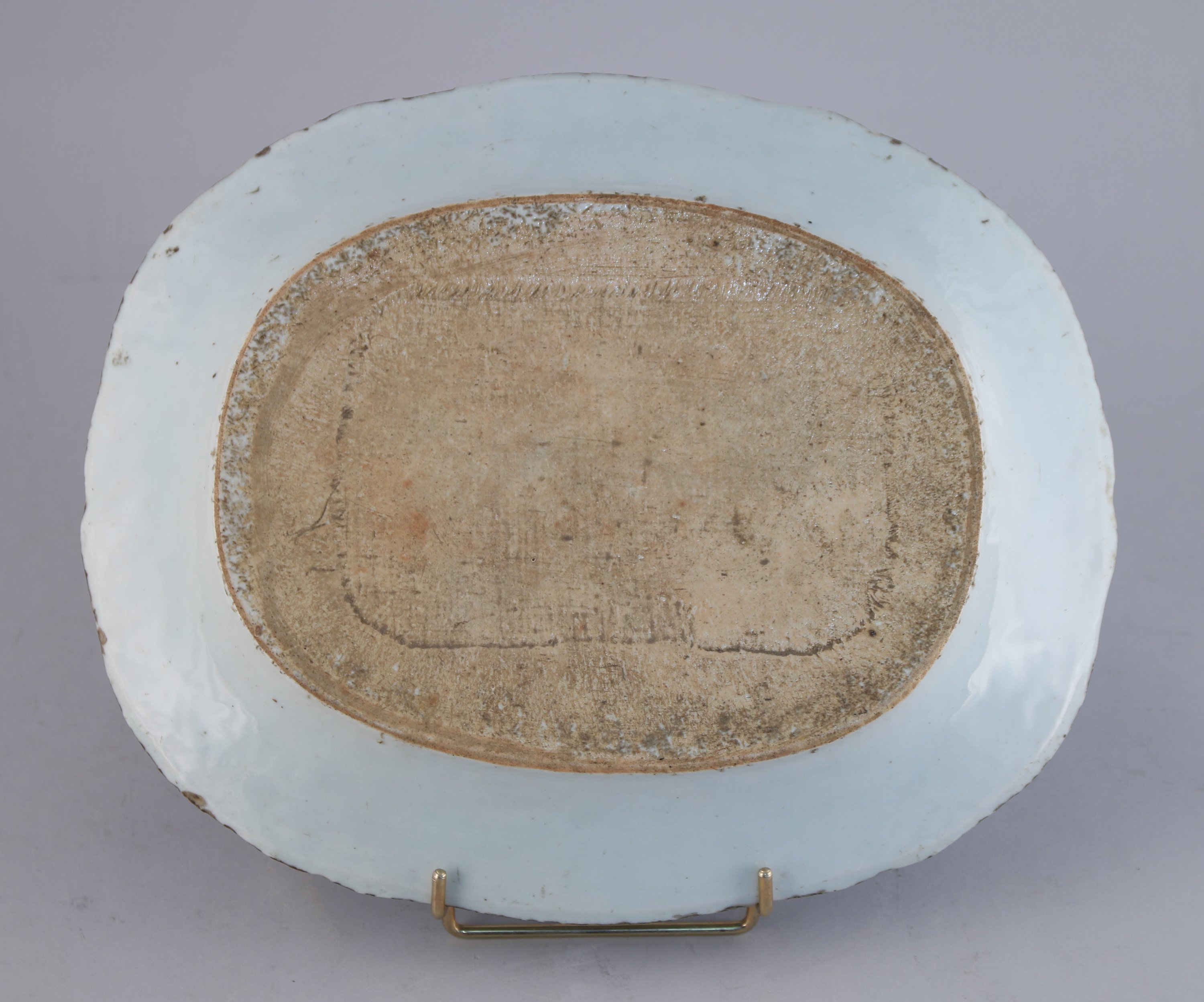PLAT de forme ovale à bords contournés en porcelaine bleue et blanche. La bordure de l'aile et le marli ornés de frises végétales et géométriques, le bassin décoré de fleurs.