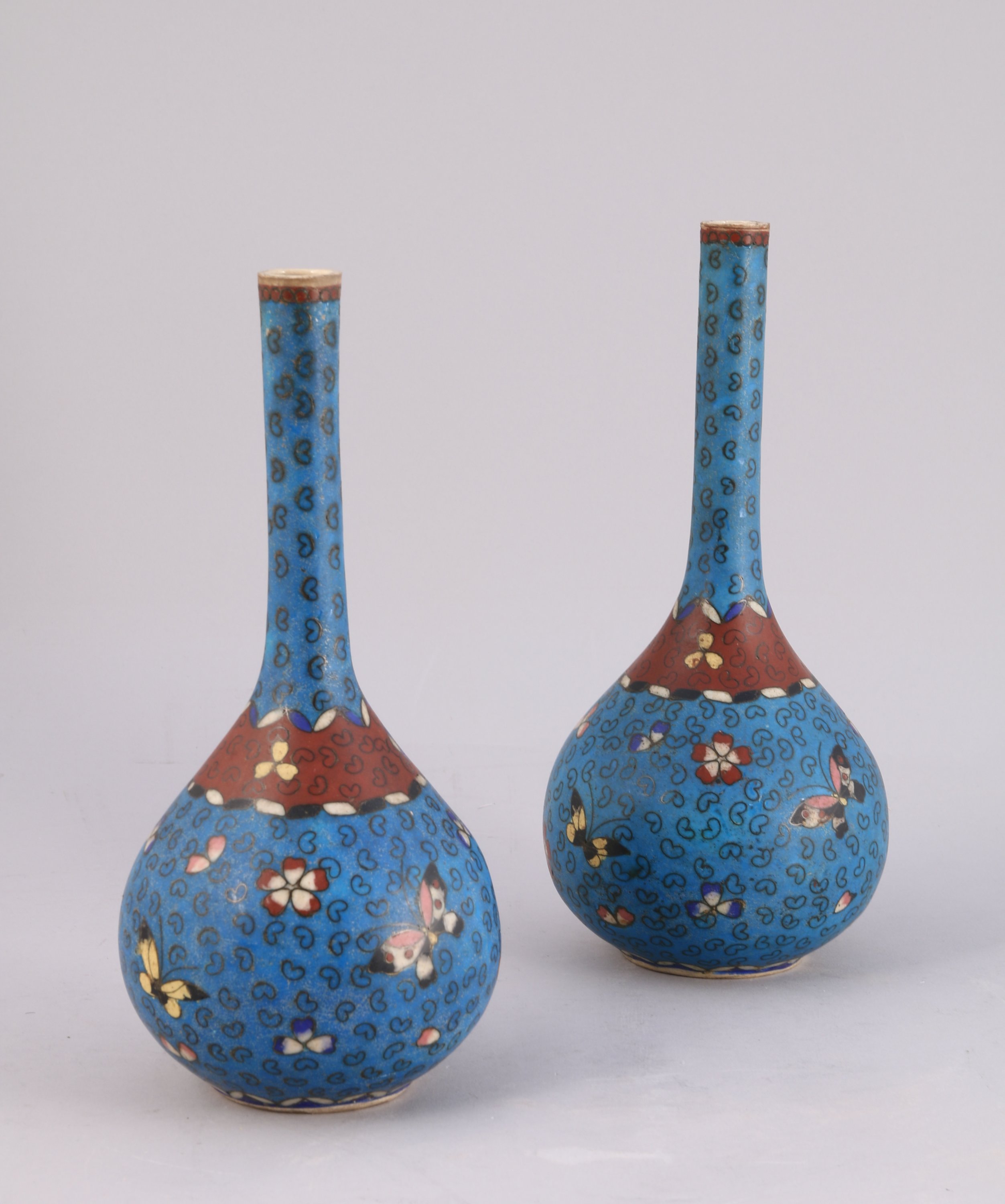 Paire de VASES BOUTEILLES aux cols allongés en porcelaine émaillée sur fond bleu imitant le cloisonné. Décor de papillons et fleurs épanouies.