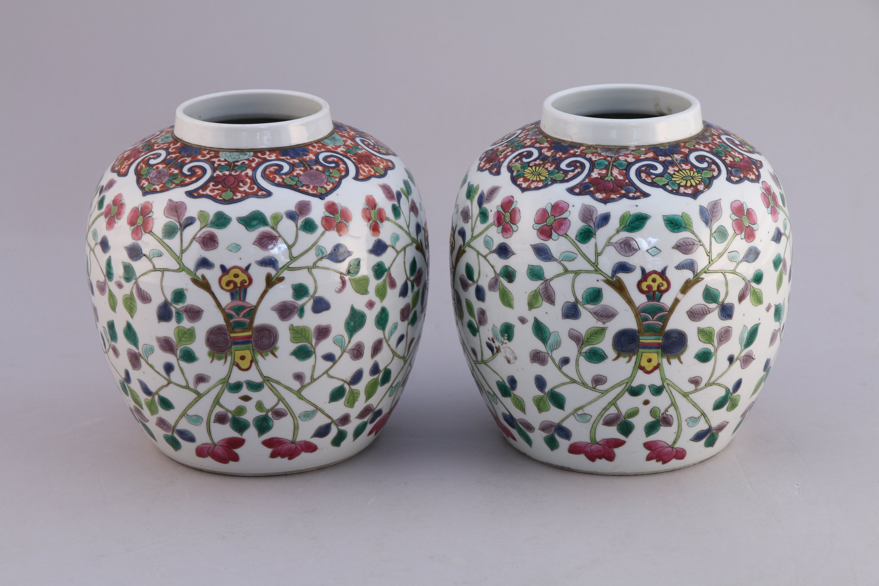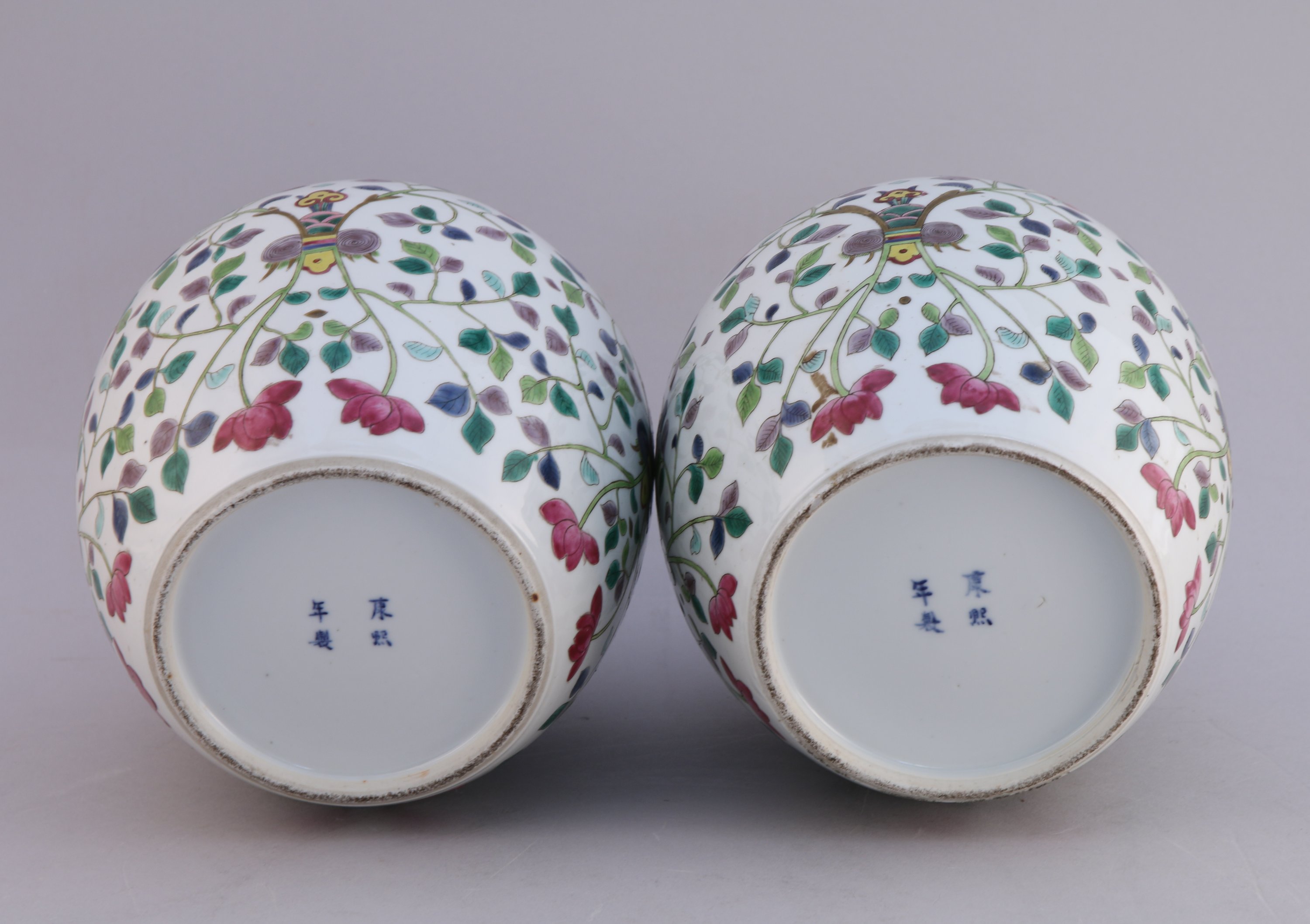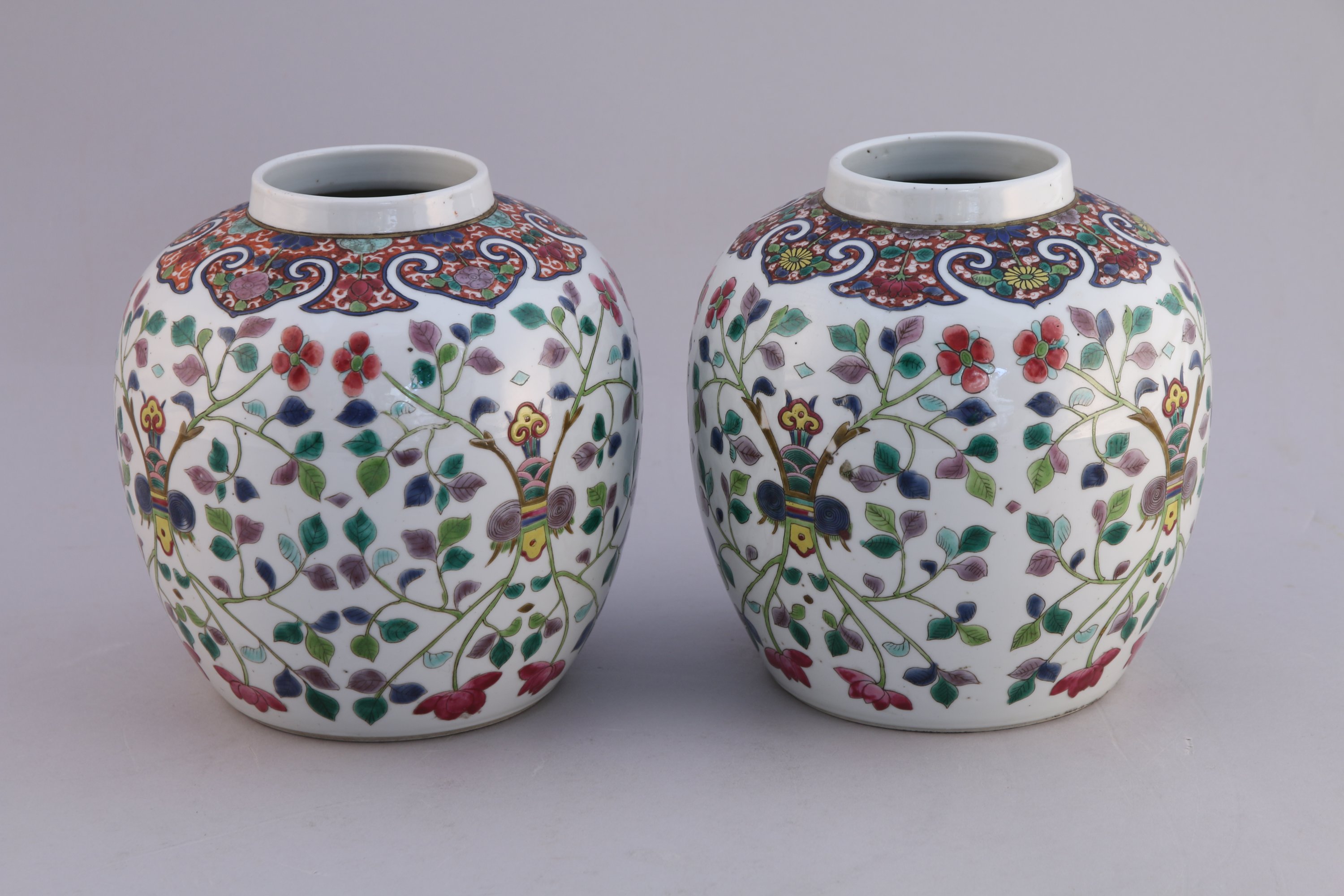 Paire de POTS À GINGEMBRE en porcelaine émaillée polychrome à décor feuillagé.