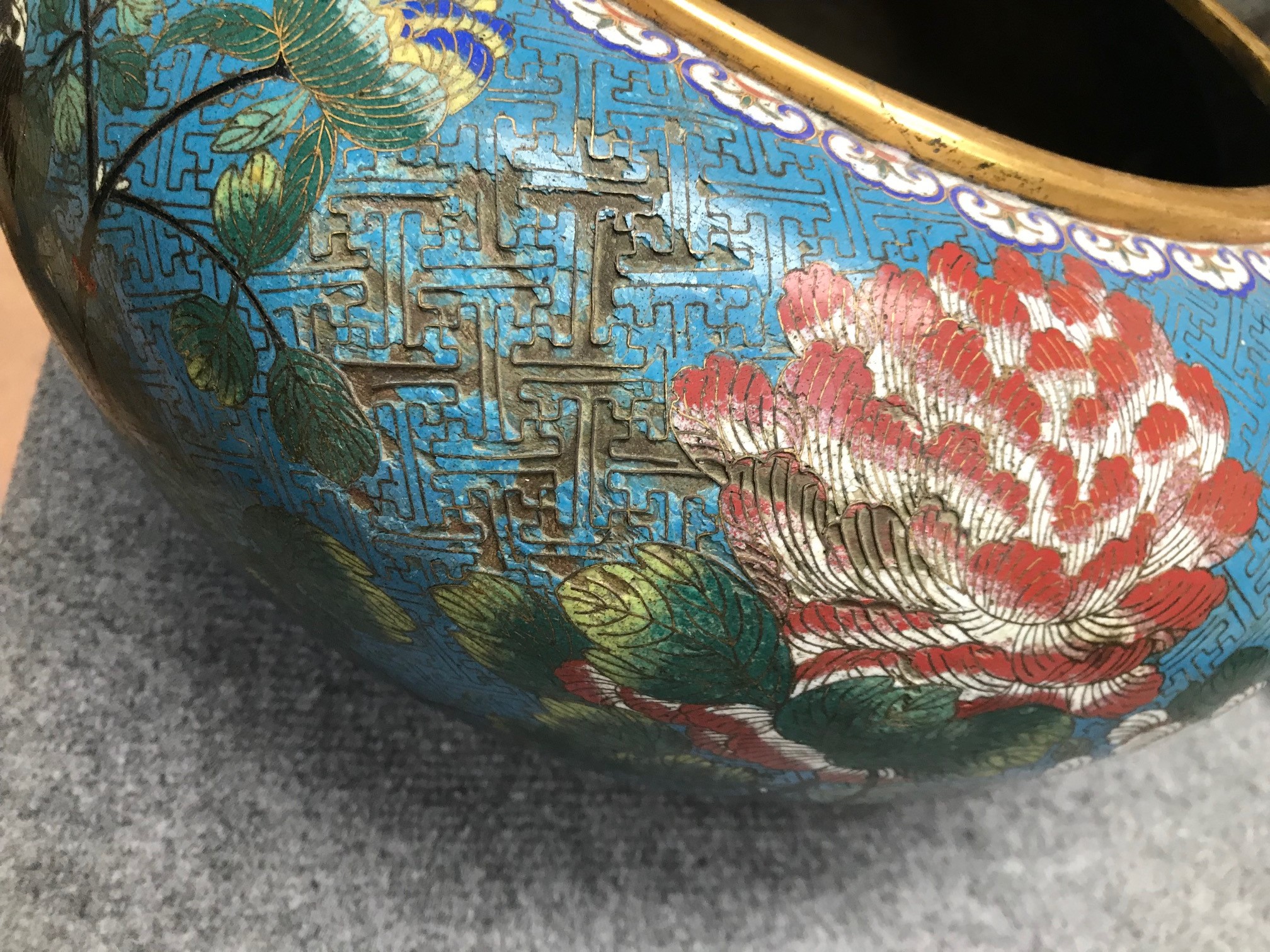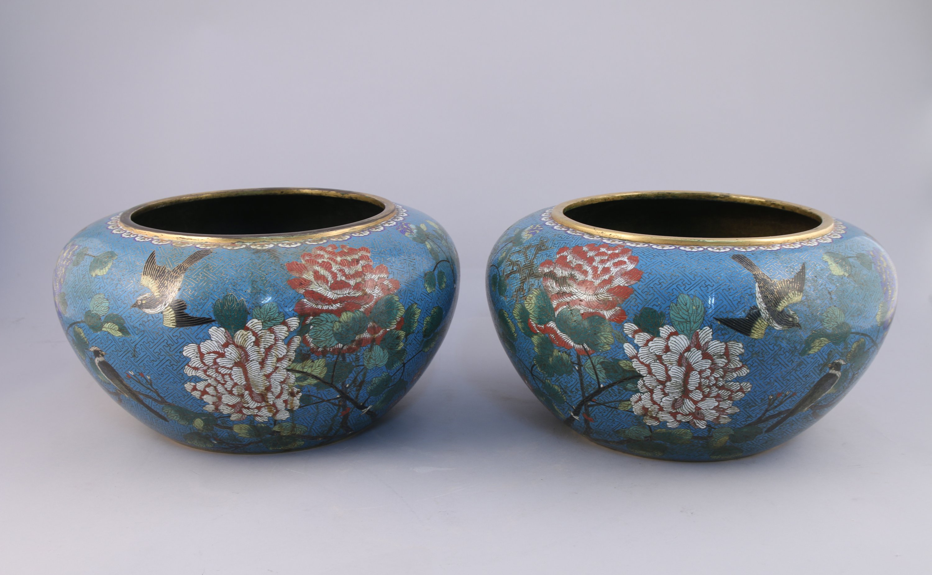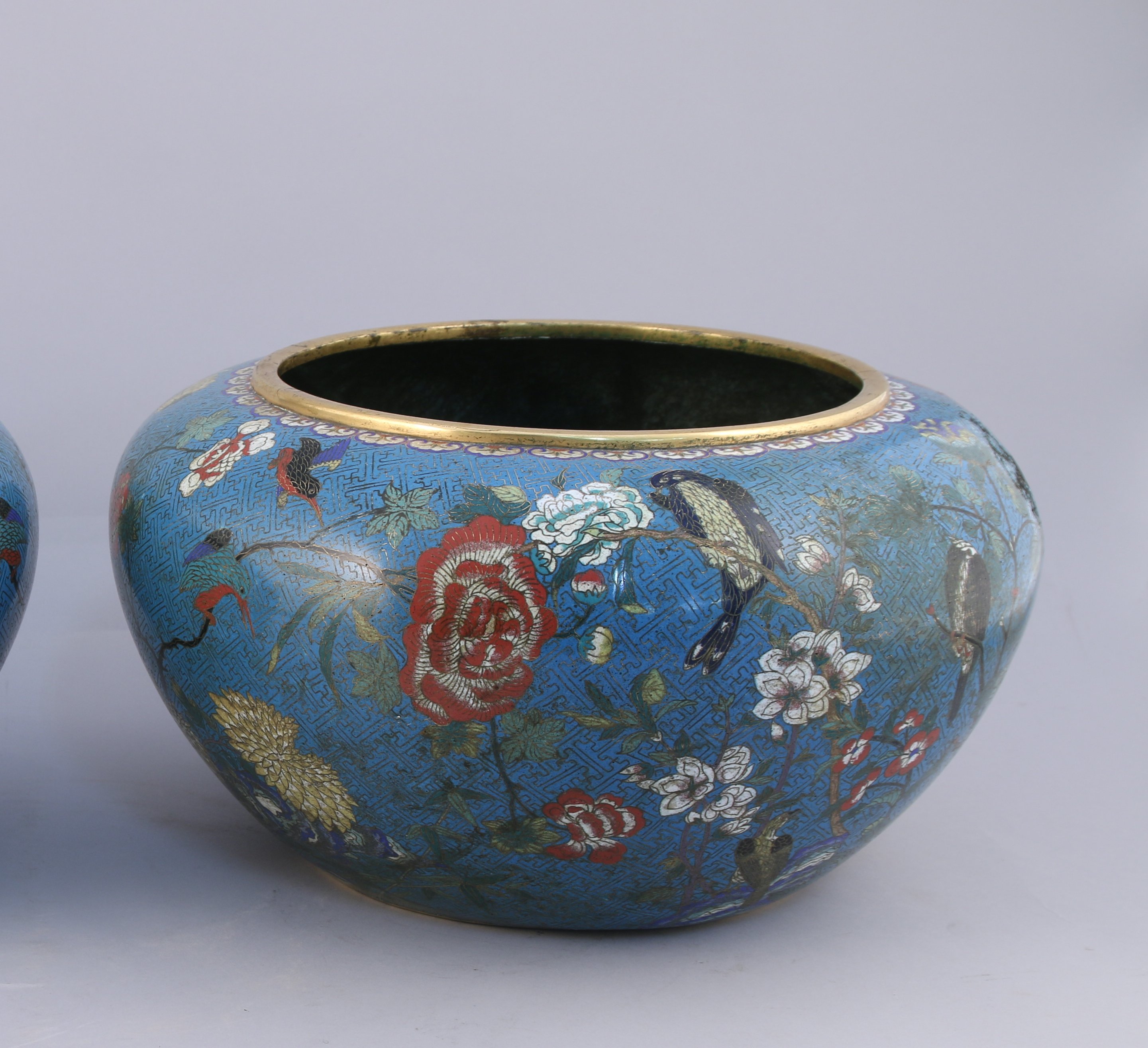 Paire de VASQUES en bronze et émaux cloisonnés à décor d'oiseaux parmi les pivoines en fleurs, sur fond turquoise à motifs de svastika, le rebord orné d'une frise de lingzhi. Marque De Cheng.