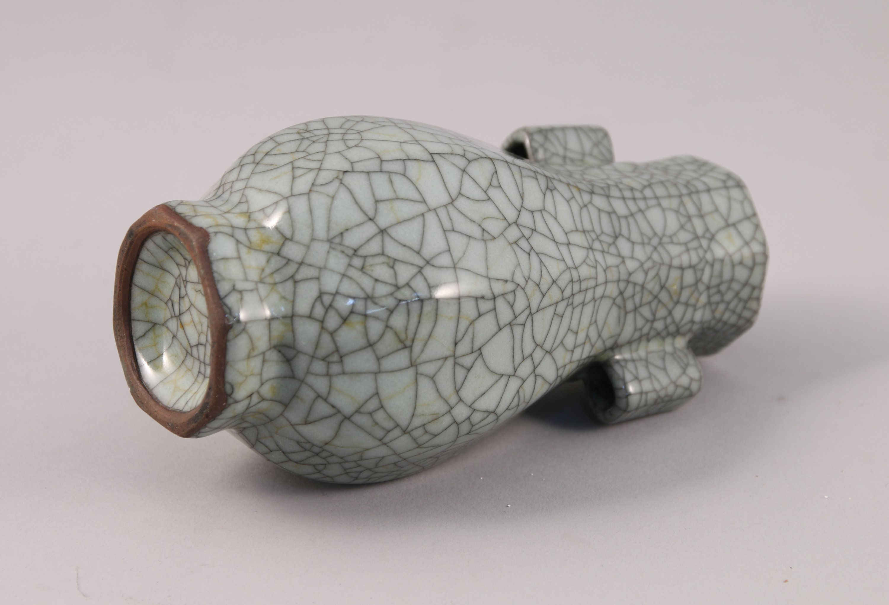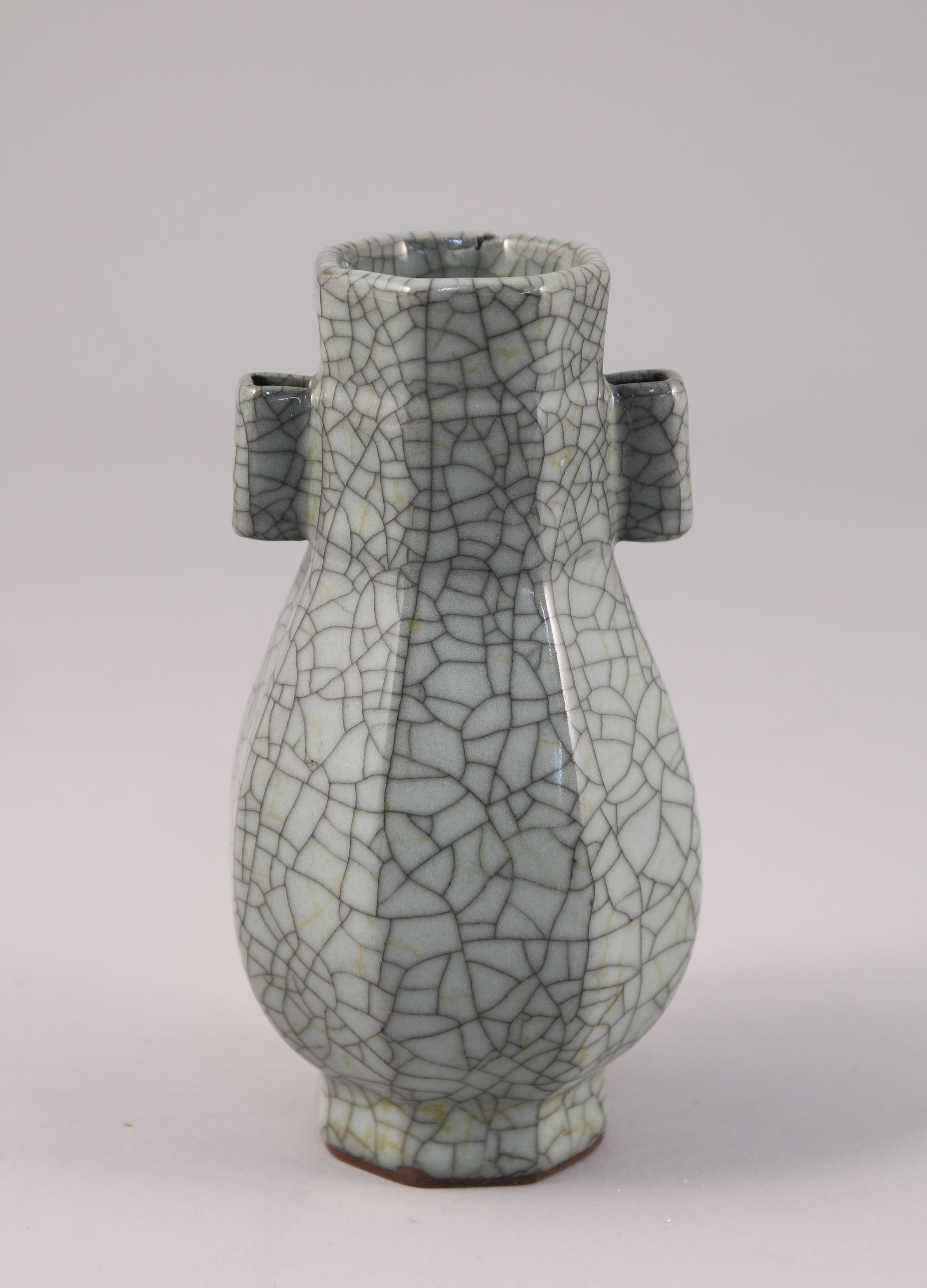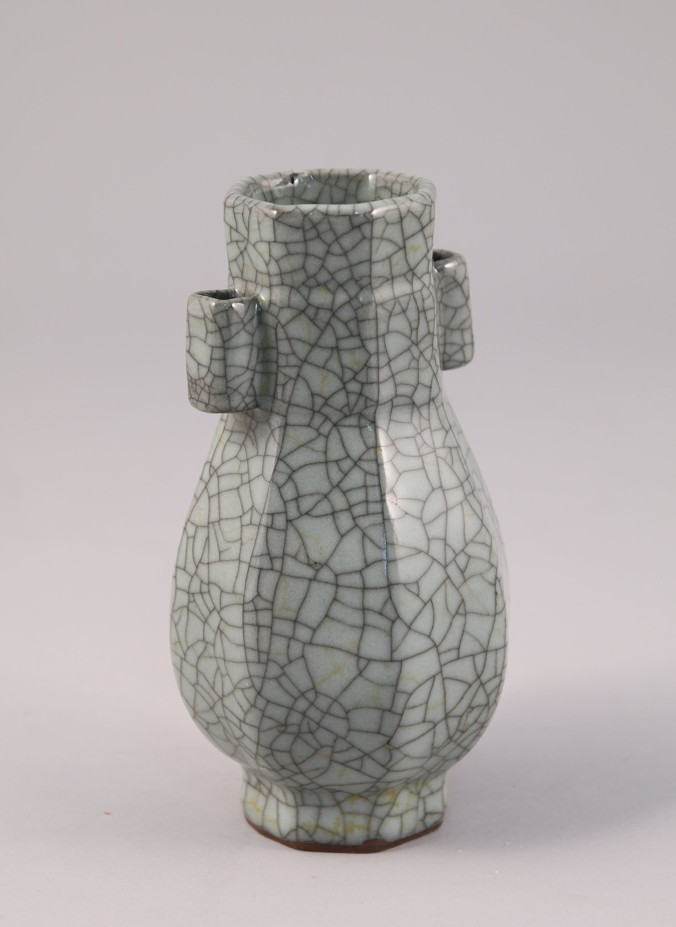 VASE octogonal à couverte gris-vert bleutée dont les craquelures sont légèrement soulignées de brun sombre. Deux anses quadrangulaires en forme de tube. La couverte s'arrête à la base du pied qui présente une couleur brun-noir foncé.