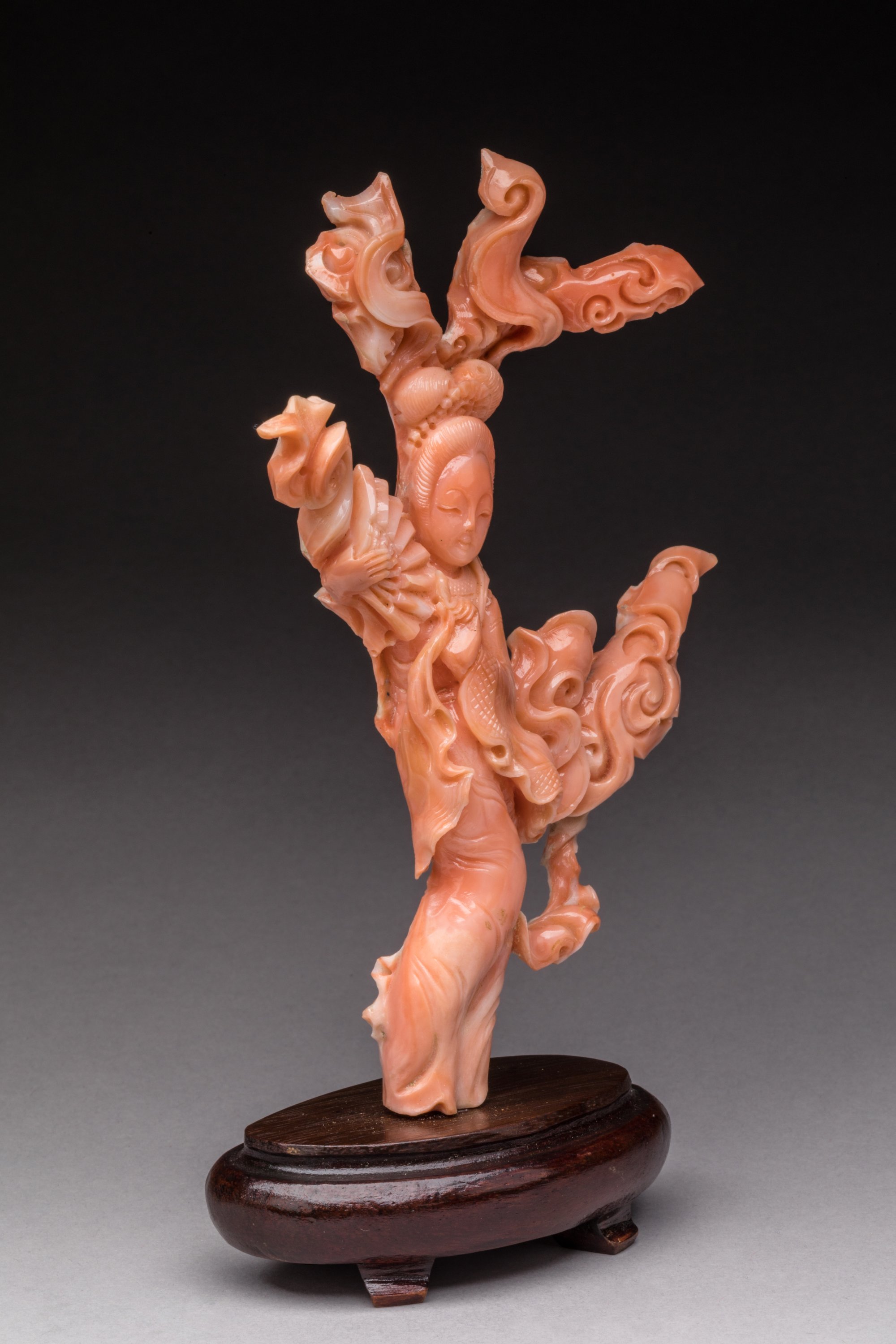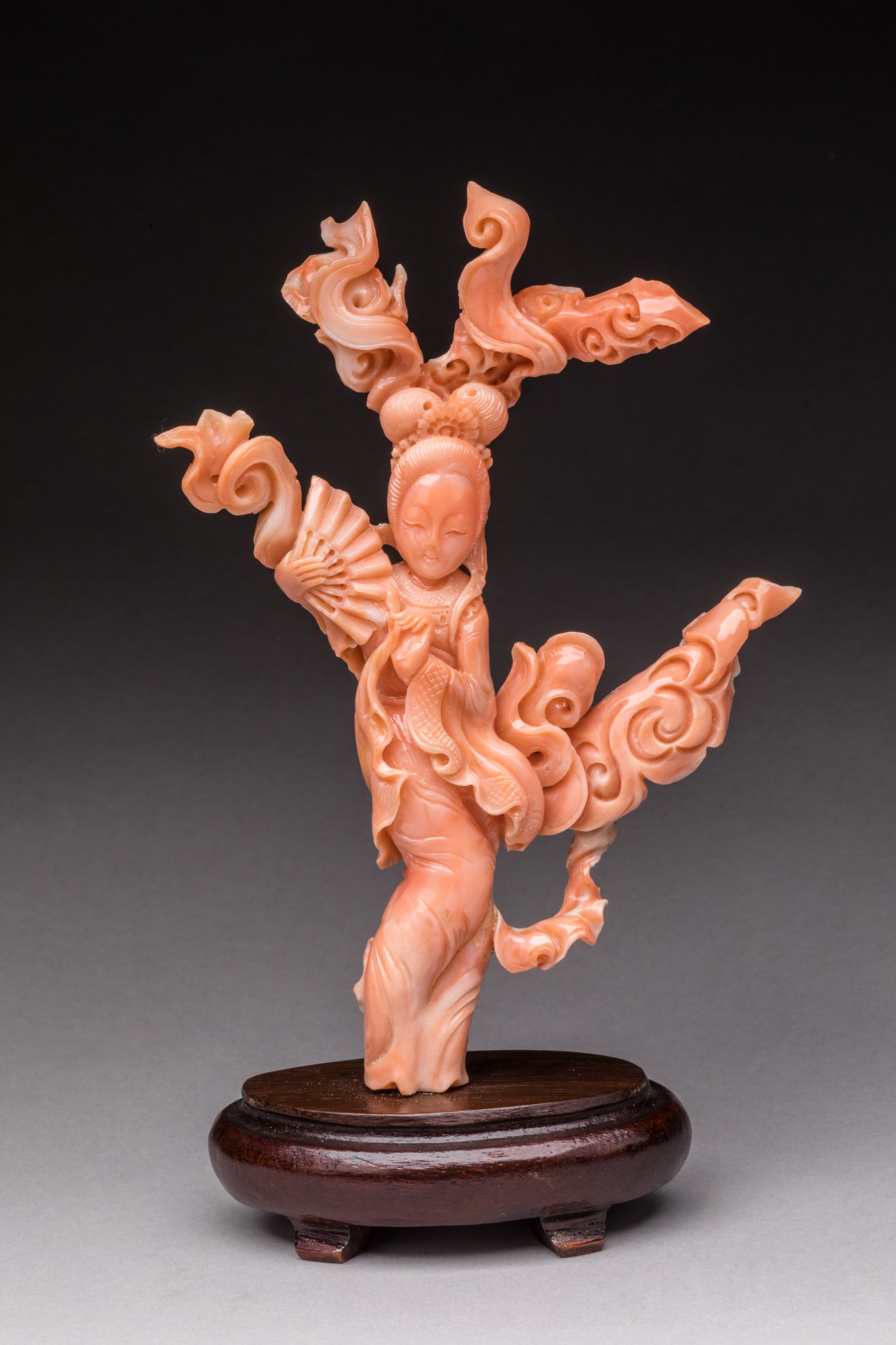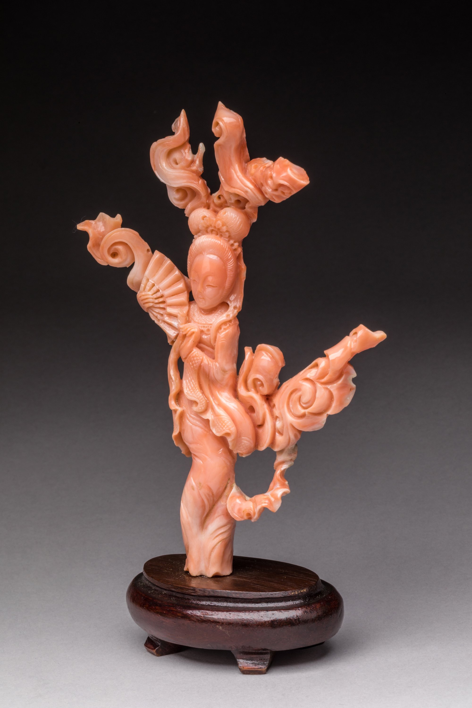 Petit GROUPE EN CORAIL rose, jeune femme debout parmi les nuages, tenant un éventail.