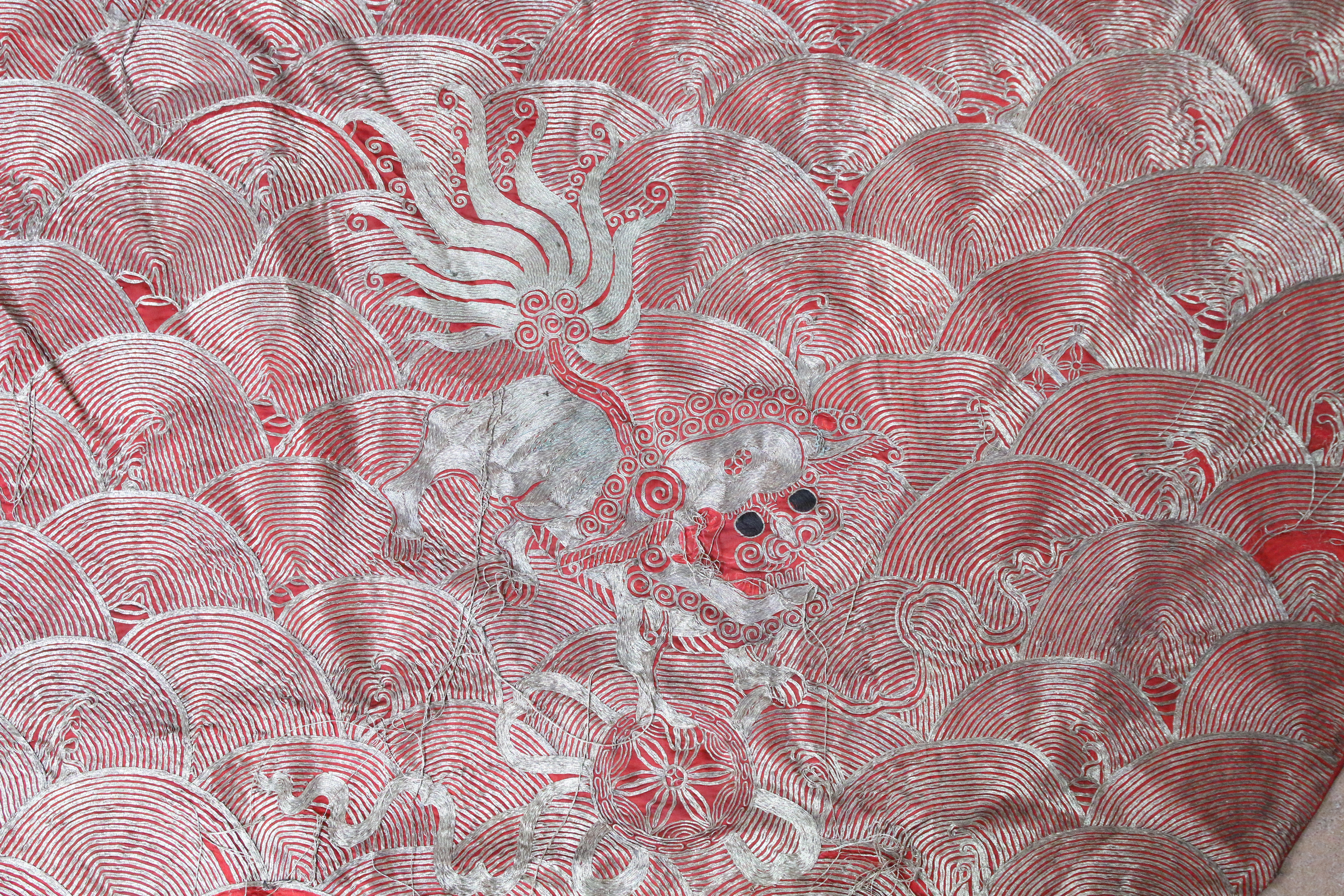Grande PORTIÈRE DE TEMPLE en tissu rouge, à décor brodé aux fils polychromes et dorés de fleurs et dragons parmi des nuages stylisés. Datée 1910.