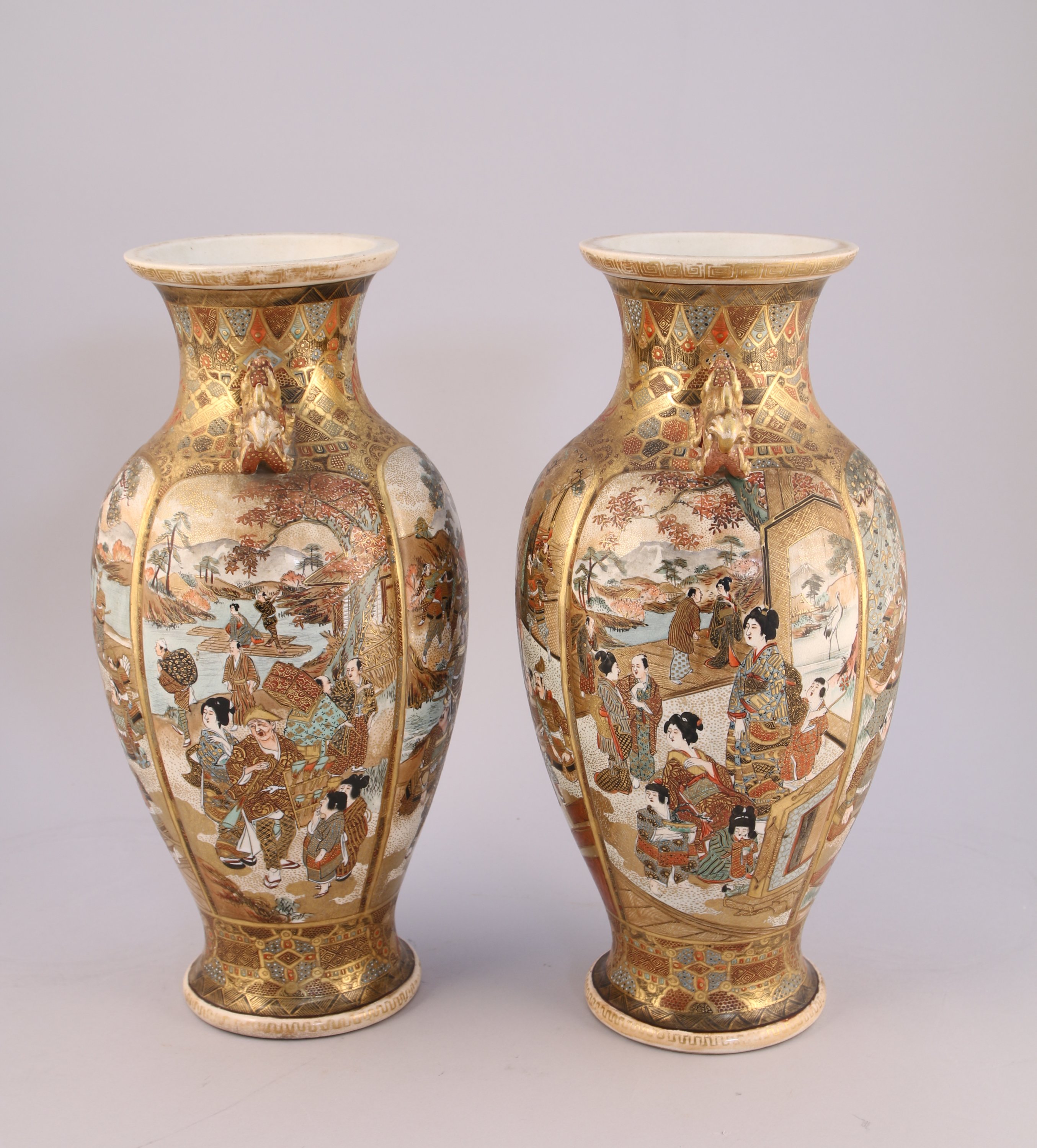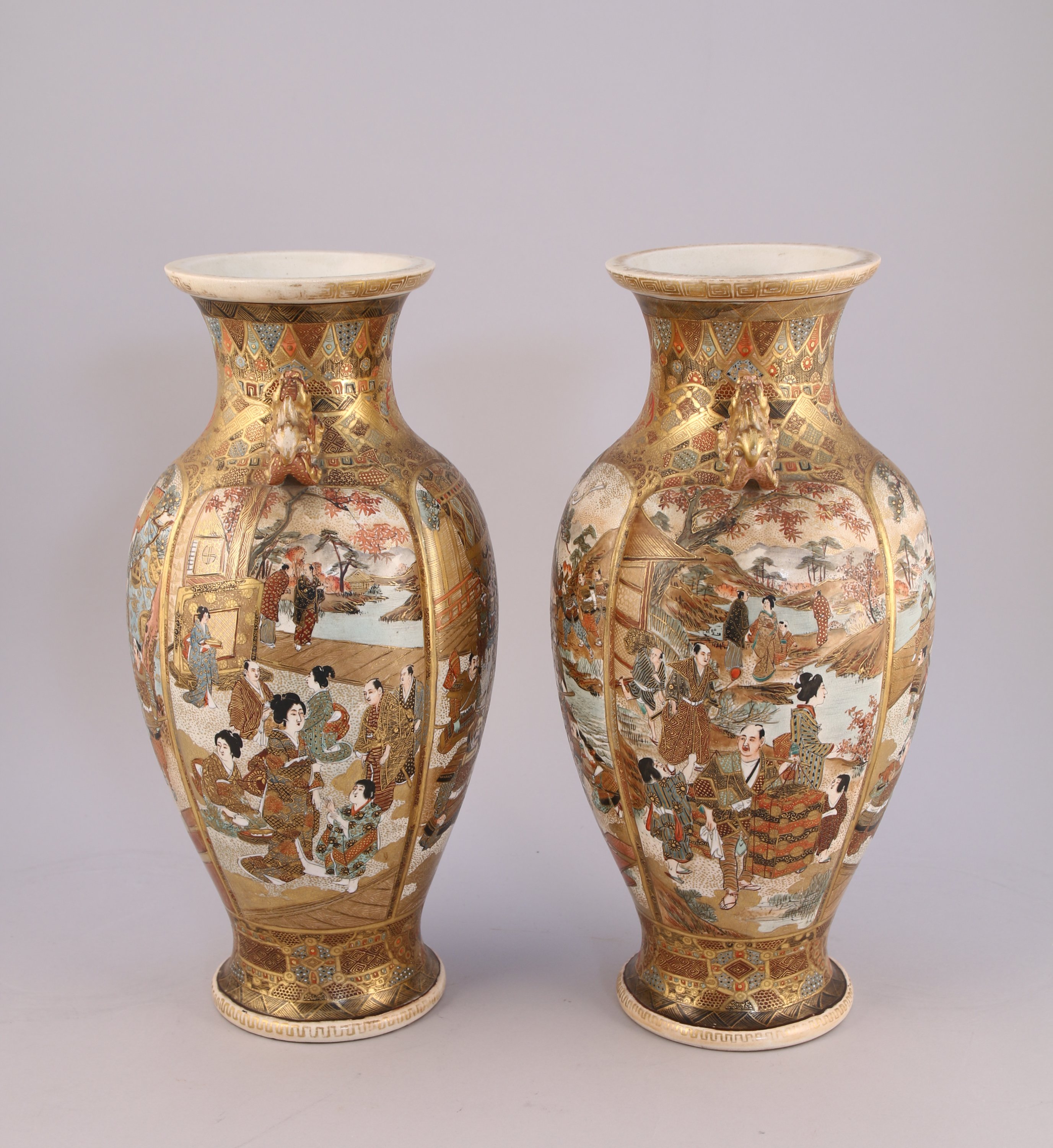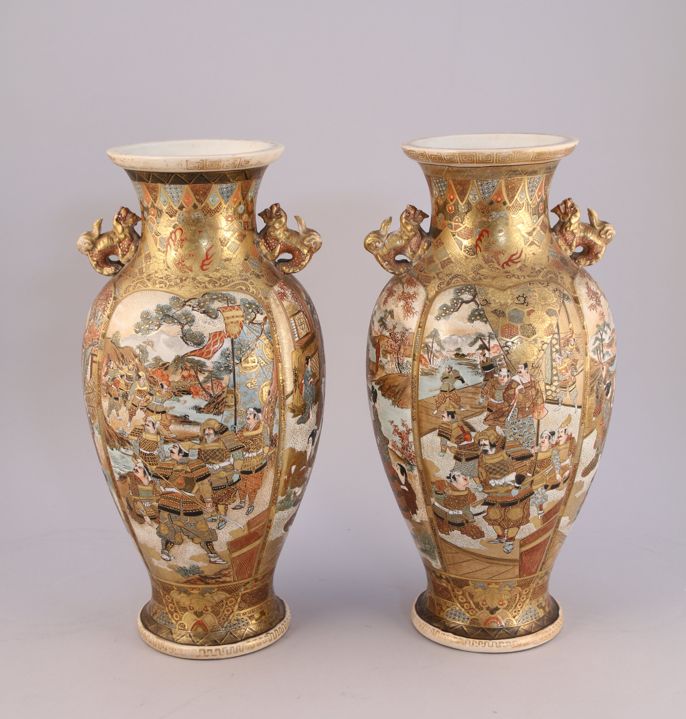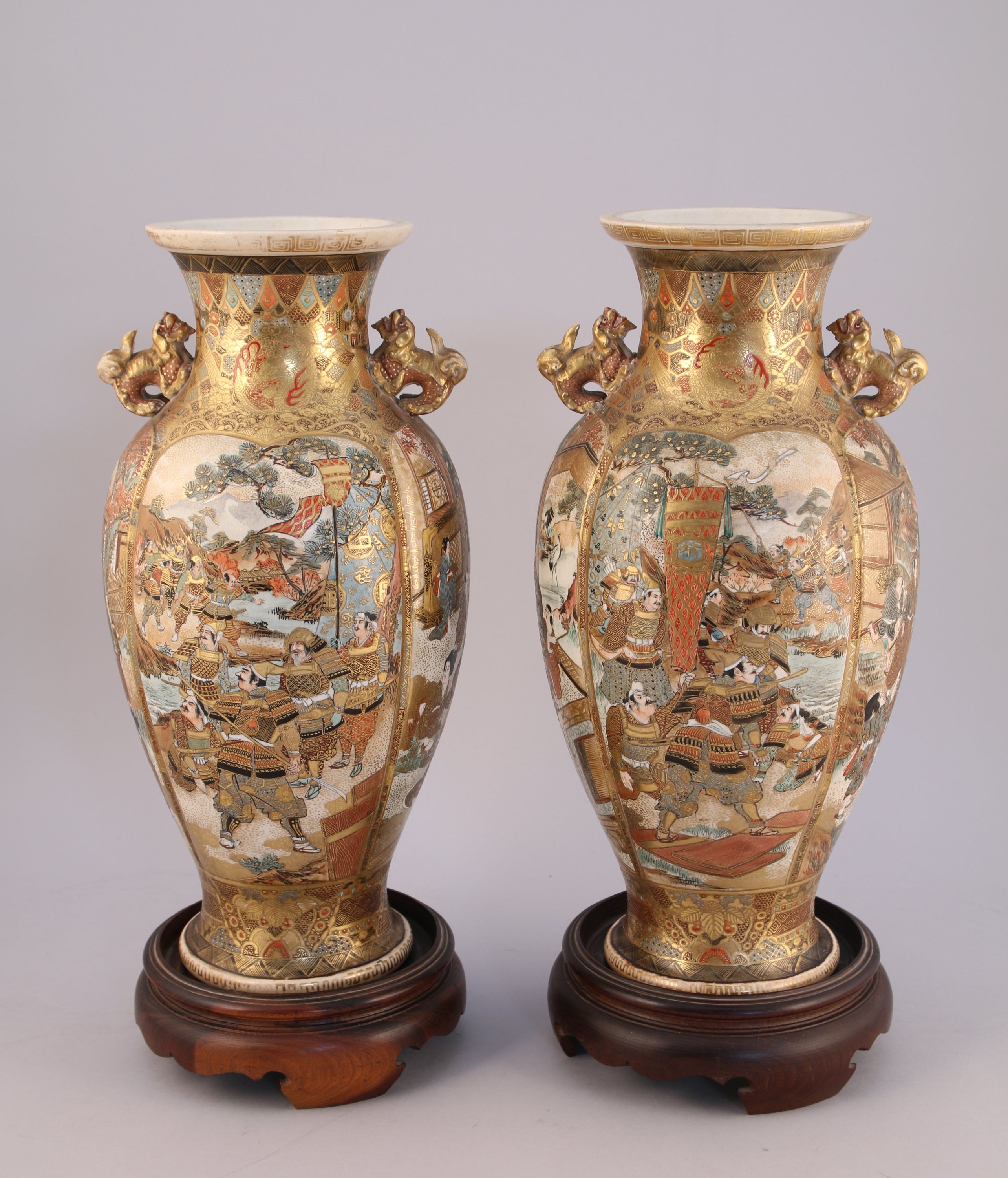 PAIRE DE VASES aux prises en chien de Fo. Chaque vase figure quatre scènes distinctes de batailles et de courtisanes dans un encadrement émaillé or. Marque au revers. Socles en bois.