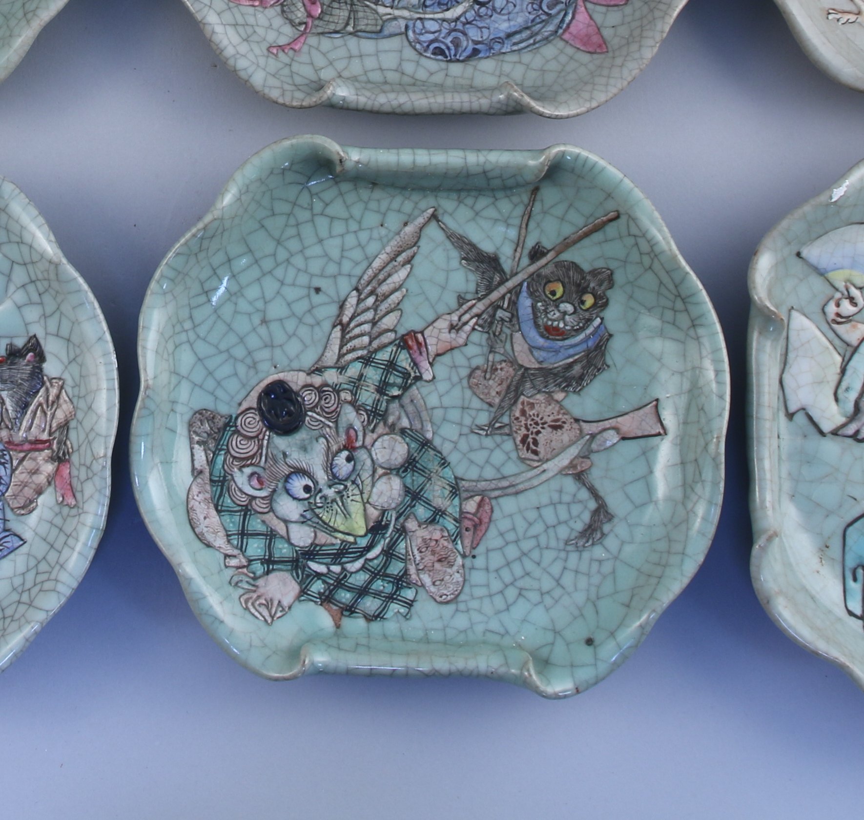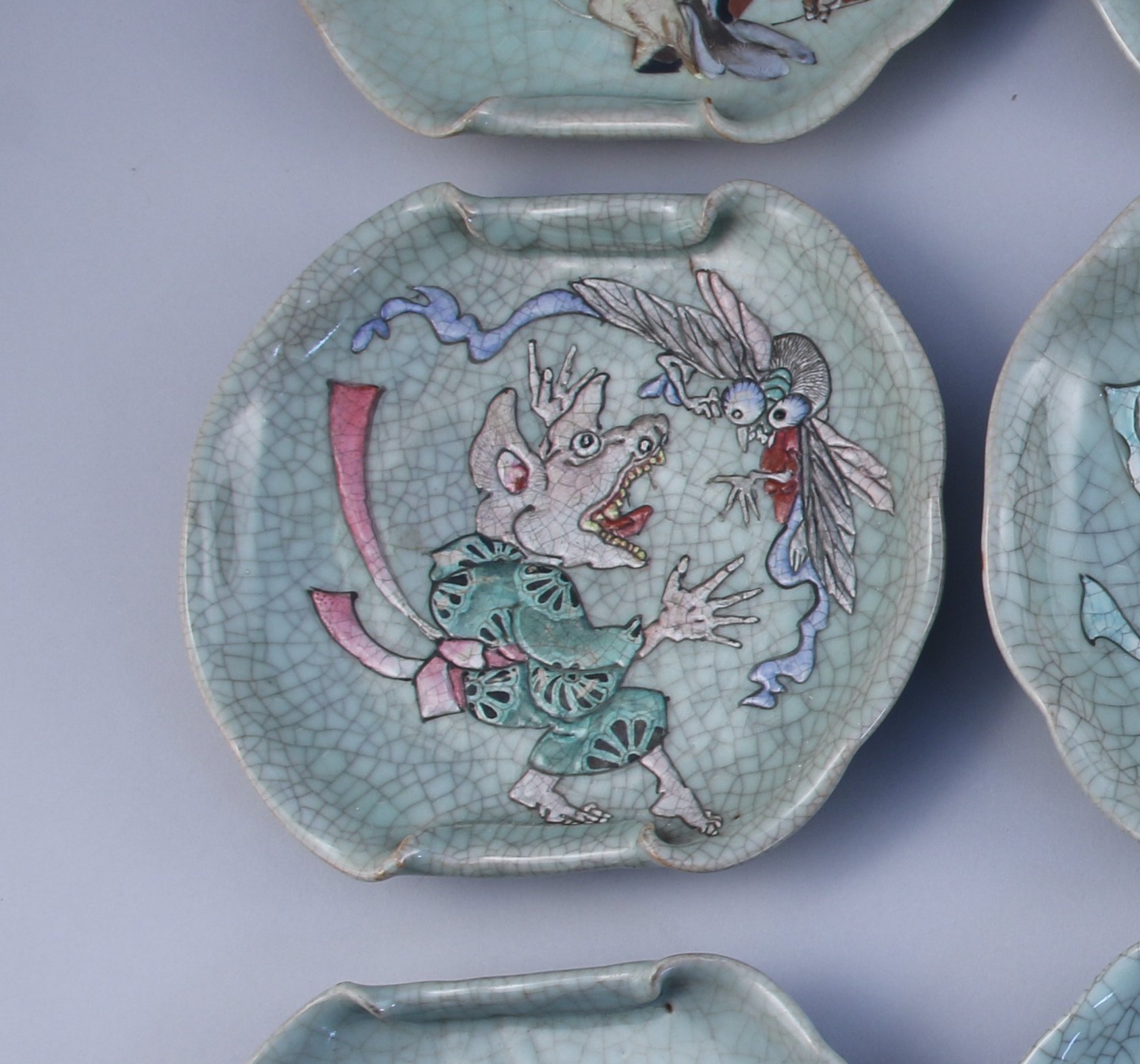 Suite de 12 ASSIETTES en grès à décor polychrome de scènes simiesques en léger relief sur fond vert céladon craquelé.