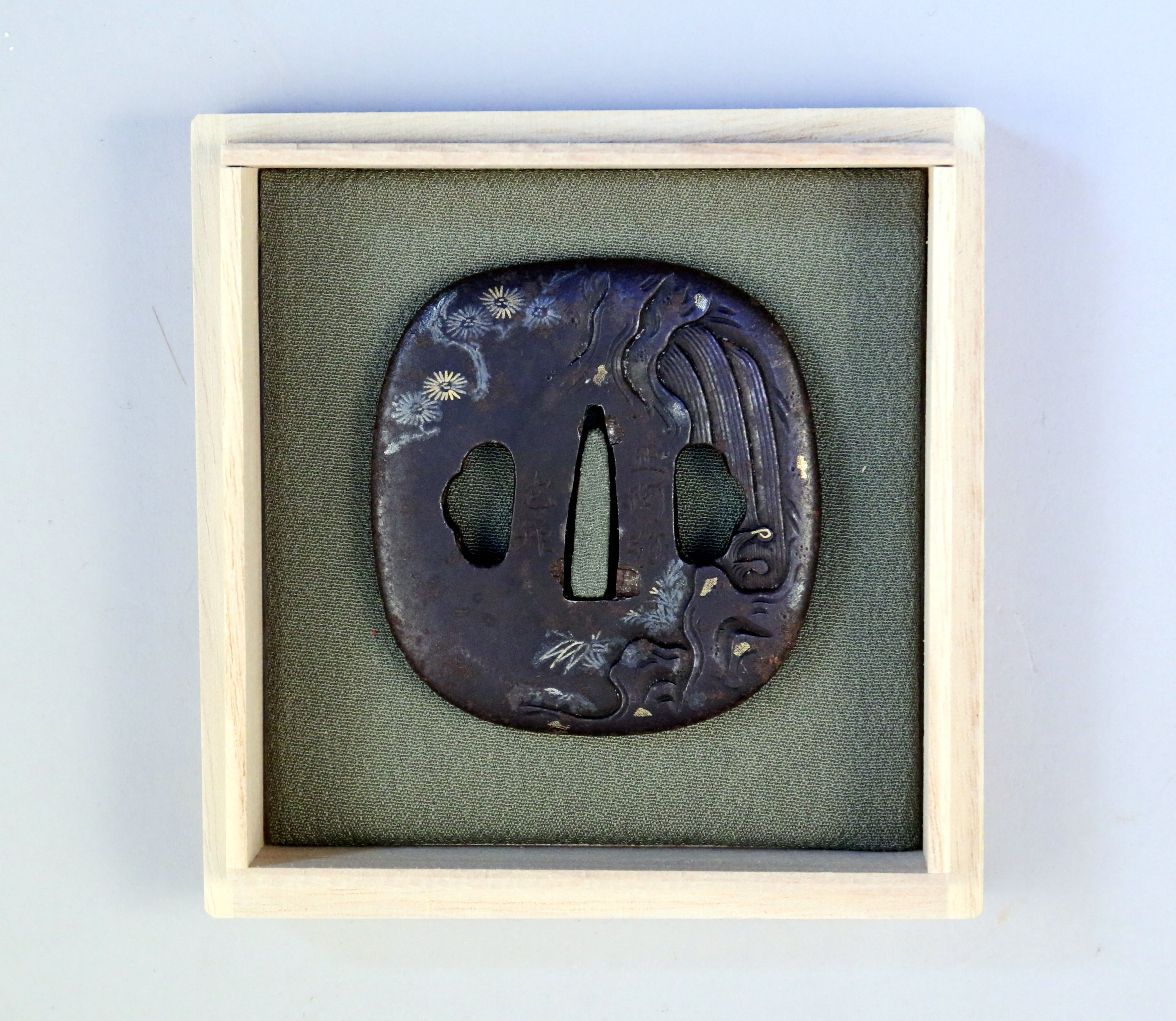 HOKEI GATA en fer à décor incisé et incrusté de shibuichi et cuivre doré d'un pin près d'une cascade.