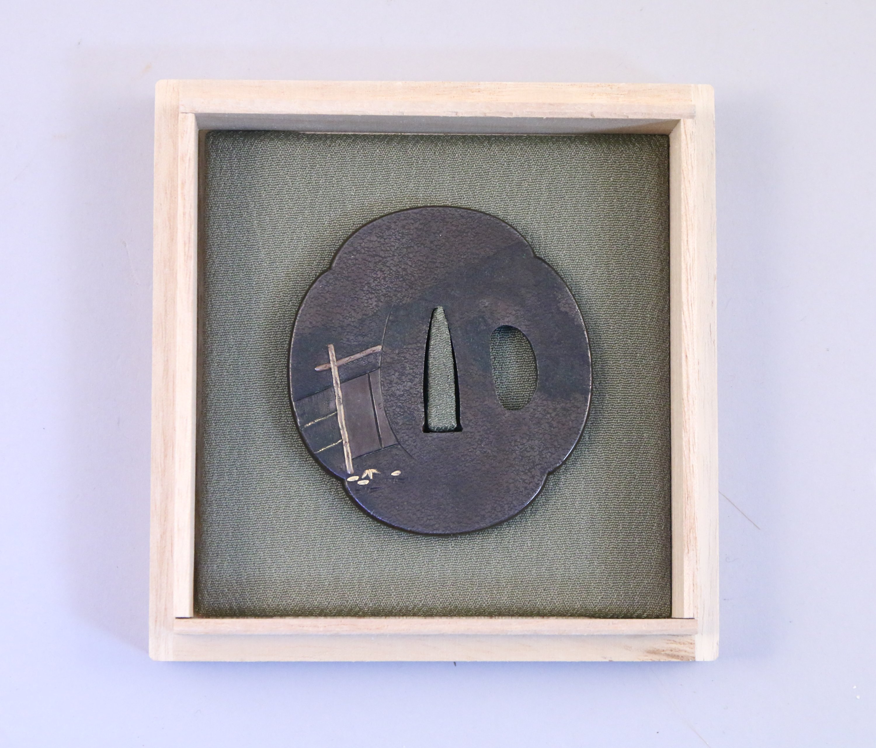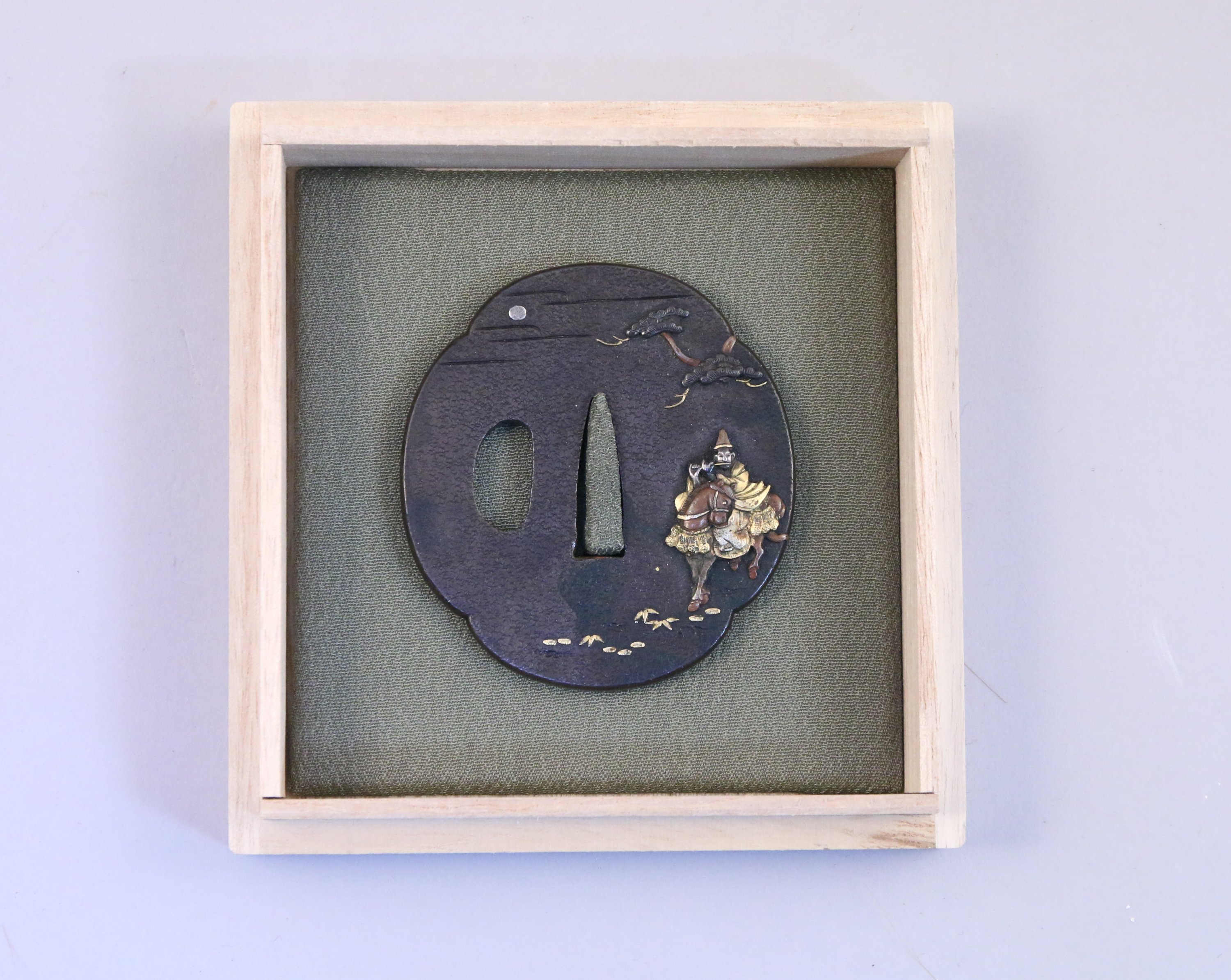MOKKO GATA en shibuichi à décor en incrustation de suaka et cuivre doré, Ariwara no narihira à cheval près d'un pin, jouant de la flûte sous la lune. Non signée.