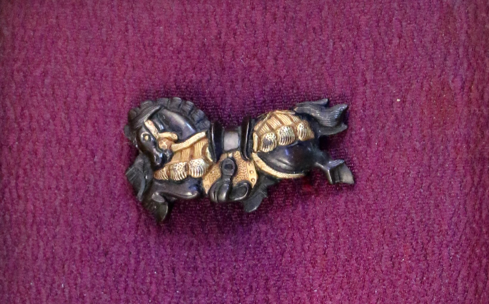Paire de MENUKI en shibuichi et cuivre doré, chevaux parés se cabrant et sautant.