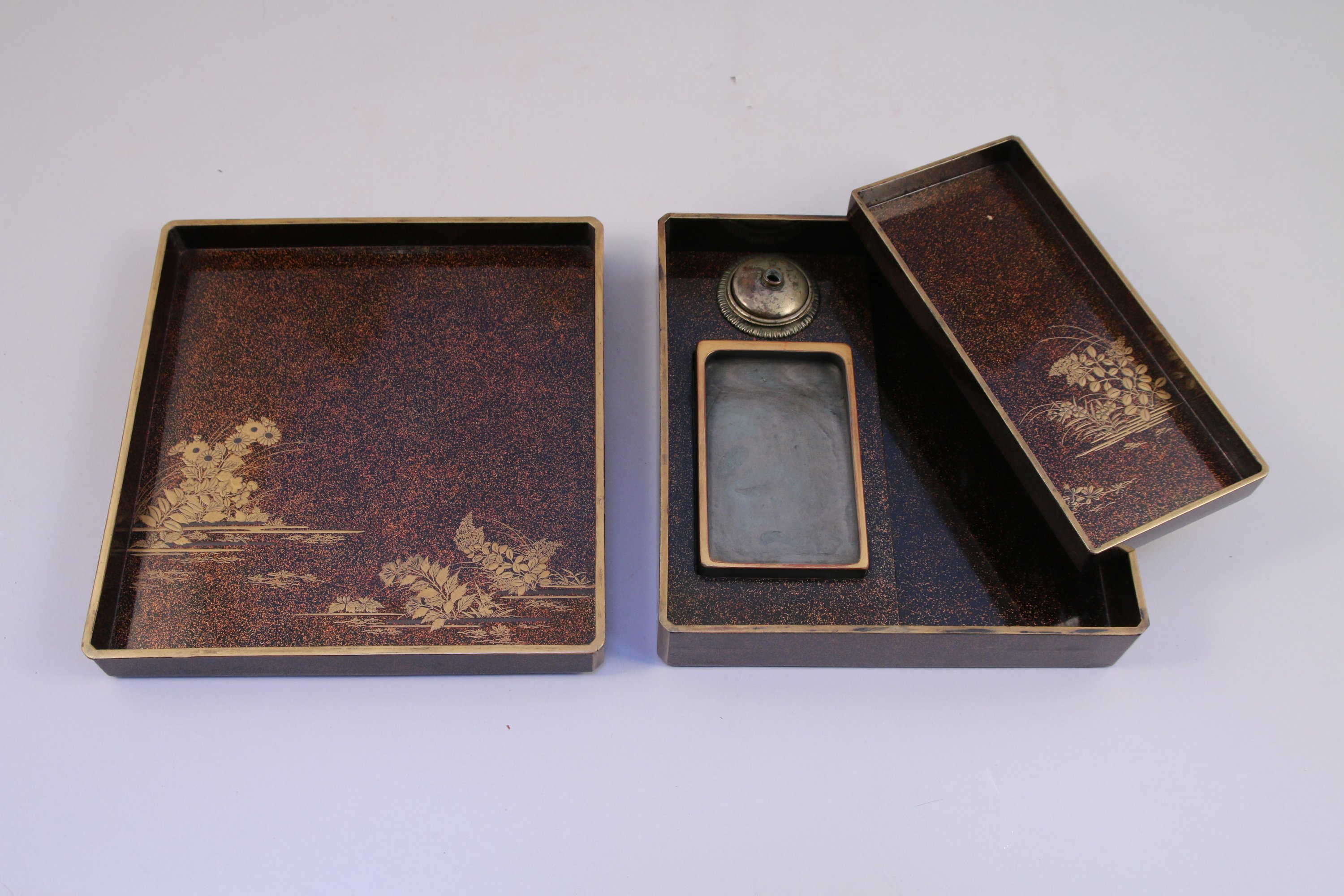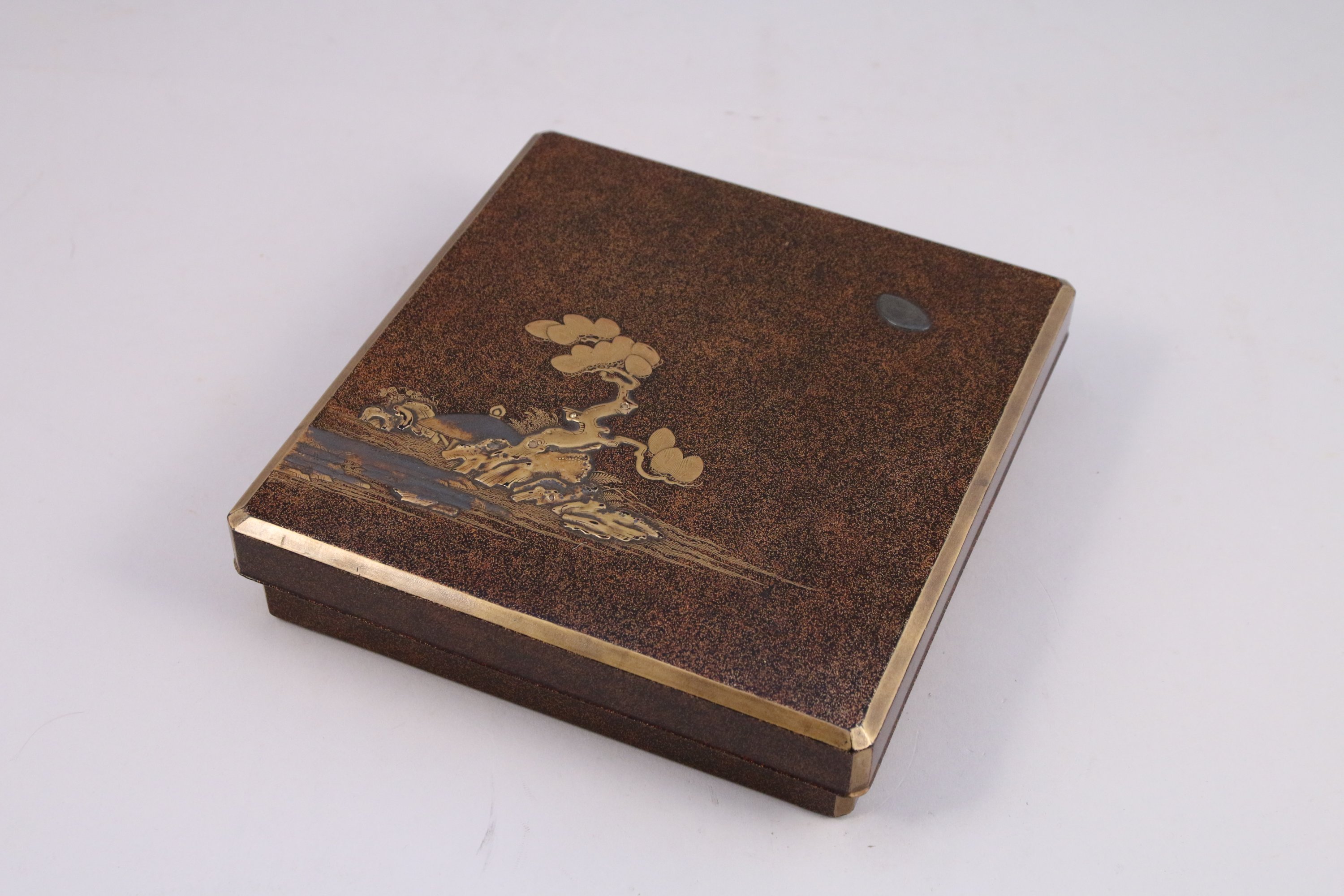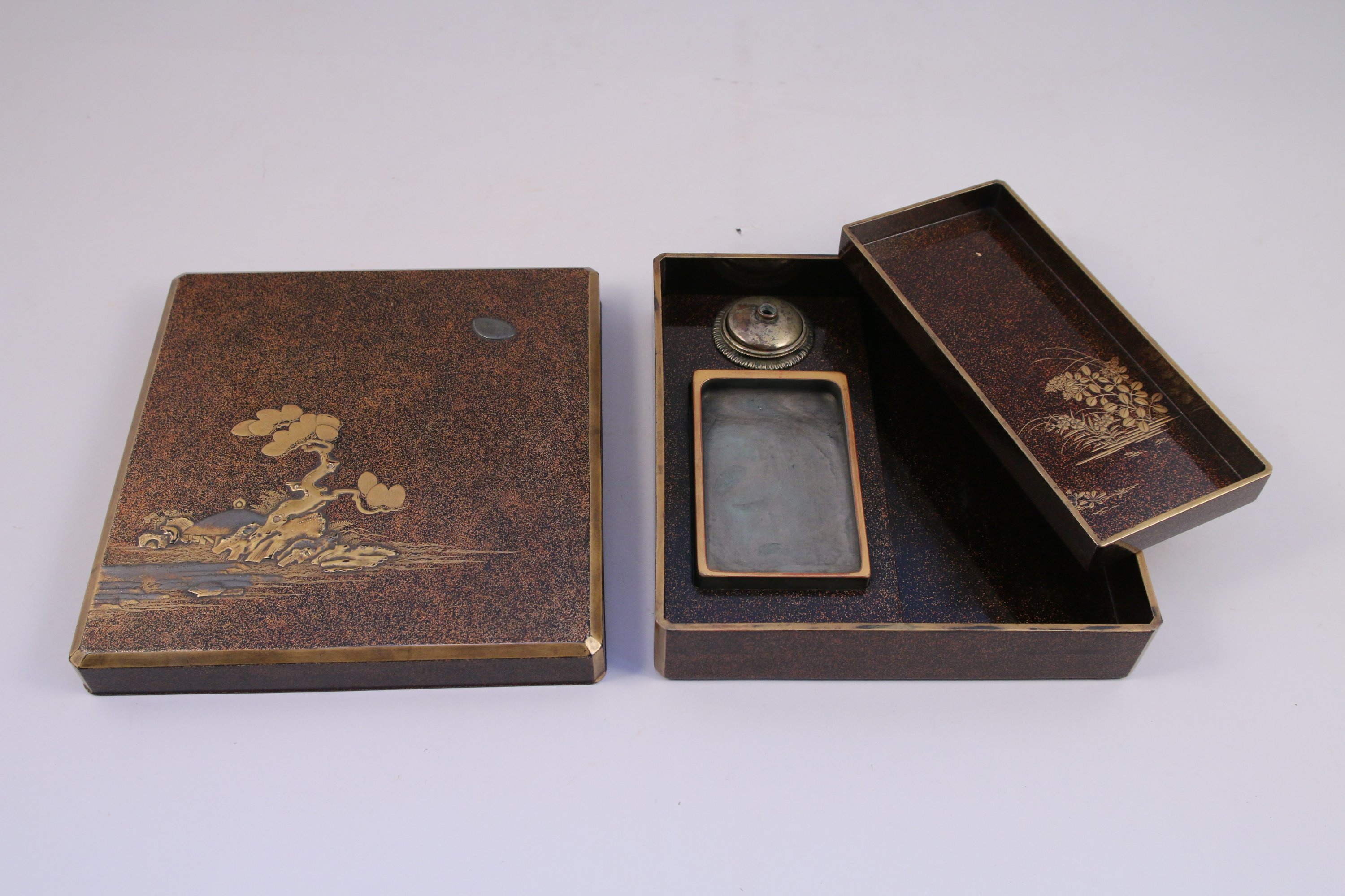SUZURIBAKO en laque nashiji à décor en takamaki-e, kirigane et hiramaki-e de laque or et argent d'un pin noueux sous la lune, l'intérieur orné des fleurs d'automne.