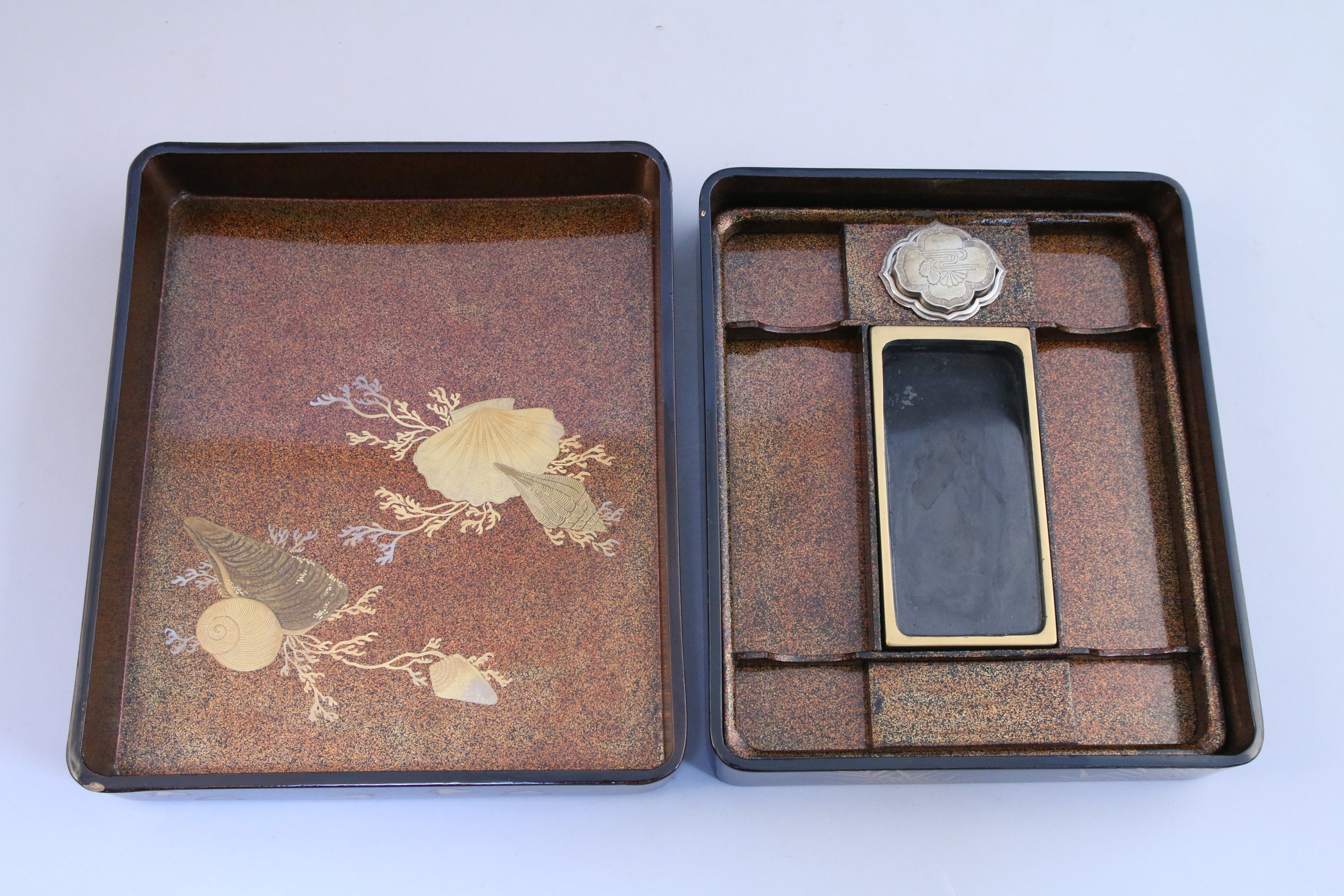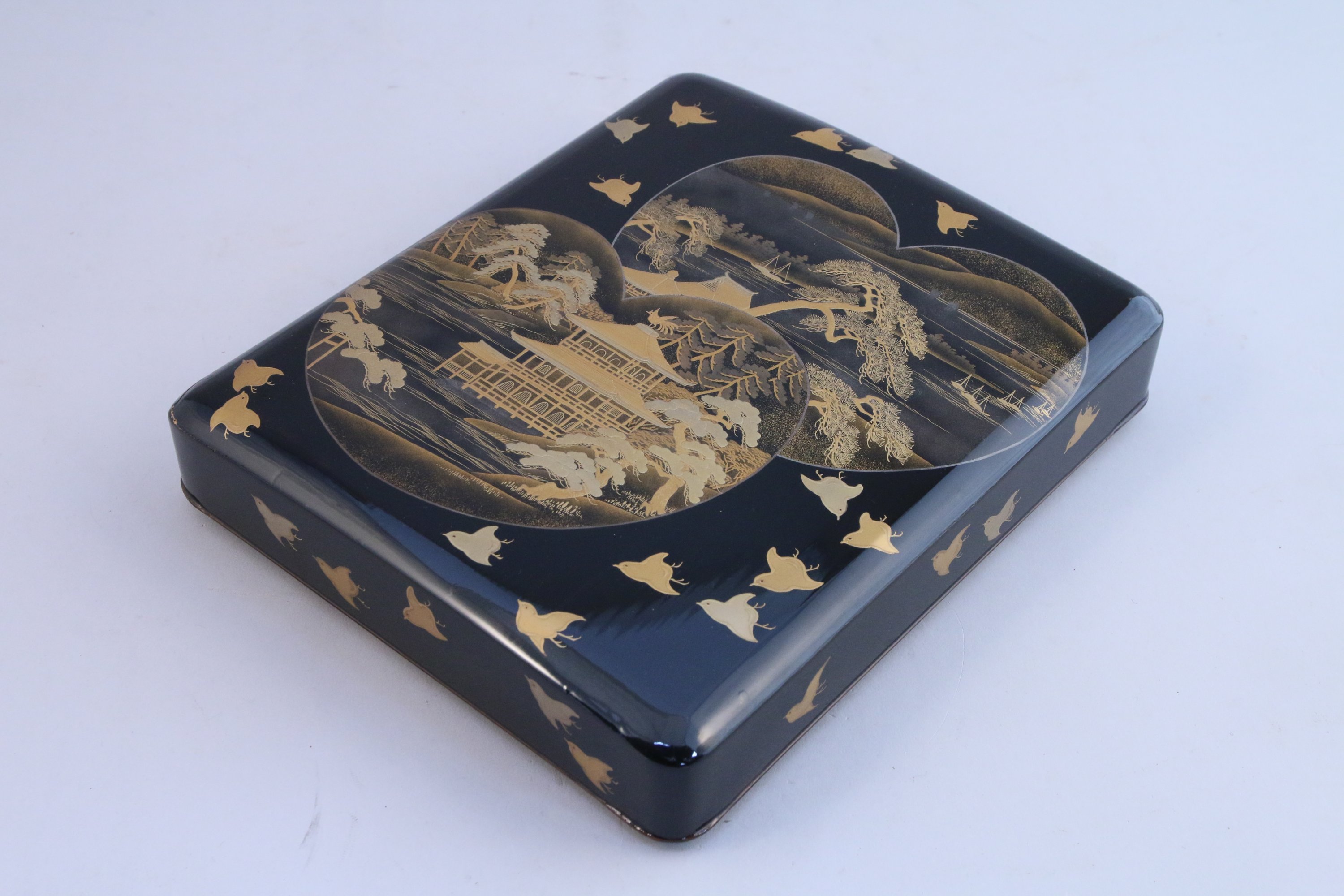 SUZURIBAKO en laque noire à décor en hiramaki-e de laque or et argent de pavillons parmi les pins et de scène de bord de mer dans des réserves, sur fond de motif de chidori. Intérieur en laque nashiji à décor de coquillages.