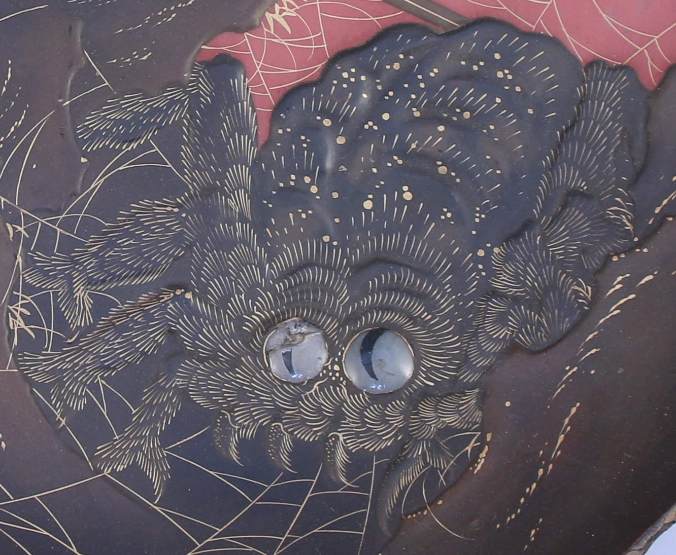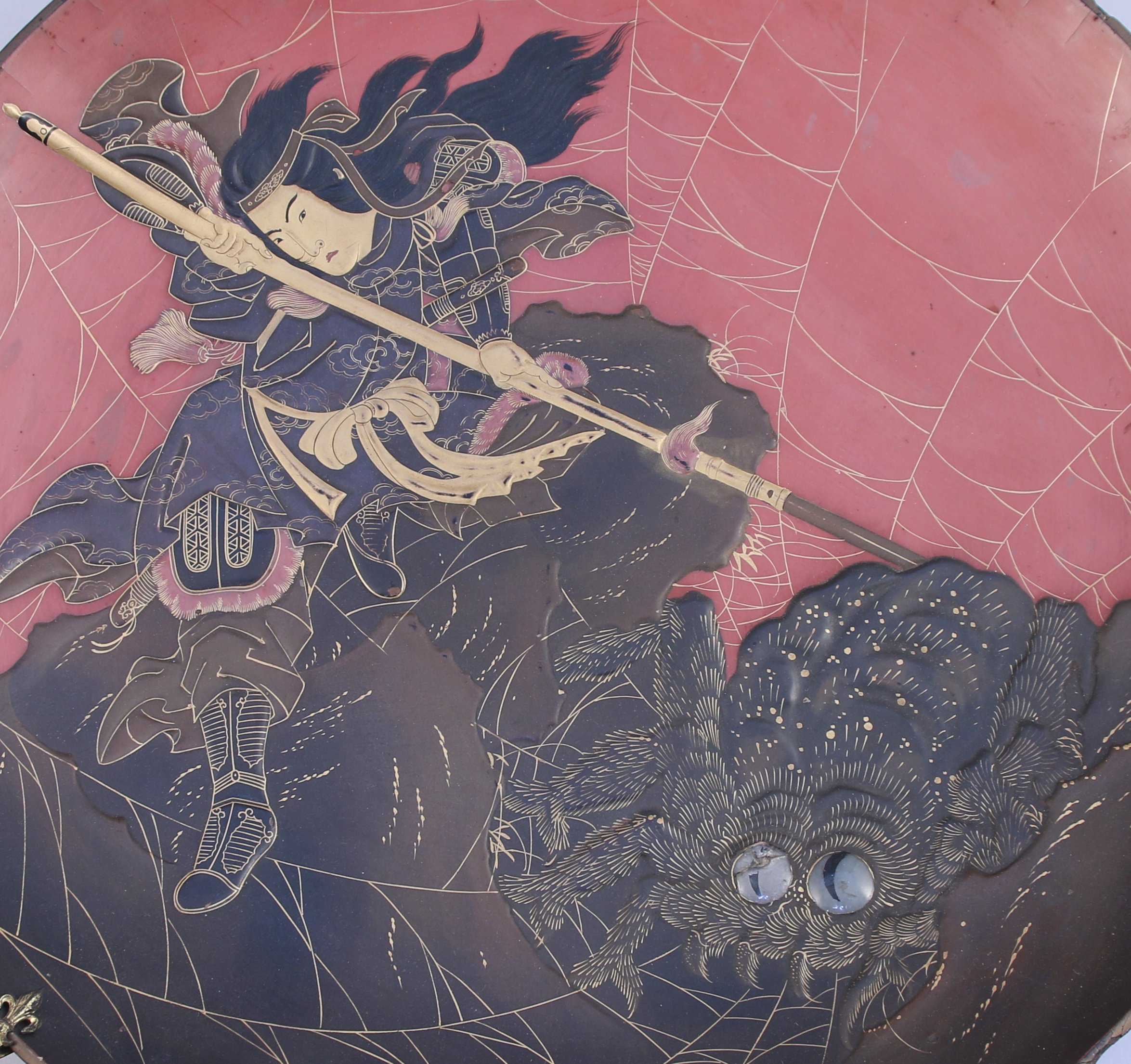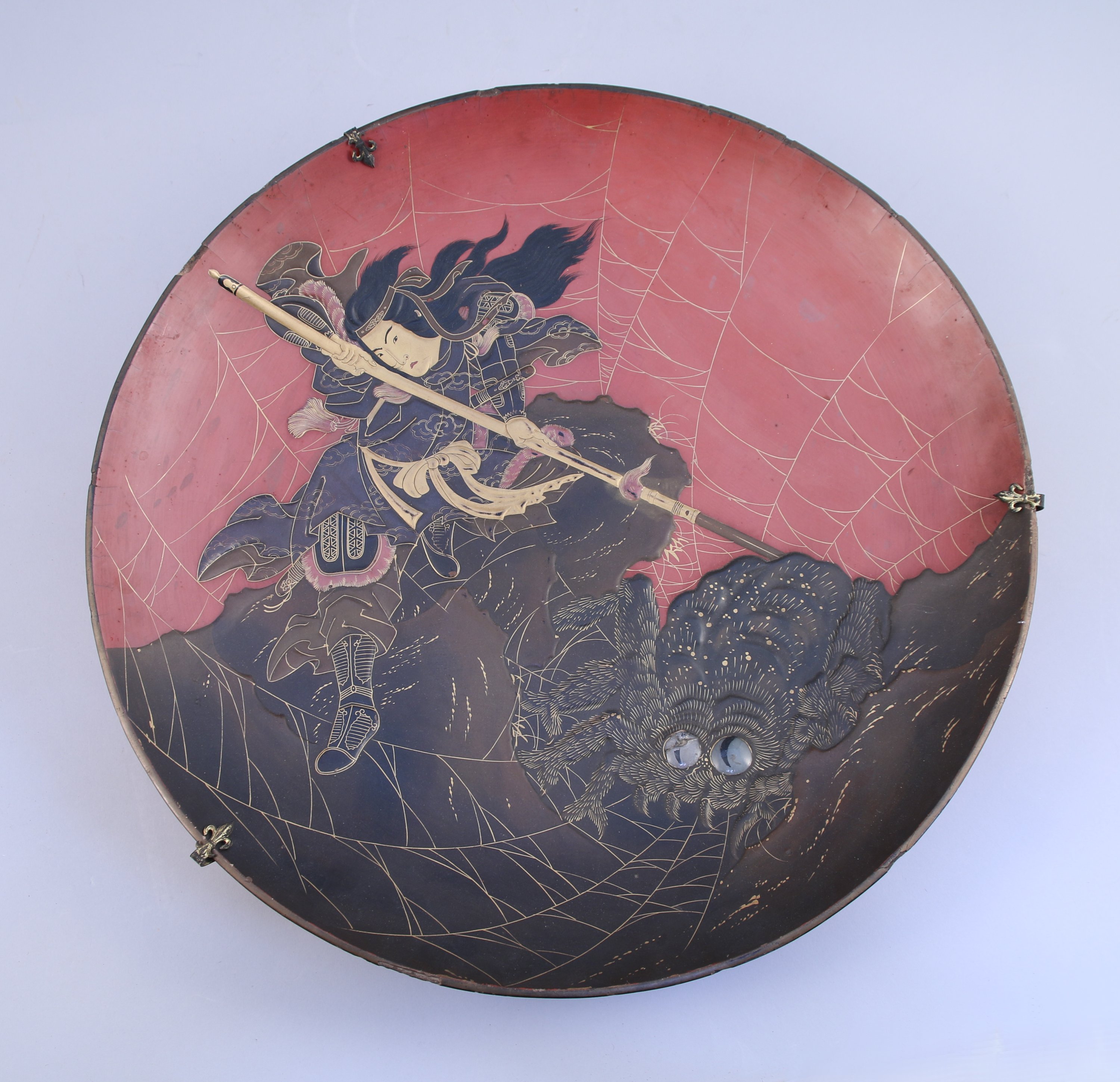 PLAT D'OFFRANDE de forme circulaire à décor laqué d'un chasseur d'araignée géante.
