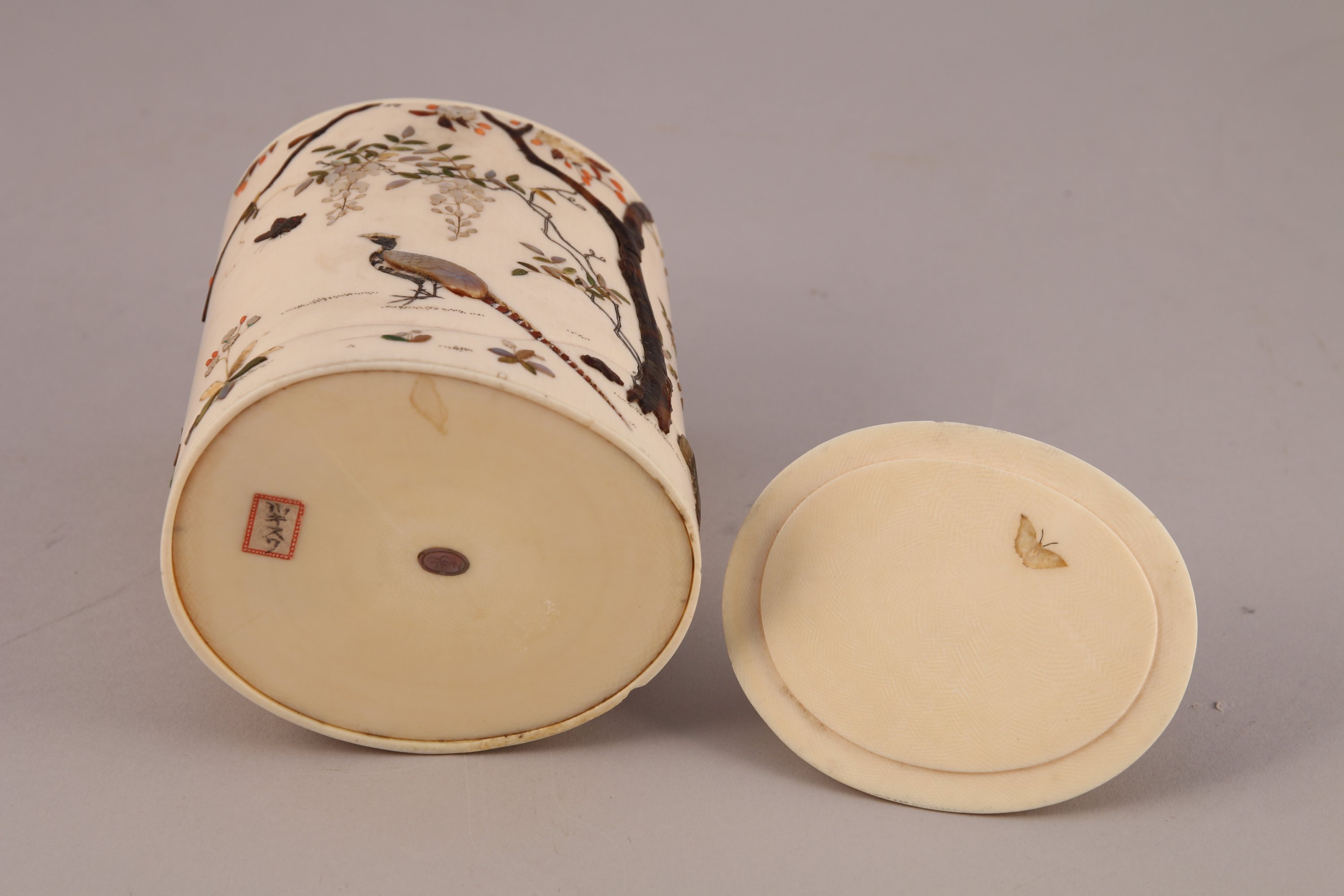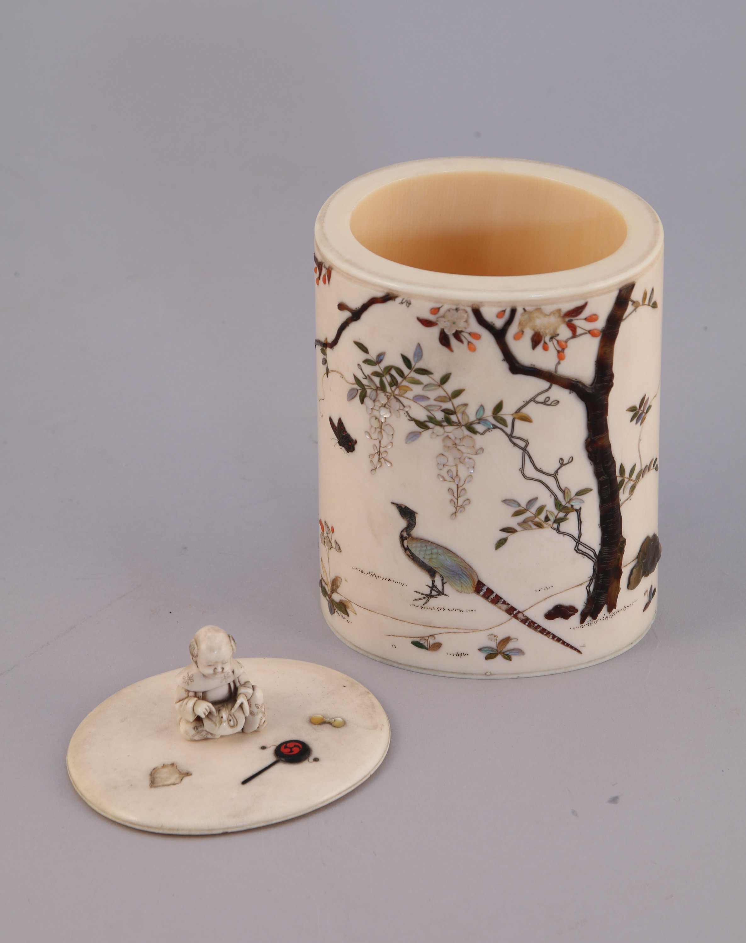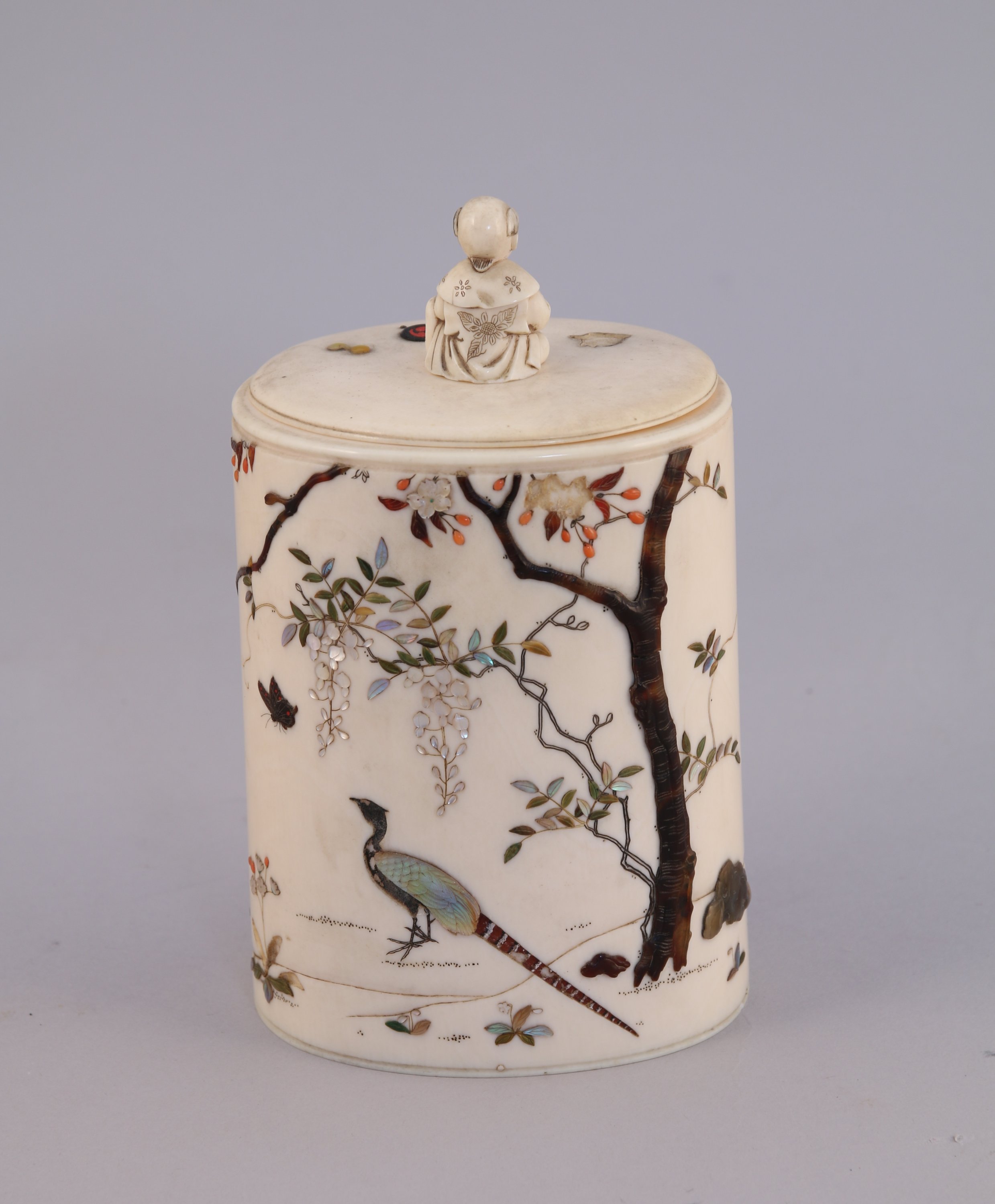 POT COUVERT en ivoire à décor incrusté dit "shibayama" de nacre, corail, ivoire teinté et écaille d'oiseaux, papillons, faisans parmi les glycines, cerisiers en fleurs et chrysanthèmes. La prise du couvercle en forme de karako assis. Signé Yasuyuki.