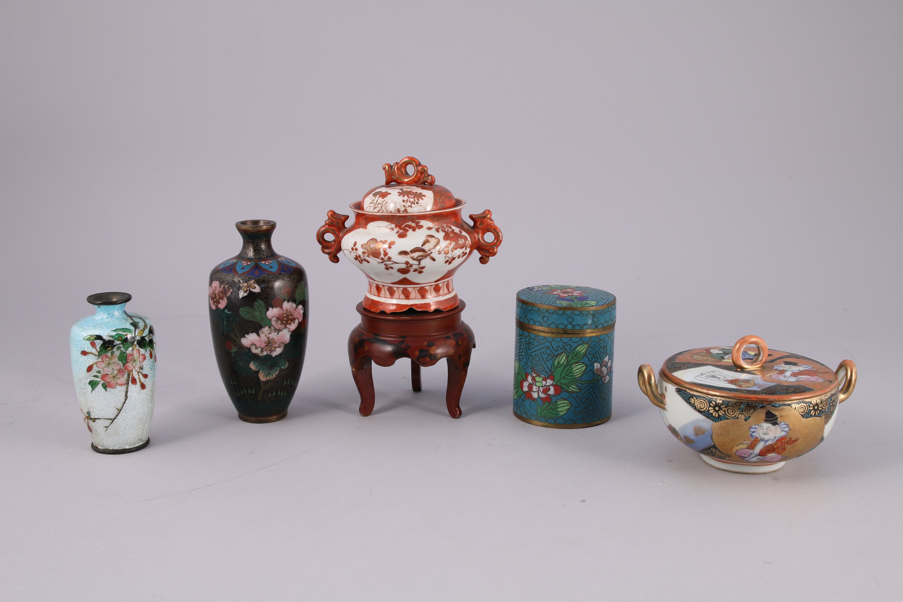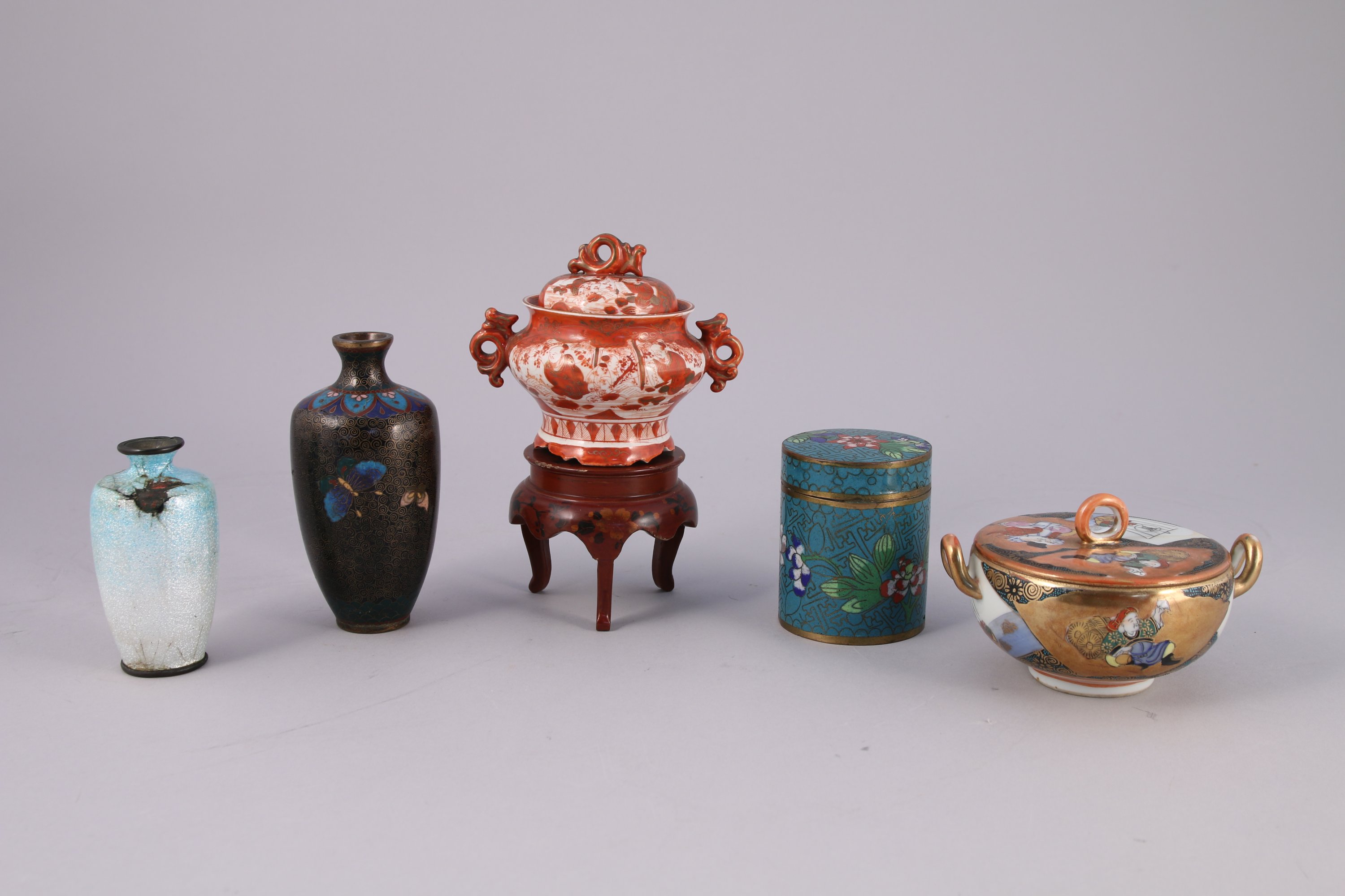 Réunion d'OBJETS DE VITRINE D'EXTRÊME-ORIENT : VASE en émail cloisonné, haut. 12 cm; BOÎTE en émail cloisonné, haut. 7,5 cm; VASE émaillé, haut. 9 cm; DEUX POTS COUVERTS en porcelaine, haut. 9 et 6 cm; 6 POUPÉES japonaises; SELLETTE en bois laqué, haut. 7 cm.