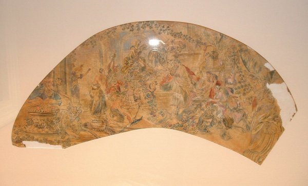 Projet d'éventail, milieu du XVIIIe. Feuille de calque. Encre, aquarelle et rehauts de gouache. Dans le palais de Jupiter, Bacchus et son cortège de muses enivrent Vulcain qui finit par délivrer sa prisonnière. Cadre moderne.