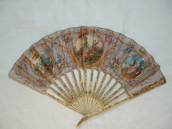 Monture en ivoire, repercée et peinte. Personnages, urnes et fleurs. Panaches doublés de burgau.