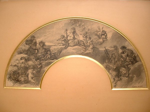 Projet d'éventail signé Célestin Nanteuil (1813-1873). Dessin au crayon noir sur papier, illustrant le ciel olympien, avec Vénus au miroir, Bacchus en train de s'enivrer et Phébus jouant de la flûte avec deux muses.