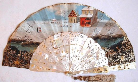 Eventail plié double-face, vers 1840-1850. Chromolithographie rehaussée de gouache. Belle scène de divertissements à la campagne, dans le style du XVIIIe. Une jeune femme en compagnie d'un Pierrot inspiré du Gilles de Watteau. Cupidon lance une flèche. Deux couples de jeunes femmes lisent, un joueur de guitare à leurs côtés. Revers peint à la gouache d'enfants jouant dans la neige.