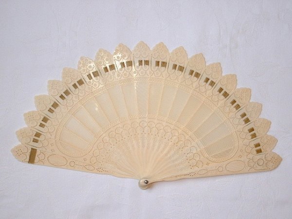 Eventail brisé en os, milieu du XIXe. Très finement repercé en croisillons dans la partie centrale, de façon à voir au travers. Ruban doré.