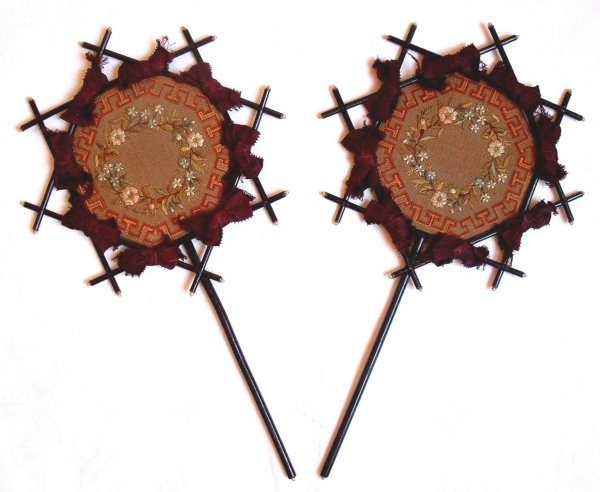Paire d'écrans Napoléon III. La face brodée de fleurs. L'encadrement, en croisillons de bois terminés par des perles et décorés de nuds de satin bordeaux. Au dos, un satin rouge uni.