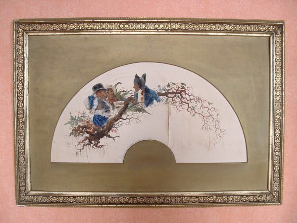 Projet d'éventail signée G. Campi (1846-1921), Milano. Feuille en satin peinte à la gouache. Quatre personnages, dont une femme portant un éventail, dans le style du XVIIIe finissant.