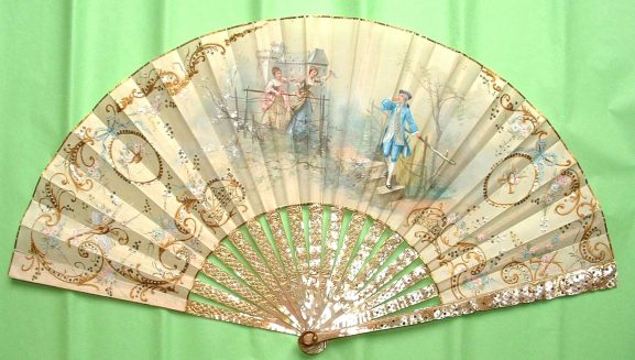 Eventail plié, vers 1890. Feuille en soie. Aquarelle rehaussée de gouache. Rendez-vous galant, dans le style du XVIIIe. Un château à l'arrière-plan. En médaillons, un panier de fleurs et des instruments de musique. Signée Contrevert. Paillettes cousues.