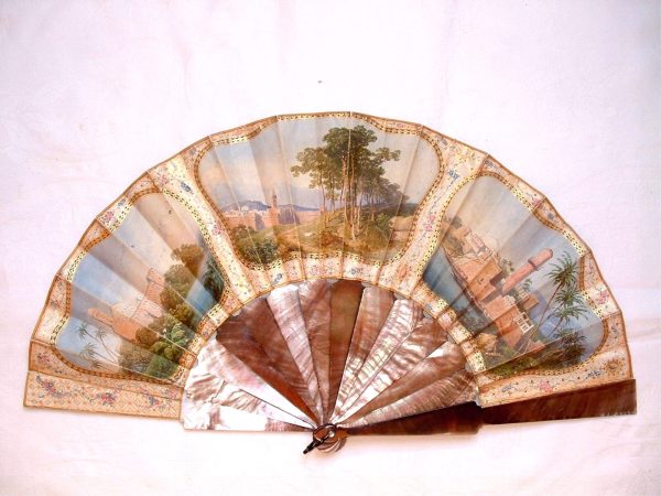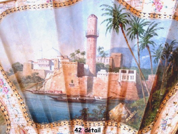 Eventail orientaliste, fin XIXe. Feuille peinte à l'aquarelle de trois cartouches. Au centre, une cité fortifiée dans les collines, avec minaret et mosquées. De chaque côté, une cité au bord du Nil, l'une avec un palais, l'autre bordée de palmiers, avec ses felouques. Les cartouches encadrés de fleurs et de peinture dorée façon paillettes. Peinture signée Marhon.