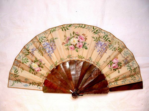 Au revers, feuille en soie peinte de fleurs, dont des roses très fines aux couleurs fraîches. Peinture signée Maria Loustan.